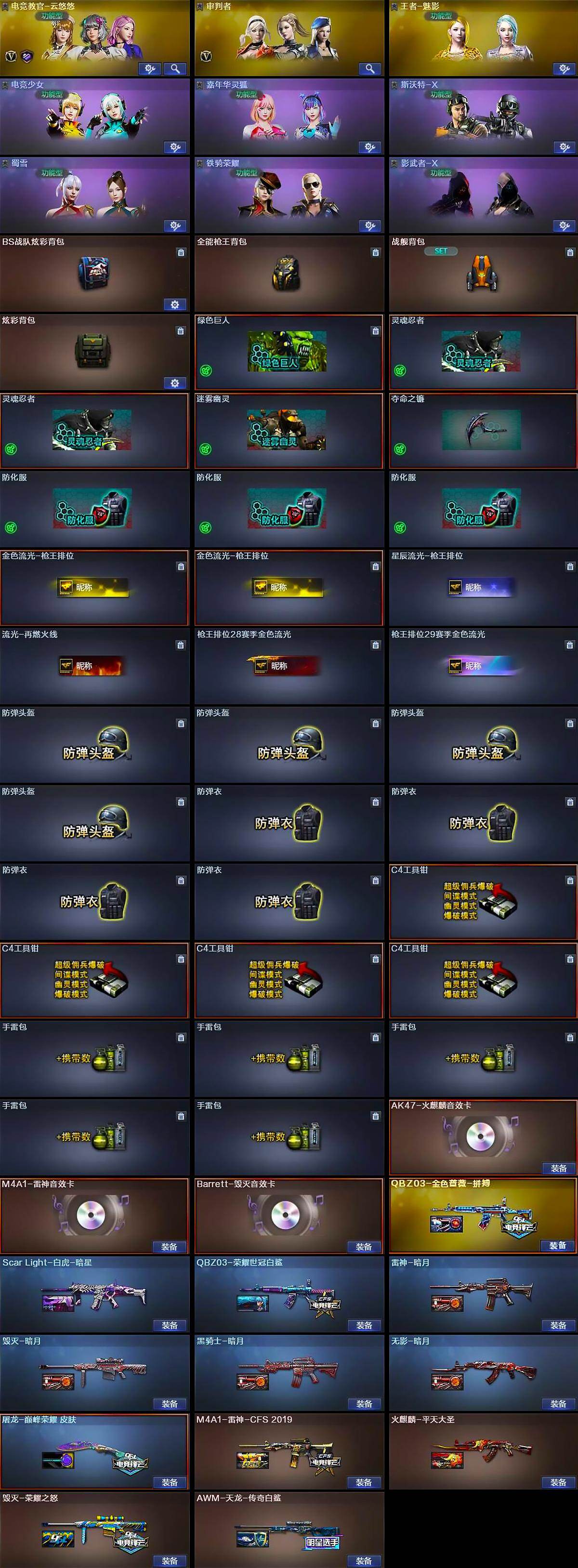 【皮肤】:Scar Light-白虎-暗星,QBZ03-荣耀世冠白鲨,QBZ03-金色蔷薇-拼搏,雷神-暗月,M4A1-雷神-CFS 2019,火麒麟-平天大圣,毁灭-暗月,毁灭-荣耀之怒,黑骑士-暗月,无影-暗月,AWM-天龙-传奇白鲨,屠龙-巅峰荣耀 皮肤