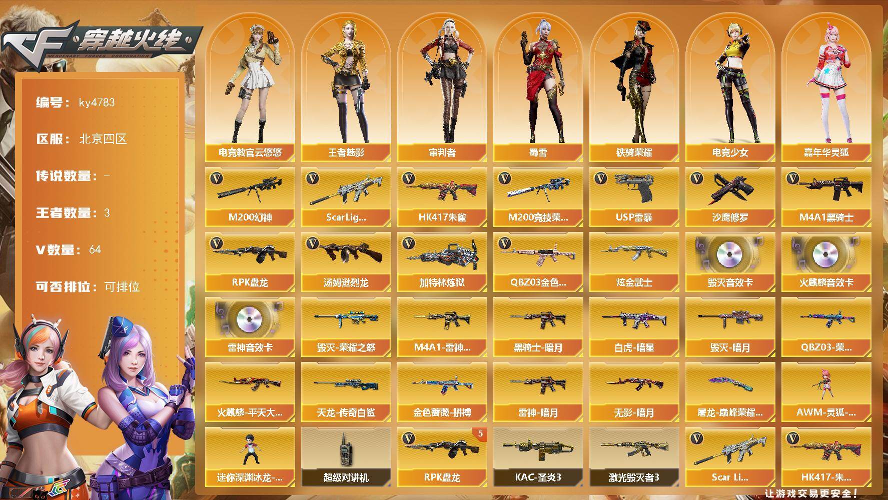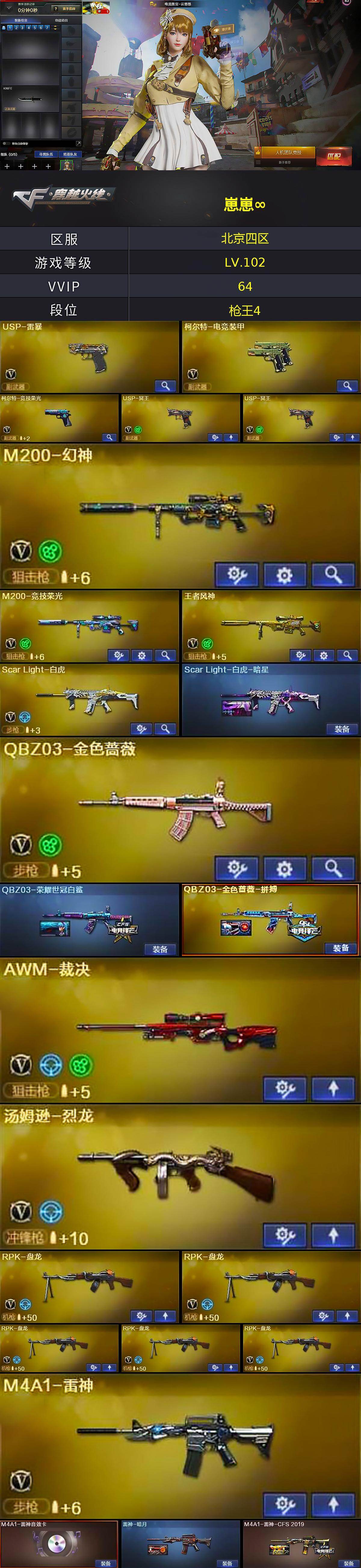 [15678611]北京四区-64V-3王者-1炫金 【热门武器】:QBZ03-金色蔷薇,Scar Light-白虎,HK417-朱雀,M200-幻神,M200-竞技荣光,M4A1-黑骑士*2,汤姆逊-烈龙,RPK-盘龙*5,加特林-炼狱*2,USP-雷暴,沙鹰-修罗*2 【王者炫金武器】:炫金武士 【音效卡】:AK47-火麒麟音效卡,M4A1-雷神音效卡,Barrett-毁灭音效卡 【皮肤】:Scar Light-白虎-暗星,QBZ03-荣耀世冠白鲨,QBZ03-金色蔷薇-拼搏,雷神-暗月,M4A1-雷神-CFS 2019,火麒麟-平天大圣,毁灭-暗月,毁灭-荣耀之怒,黑骑士-暗月,无影-暗月,AWM-天龙-传奇白鲨,屠龙-巅峰荣耀 皮肤 【角色】:电竞教官-云悠悠,审判者,王者-魅影,电竞少女,嘉年华灵狐,斯沃特-X,蜀雪,铁骑荣耀,影武者-X 【人偶武器】:AWM-灵狐-15周年嘉年华,迷你深渊冰龙-王绿豆 【暴走生化】:超级对讲机 【挑战大师】:激光毁灭者III,KAC-圣炎切割者III 【英雄级武器】:AK47-火麒麟*2,M4A1-雷神,M4A1-黑骑士*2,AK47-无影,M4A1-死神,M4A1-武圣,HK417-朱雀,Scar Light-白虎,无影-神兵利器,M4A1-玫瑰精灵,QBZ03-金色蔷薇,王者之心-觉醒版,王者之势-觉醒版,AWM-天龙*2,Barrett-毁灭*2,AWM-裁决,M200-幻神,M200-竞技荣光,王者风神-觉醒版,RPK-盘龙*5,加特林-炼狱*2,汤姆逊-烈龙,沙鹰-修罗*2,沙鹰-天神*2,USP-雷暴,柯尔特-电竞装甲,柯尔特-竞技荣光,USP-冥王*2,屠龙*3,龙啸,擎天,麒麟刺,擎天-竞技荣光,斩神刀-雷暴,丛林匕首-玄豹,高爆手雷-雷暴,高爆手雷-竞技荣光*3,闪光弹-雷暴,闪光弹-竞技荣光*3,烟雾弹-雷暴,烟雾弹-竞技荣光*3 【道具】:BS战队炫彩背包,全能枪王背包,战舰背包,炫彩背包,哔哩哔哩名片,绿色巨人,灵魂忍者*2,迷雾幽灵,夺命之镰,防化服*3,金色流光-枪王排位*2,星辰流光-枪王排位,流光-再燃火线,枪王排位28赛季金色流光,枪王排位29赛季金色流光,防弹头盔*4,防弹衣*4,C4工具钳*4,手雷包*5 【特殊枪械】:1白虎,2黑骑士,1烈龙,5盘龙,2炼狱