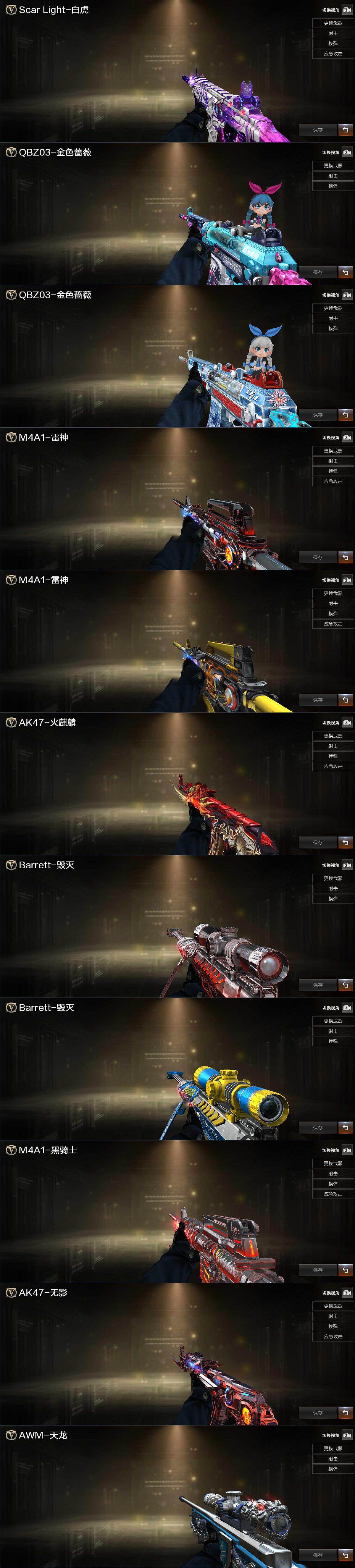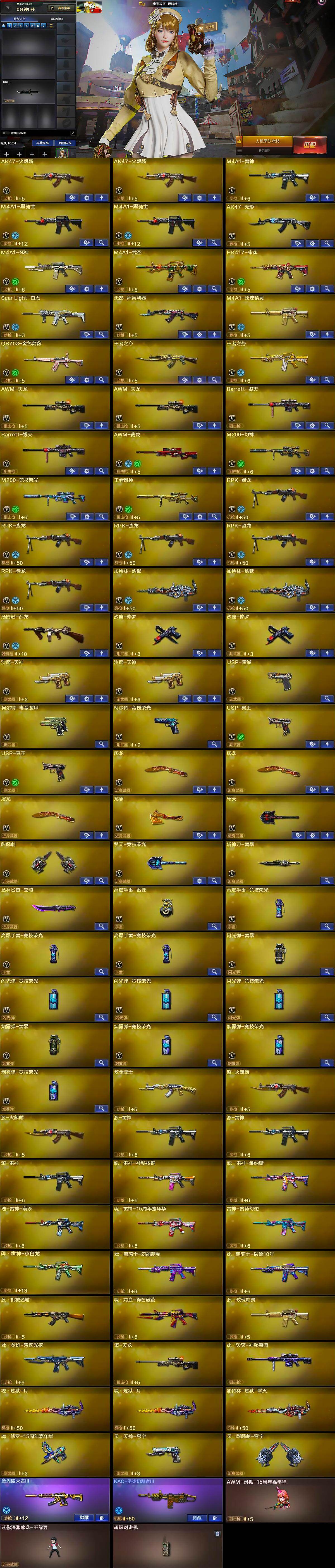 【热门武器】:QBZ03-金色蔷薇,Scar Light-白虎,HK417-朱雀,M200-幻神,M200-竞技荣光,M4A1-黑骑士*2,汤姆逊-烈龙,RPK-盘龙*5,加特林-炼狱*2,USP-雷暴,沙鹰-修罗*2
