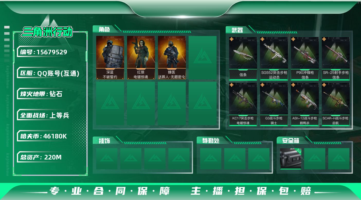 [15679529]【店主推荐捡漏号!可直接换绑】46180k哈伏币-201m流动资产-60烽火等级-钻石-27战场等级-上等兵 【干员外观】:蜂医-送葬人·无题密令,深蓝-不破誓约,红狼-电锯惊魂 【近战皮肤】:近战-信条,近战-黑鹰 【传说外观】:M4A1突击步枪-蚀金玫瑰,M4A1突击步枪-阿米娅,ASh-12战斗步枪-鹅鸭杀,SG552突击步枪-运动员,AK-12突击步枪-特斯拉线圈,SCAR-H战斗步枪-启航,G3战斗步枪-骑士,CAR-15突击步枪-阿米娅,腾龙突击步枪-捞点薯条,KC17突击步枪-电锯惊魂,P90冲锋枪-信条,UZI冲锋枪-特斯拉线圈,SR-3M紧凑突击步枪-特斯拉线圈,勇士冲锋枪-能天使-午夜邮差,QCQ171冲锋枪-鹅鸭杀,725双管霰弹枪-送葬人-无题密令,M250通用机枪-骑士之心,QJB201轻机枪-鹅鸭杀,SR-25射手步枪-信条,R93狙击步枪-维什戴尔,AWM狙击步枪-捞点薯条,93R-捞点薯条,复合弓-黑·天际线 【史诗外观】:ASh-12战斗步枪-无极限,M16A4突击步枪-竞赛选手,AUG突击步枪-蝮蛇,G3战斗步枪-流沙送葬,AS Val突击步枪-典狱官,AS Val突击步枪-百步穿杨,腾龙突击步枪-无垢,腾龙突击步枪-猎鳄行动,K437突击步枪-守护者,MP5冲锋枪-深海恐惧,MP5冲锋枪-战术竞备,MP5冲锋枪-竞技风,Vector冲锋枪-阿萨拉文明,Vector冲锋枪-异域战争,SR-3M紧凑突击步枪-荒野求生,SR-3M紧凑突击步枪-战术竞备,勇士冲锋枪-工业狂潮,MP7冲锋枪-无垢,MP7冲锋枪-守护者,PKM通用机枪-荒野求生,M250通用机枪-囚徒,Mini-14射手步枪-守护者,SVD狙击步枪-荒野求生,PSG-1射手步枪-无垢,SV-98狙击步枪-林中猎手,SV-98狙击步枪-囚徒,M700狙击步枪-竞技风,M700狙击步枪-蝮蛇,M700狙击步枪-百步穿杨,AWM狙击步枪-无极限,复合弓-守护者 【稀有外观】:M4A1突击步枪-零点,M4A1突击步枪-繁盛,AKM突击步枪-战术演练,AKM突击步枪-肃杀,QBZ95-1突击步枪-公平竞技,ASh-12战斗步枪-繁盛,K416突击步枪-碳纤维,K416突击步枪-虎啸,M16A4突击步枪-街头涂鸦,M7战斗步枪-捣蛋鬼,AK-12突击步枪-零点,SCAR-H战斗步枪