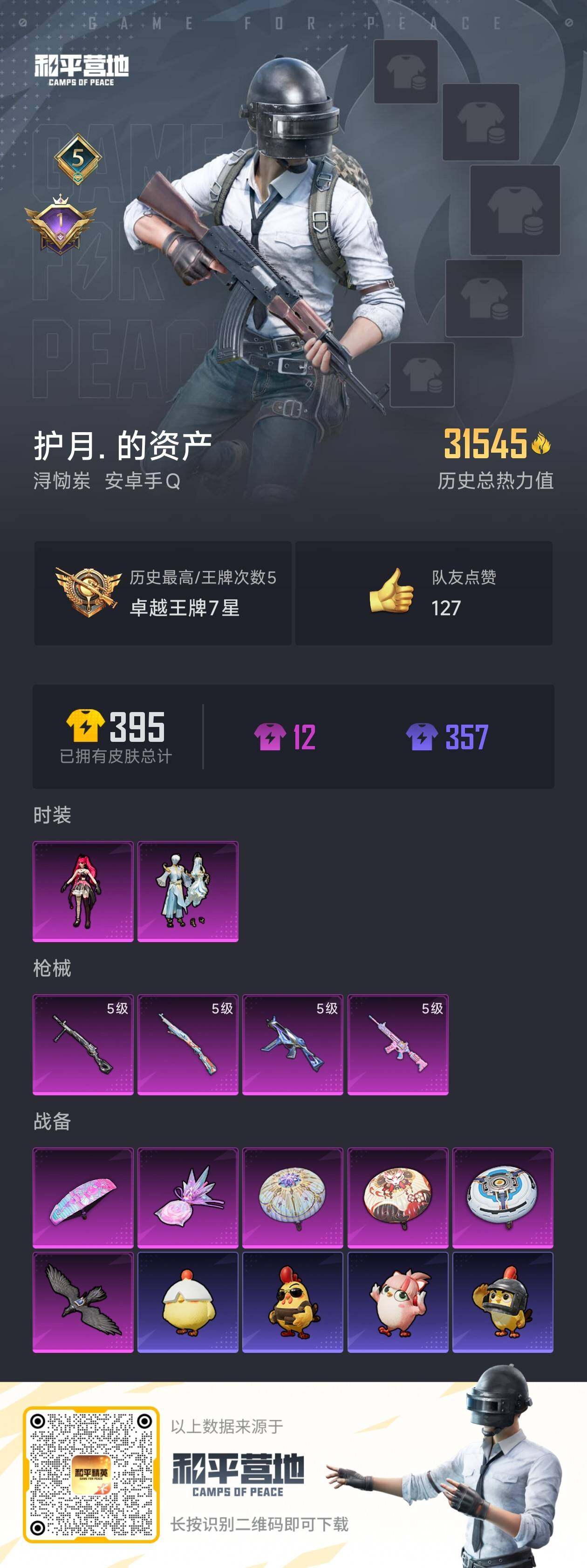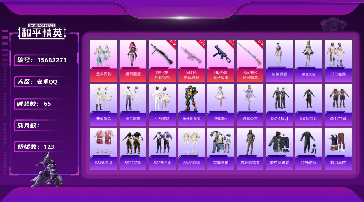 - PX_2109847- 安卓手Q-18王牌印记-4粉装-9特效枪-2载具-99015热力值-262套装-302枪皮-2卓越印记-0传奇印记 【4粉装】,梦幻火箭,蝶舞迷情,莲影清波,锦绣火鲤 【9特效枪】SCAR-L-锦绣绵绵-5级 M416-暖熊萌萌-7级 M416-电玩时刻-5级 M416-心之恋语-1级 AUG-暖羊咩咩-5级 Kar98K-伏魔团-4级 Kar98K-巳巳如意-1级 DP-