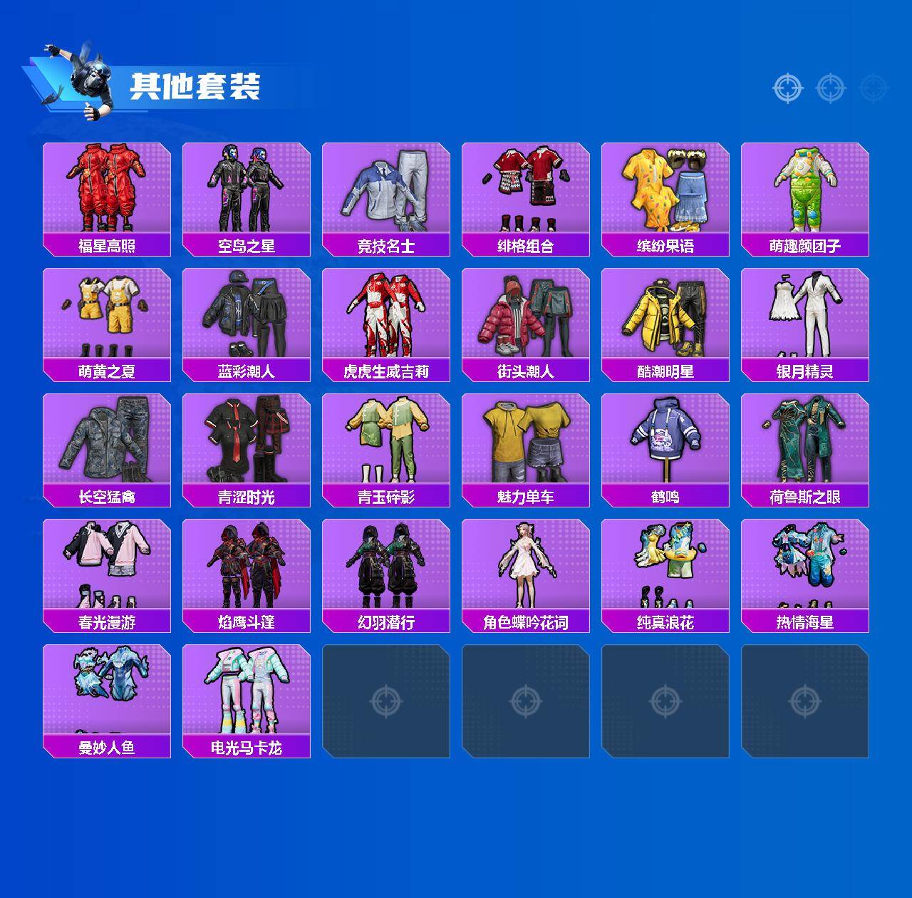 【其他套装】:套装-SS14特训,套装-SS15特训,套装-SS17特训,套装-SS26特训,套装-SS27特训,套装-SS28特训,套装-SS29特训,套装-完美偶像,套装-森林游猎者,套装-海岛探路者,套
