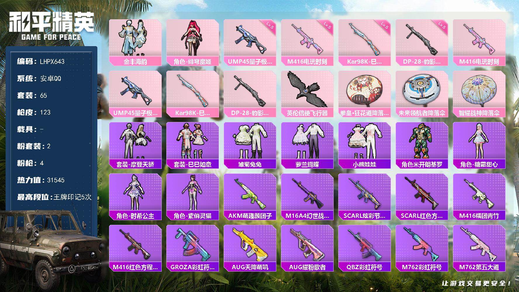 [15682273]【店主推荐捡漏号!可直接换绑】安卓 手Q-2粉装-4特效枪--2粉色飞行器-3.1w热力值-5王牌印记-65套装-123枪皮 【粉色套装】:粉装-金丰海韵,角色-绯穹魔姬 【粉色枪皮等级】:M416-电玩时刻(五级),UMP45-量子极限(五级),Kar98K-巳巳如意(五级),DP-28-豹影疾电(五级) 【粉色枪皮】:M416-电玩时刻,UMP45-量子极限,Kar98K-巳巳如意,DP-28-豹影疾电 【粉色飞行器】:英伦信使飞行器 【粉色降落伞】:拳皇·狂花道降落伞,未来领航者降落伞,智耀战神降落伞,炫彩糖果降落伞 【稀有套装】:套装-摩登天骄,套装-巳巳如意,套装-雏菊兔兔,套装-萝兰蝴蝶,套装-小熊娃娃,角色-米开朗基罗,角色-糖霜甜心,角色-时希公主,角色-紫俏灵猫 【稀有枪皮】:AKM-萌趣颜团子,M16A4-幻世战舞者,SCAR-L-炫彩节奏,SCAR-L-红色方程式,M416-糯团青竹,M416-红色方程式,GROZA-彩虹符号,AUG-天降萌叽,AUG-耀粉歌者,QBZ-彩虹符号,M762-彩虹符号,M762-第五大道,AC-VAL-天降萌叽,AC-VAL-快闪甜心,蜜獾-天降萌叽,UZI-啾咪啾咪,UZI-天降萌叽,UZI-炫彩节奏,UMP45-夜灯,UMP45-生命誓言,UMP45-蓝色火焰,Vector-焰鹰斗篷,Vector-生命誓言,汤姆逊-耀粉歌者,P90-快闪甜心,P90-巳巳如意,Kar98K-彩虹符号,AWM-焰鹰斗篷,AWM-圣堂之誓,SKS-炫彩节奏,Mini14-炫彩节奏,Mini14-绯穹魔姬,AMR-鬼刀,MK20-H-莲影清波,MK20-H-樱桃泡泡,S686-巳巳如意,S686-千金淑猫,S12K-玩趣呆呆,S12K-破晓战魂,S12K-夜灯,DBS-焰鹰斗篷,DBS-彩虹符号,DBS-荧海星豚,M249-星之彼岸,M249-糯团青竹,DP-28-焰鹰斗篷,MG3-幻世战舞者,MG3-第五大道,PKM-蜜语绒猫,蝎式手枪-闲梦青缨,蝎式手枪-千金淑猫,沙漠之鹰-快闪甜心,大砍刀-鬼刀,破片手榴弹-巳巳如意 【其他套装】:套装-SS14特训,套装-SS15特训,套装-SS17特训,套装-SS26特训,套装-SS27特训,套装-SS28特训,套装-SS29特训,套装-完美偶像,套装-森林游猎者,套装-海岛探路者,套
