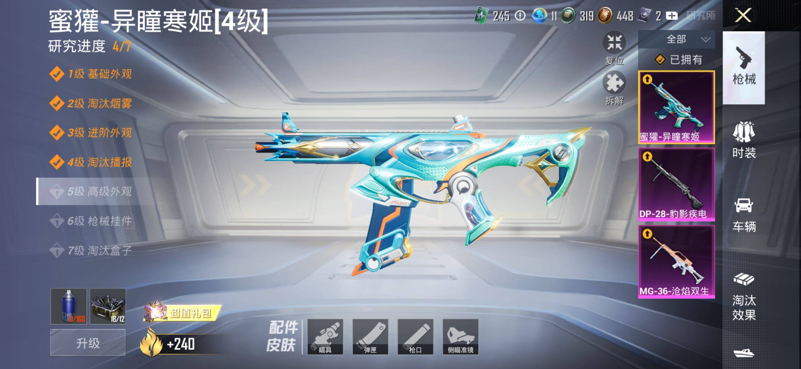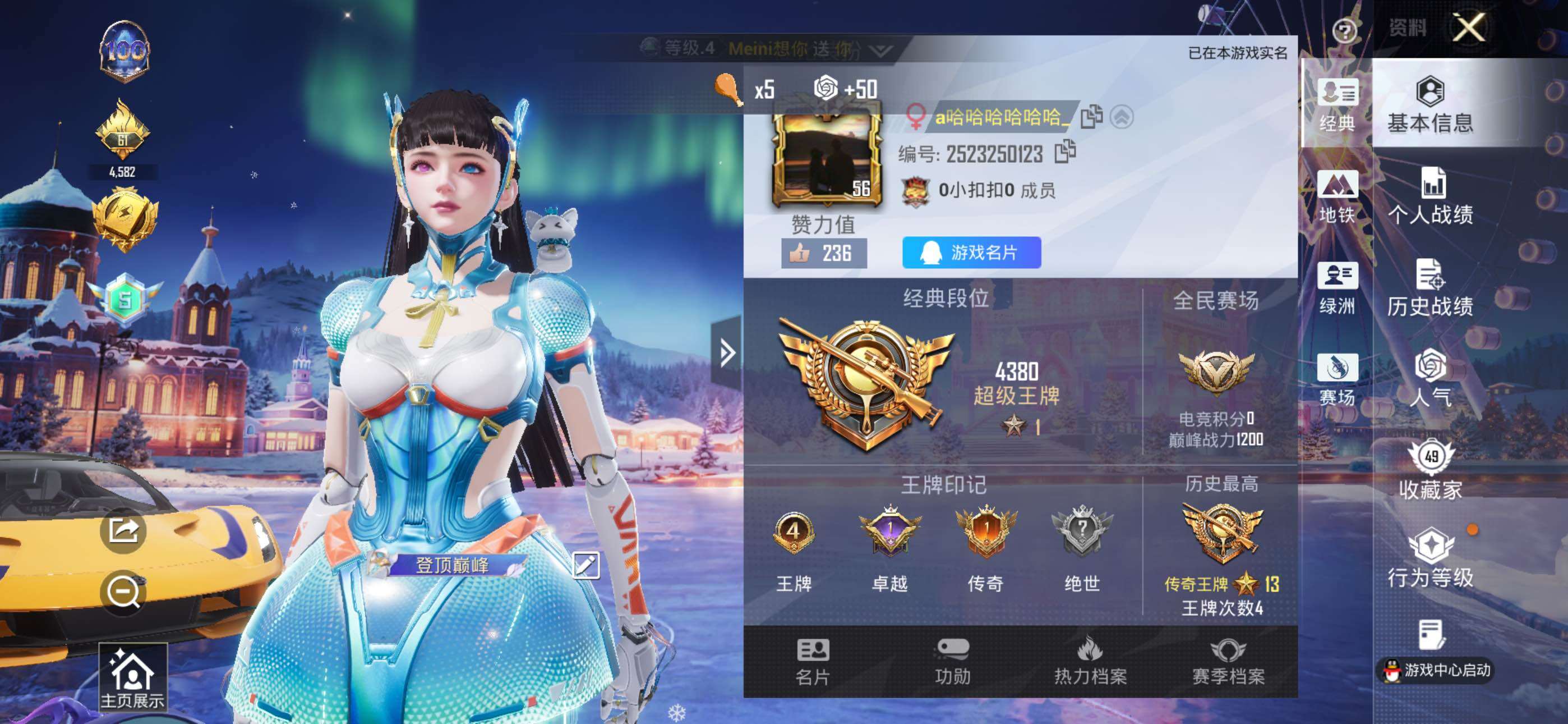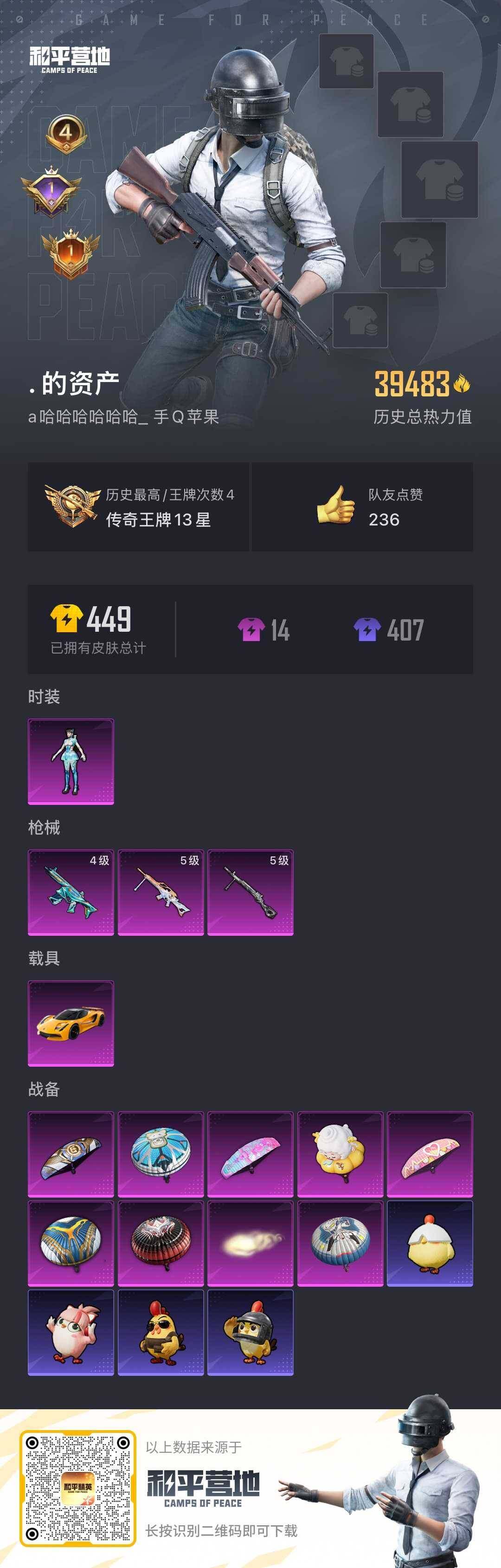 - PX_2077578- 安卓手Q-7王牌印记-1粉装-1特效枪-1载具-49670热力值-146套装-174枪皮-1卓越印记-0传奇印记 【1粉装】,星穹咏叹调 【1特效枪】Kar98K-巳巳如意-5级 【2稀有紫装】,暗影哥特,龟仙人, 【1稀有载具】,兰博基尼Estoque(银翼灰), 【146稀有时装】,SS31特训,SS33特训,SS32特训,蓝冰羽,极速光影,雪绒豹,紫幽梦,大橘大利,
