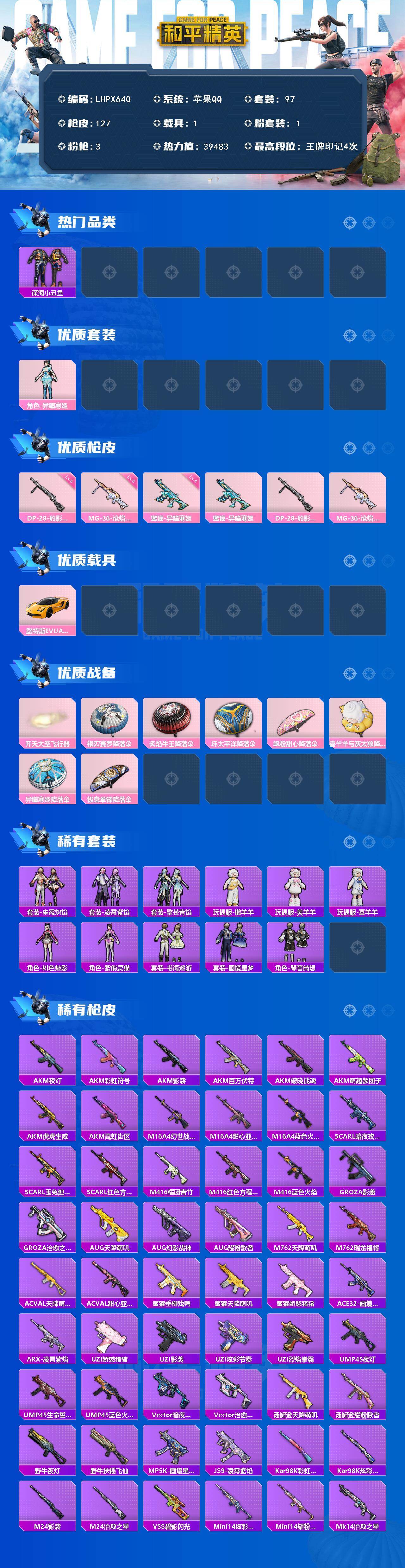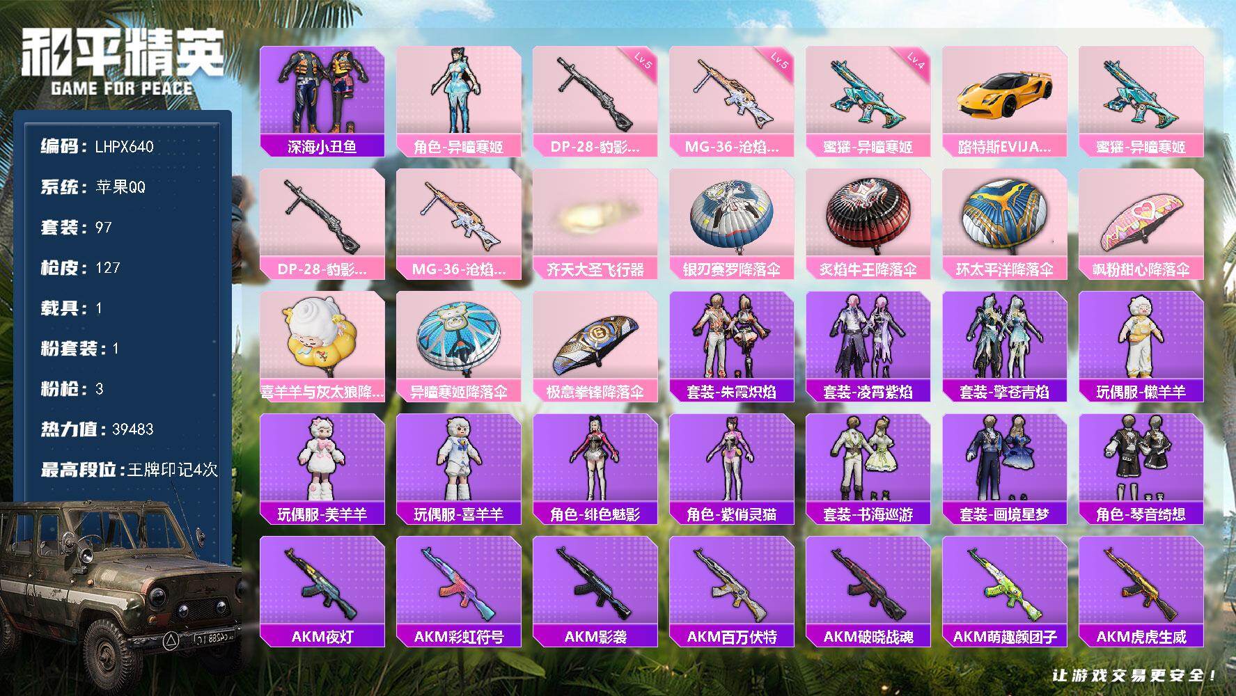 [15682327]【店主推荐捡漏号!可直接换绑】苹果 手Q-1粉装-3特效枪-1载具-1粉色飞行器-39483热力值-4王牌印记-97套装-127枪皮【热门品类】:套装-深海小丑鱼【粉色套装】:角色-异瞳寒姬【粉色枪皮等级】:蜜獾-异瞳寒姬(四级),DP-28-豹影疾电(五级),MG-36-沧焰双生(五级)【粉色载具】:路特斯EVIJA(星际黄)【粉色枪皮】:蜜獾-异瞳寒姬,DP-28-豹影疾电,MG-36-沧焰双生【粉色飞行器】:齐天大圣飞行器