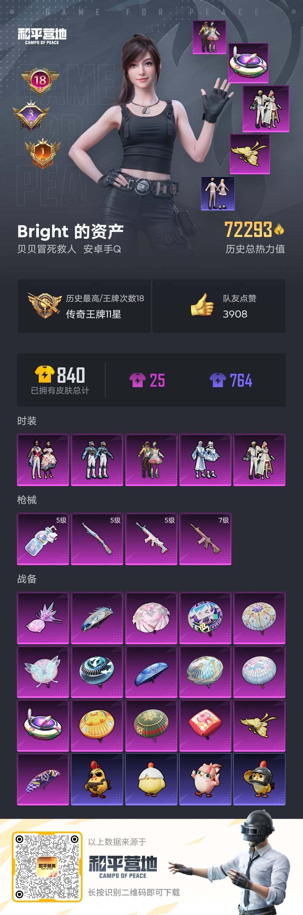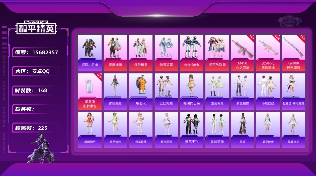- PX_2091798- 苹果手Q-17王牌印记-12粉装-8特效枪-1载具-106143热力值-237套装-305枪皮-1卓越印记-1传奇印记 【12粉装】,天使彩虹糖,缤纷油彩,蝶舞迷情,第五大道,洛天依,草莓生巧,蓝莓炮弹,精灵娃娃,PEL轰鸣竞梦者,静灵氛围,智能音符,烟云彩露 【8特效枪】AKM-炫紫旋律-7级 AKM-甜心宝贝-7级 M416-电玩时刻-5级 Kar98K-巳巳如意-4级