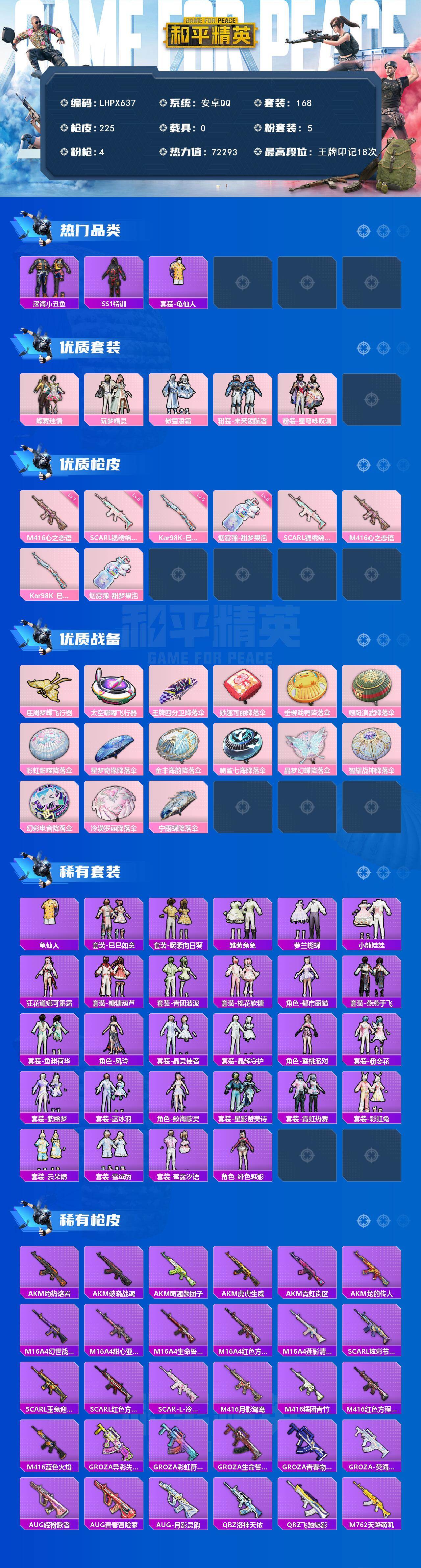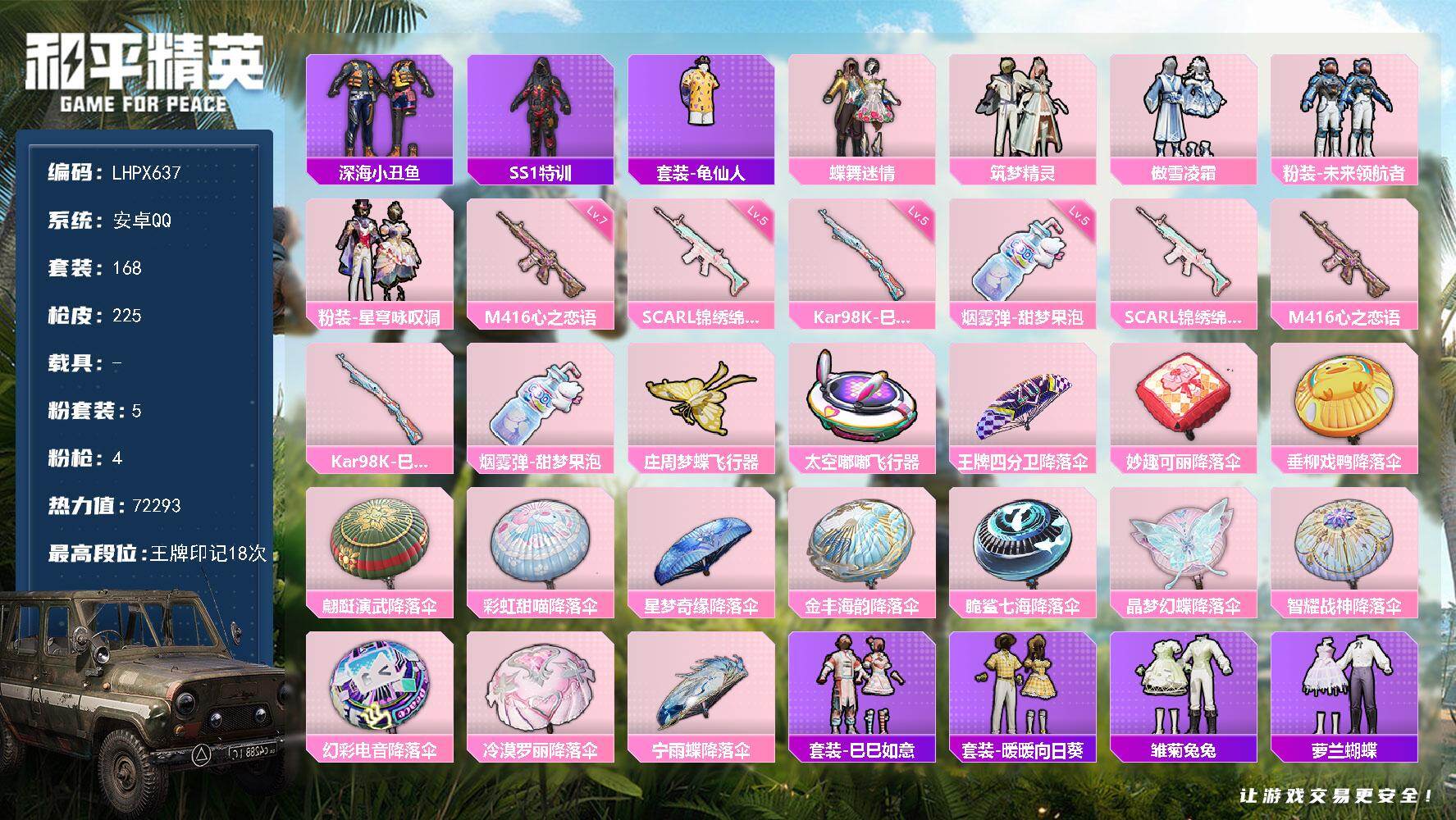 [15682357]【店主推荐捡漏号!可直接换绑】安卓 手Q-5粉装-4特效枪-0载具-3粉色飞行器-72293热力值-18王牌印记-168套装-225枪皮【热门品类】:套装-深海小丑鱼,套装-SS1特训,套装-龟仙人【粉色套装】:粉装-蝶舞迷情,粉装-筑梦精灵,粉装-傲雪凌霜,粉装-未来领航者,粉装-星穹咏叹调【粉色枪皮等级】:SCAR-L-锦绣绵绵(五级),M416-心之恋语(七级),Kar98K-巳巳如意(五级),烟雾弹-甜梦果泡(五级)【粉色枪皮】:SCAR-L-锦绣绵绵,M416-心之恋语,Kar98K-巳巳如意,烟雾弹-甜梦果泡【粉色飞行器】:庄周梦蝶飞行器,太空嘟嘟飞行器