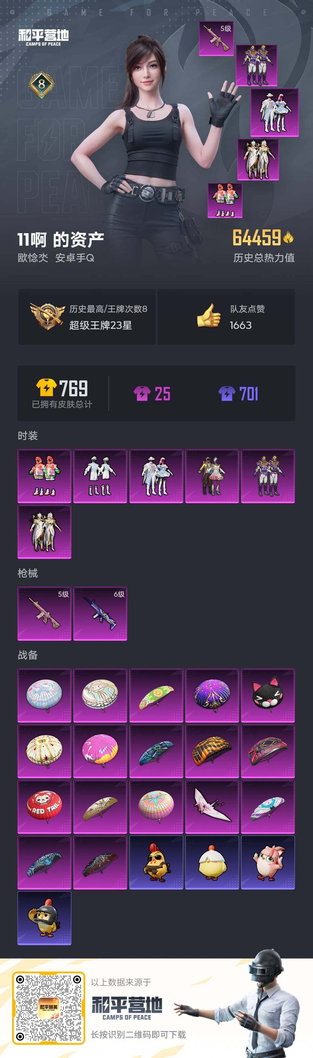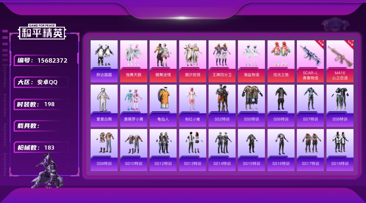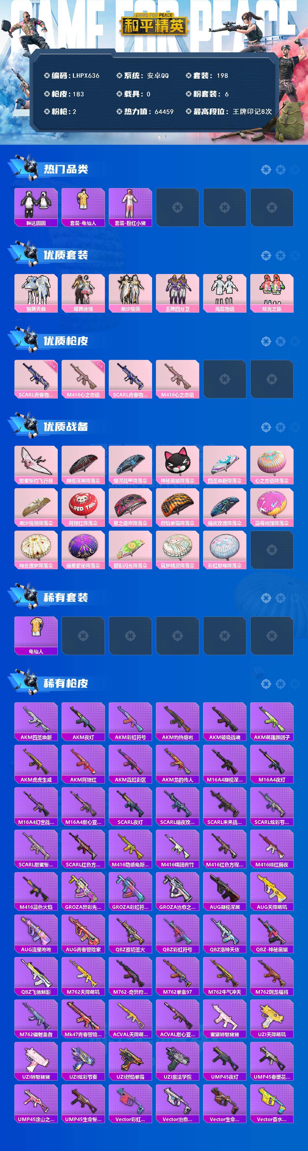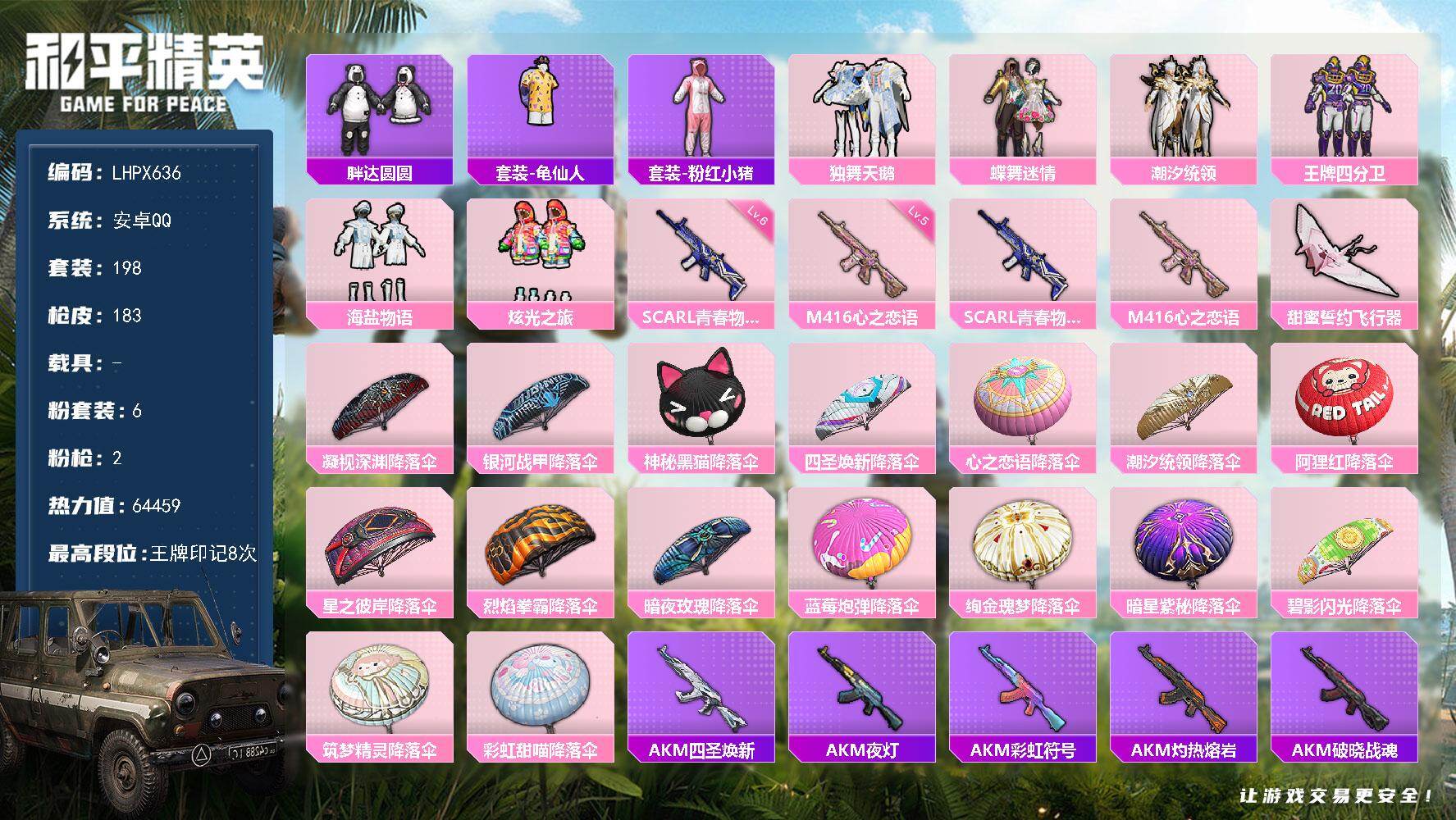 [15682372]【店主推荐捡漏号!可直接换绑】安卓 手Q-6粉装-2特效枪-0载具-1粉色飞行器-64459热力值-8王牌印记-198套装-183枪皮【热门品类】:套装-胖达圆圆,套装-龟仙人,套装-粉红小猪【粉色套装】:粉装-独舞天鹅,粉装-蝶舞迷情,粉装-潮汐统领,粉装-王牌四分卫,粉装-海盐物语,粉装-炫光之旅【粉色枪皮等级】:SCAR-L-青春物语(六级),M416-心之恋语(五级)【粉色枪皮】:SCAR-L-青春物语,M416-心之恋语【粉色飞行器】:甜蜜誓约飞行器