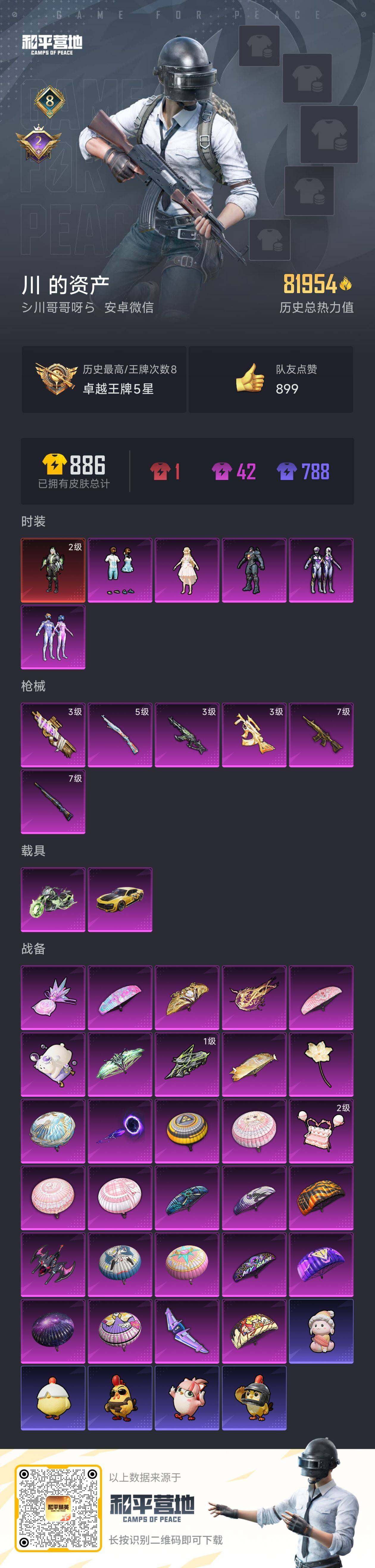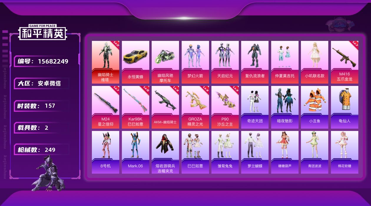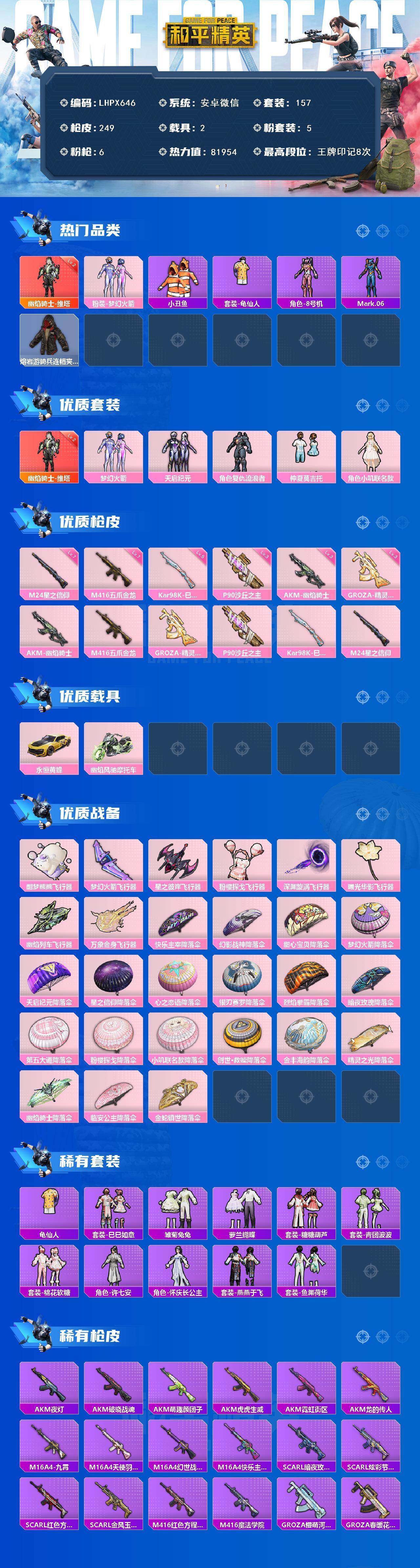 [15682249]【特价出售/店主推荐】安卓 微信-1神装-5粉装-6特效枪-2载具-9粉色飞行器-8.1w热力值-8王牌印记-157套装-249枪皮