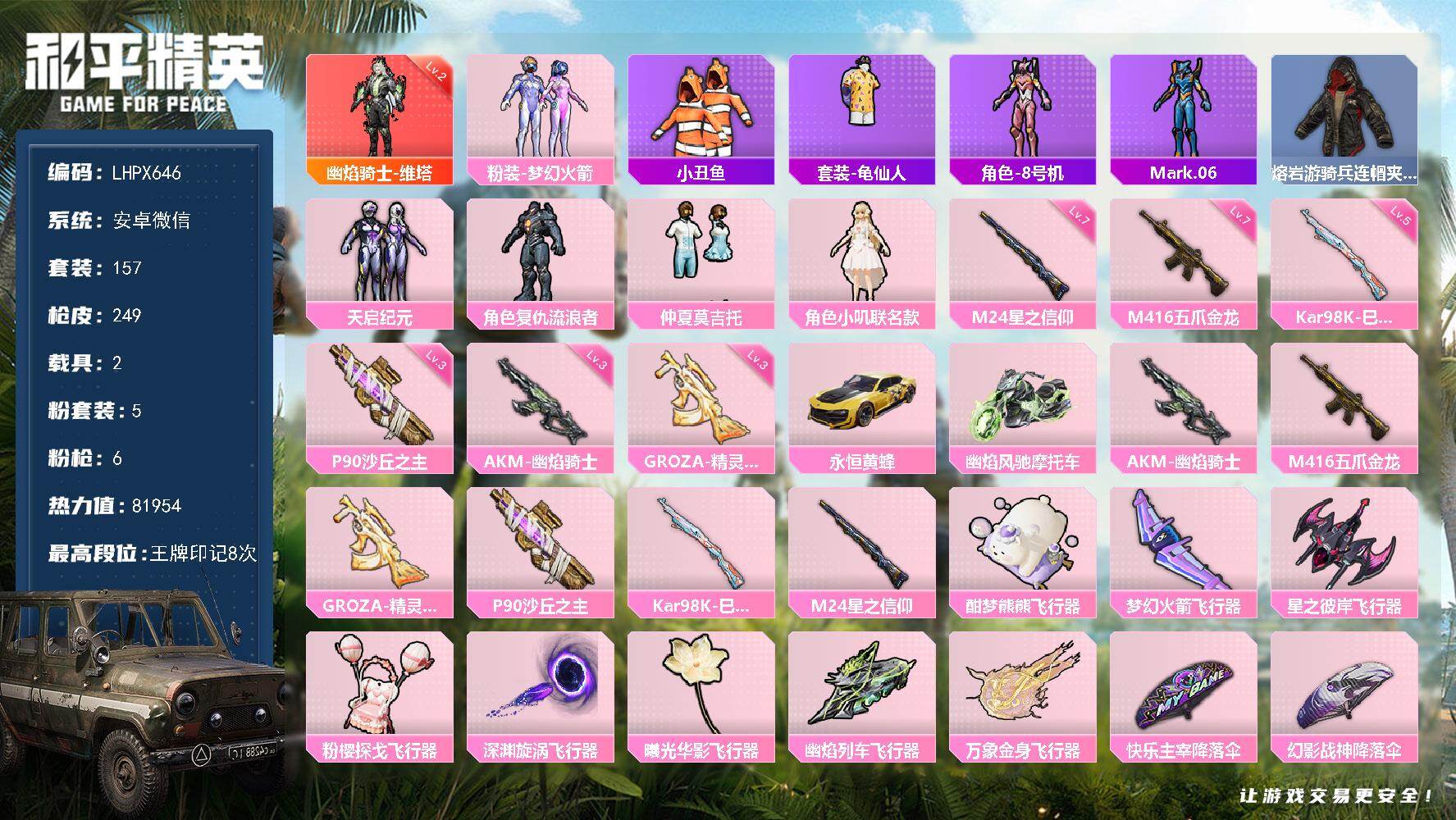 [15682249]【特价出售/店主推荐】安卓 微信-1神装-5粉装-6特效枪-2载具-9粉色飞行器-8.1w热力值-8王牌印记-157套装-249枪皮 【红色神装等级】:幽焰骑士-维塔(二级) 【红色角色神装】:幽焰骑士-维塔 【热门品类】:粉装-梦幻火箭,套装-小丑鱼,套装-龟仙人,角色-8号机,角色-Mark.06,熔岩游骑兵连帽夹克 【粉色套装】:粉装-梦幻火箭,粉装-天启纪元,角色-复仇流浪者,粉装-仲夏莫吉托,角色-小叽联名款 【粉色枪皮等级】:AKM-幽焰骑士(三级),M416-五爪金龙(七级),GROZA-精灵之光(三级),P90-沙丘之主(三级),Kar98K-巳巳如意(五级),M24-星之信仰(七级) 【粉色载具】:永恒黄蜂,幽焰风驰摩托车 【粉色枪皮】:AKM-幽焰骑士,M416-五爪金龙,GROZA-精灵之光,P90-沙丘之主,Kar98K-巳巳如意,M24-星之信仰 【粉色飞行器】:酣梦熊熊飞行器,梦幻火箭飞行器,星之彼岸飞行器,粉樱探戈飞行器,深渊漩涡飞行器,曦光华影飞行器,幽焰列车飞行器,万象金身飞行器 【粉色降落伞】:快乐主宰降落伞,幻影战神降落伞,甜心宝贝降落伞,梦幻火箭降落伞,天启纪元降落伞,星之信仰降落伞,心之恋语降落伞,银刃赛罗降落伞,烈焰拳霸降落伞,暗夜玫瑰降落伞,第五大道降落伞,粉樱探戈降落伞,小叽联名款降落伞,创世·救赎降落伞,金丰海韵降落伞,精灵之光降落伞,幽焰骑士降落伞,临安公主降落伞,金蛇镇世降落伞,炫彩糖果降落伞 【稀有套装】:套装-龟仙人,套装-巳巳如意,套装-雏菊兔兔,套装-萝兰蝴蝶,套装-糖糖葫芦,套装-青团波波,套装-棉花软糖,角色-许七安,角色-怀庆长公主,套装-燕燕于飞,套装-鱼渊荷华 【稀有枪皮】:AKM-夜灯,AKM-破晓战魂,AKM-萌趣颜团子,AKM-虎虎生威,AKM-霓虹街区,AKM-龙的传人,M16A4-九霄,M16A4-天使羽翼,M16A4-幻世战舞者,M16A4-快乐主宰,SCAR-L-暗夜玫瑰,SCAR-L-炫彩节奏,SCAR-L-红色方程式,SCAR-L-金风玉露,M416-红色方程式,M416-魔法学院,GROZA-懵萌河马,GROZA-春暖花开,GROZA-治愈之星,GROZA-黑色刀锋,AUG-天降萌叽,AUG-耀粉歌者,AUG-金蛇镇世,QBZ-彩虹符号,QBZ-洛神天依,QBZ-赛罗,M7