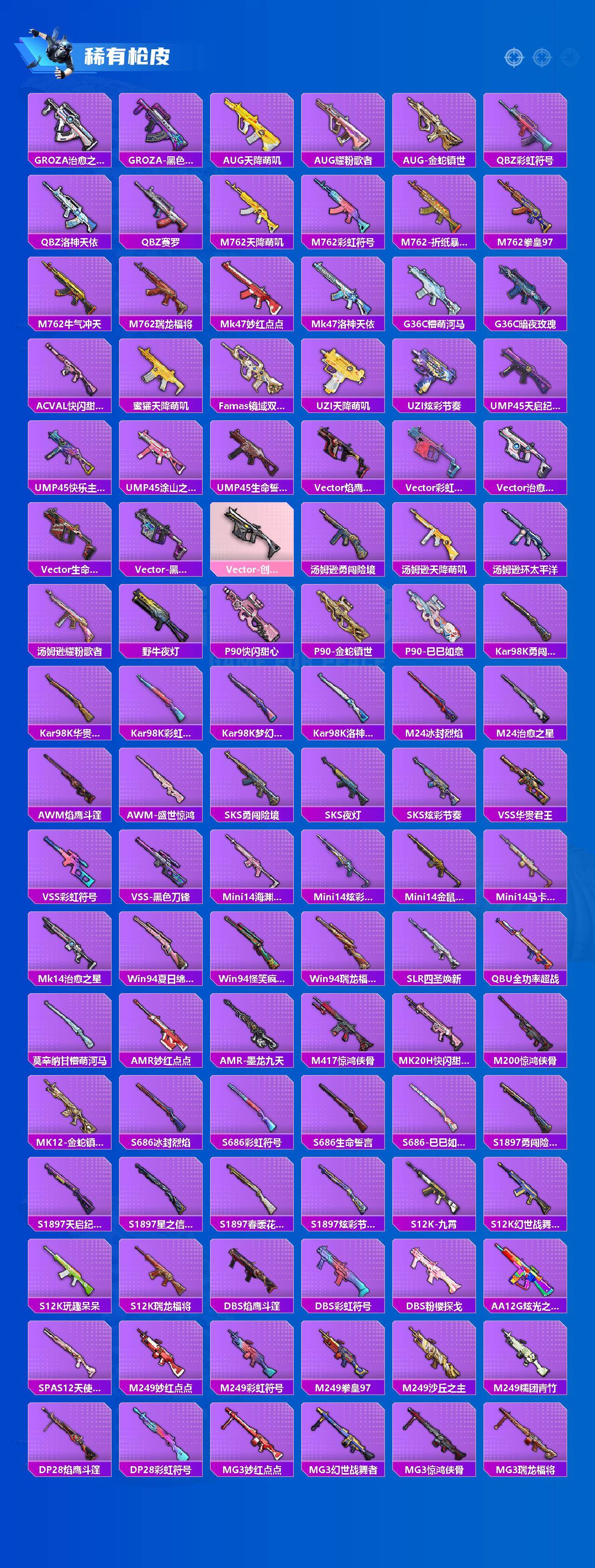 【稀有枪皮】:AKM-夜灯,AKM-破晓战魂,AKM-萌趣颜团子,AKM-虎虎生威,AKM-霓虹街区,AKM-龙的传人,M16A4-九霄,M16A4-天使羽翼,M16A4-幻世战舞者,M16A4-快乐主宰,SCAR-L-暗夜玫瑰,SCAR-L-炫彩节奏,SCAR-L-红色方程式,SCAR-L-金风玉露,M416-红色方程式,M416-魔法学院,GROZA-懵萌河马,GROZA-春暖花开,GROZA-治愈之星,GROZA-黑色刀锋,AUG-天降萌叽,AUG-耀粉歌者,AUG-金蛇镇世,QBZ-彩虹符号,QBZ-洛神天依,QBZ-赛罗,M7