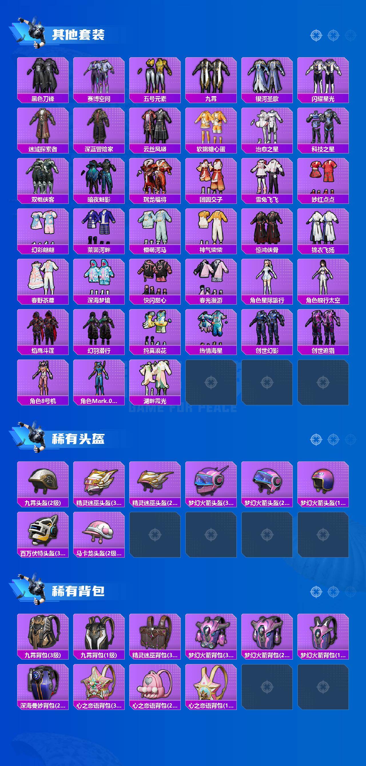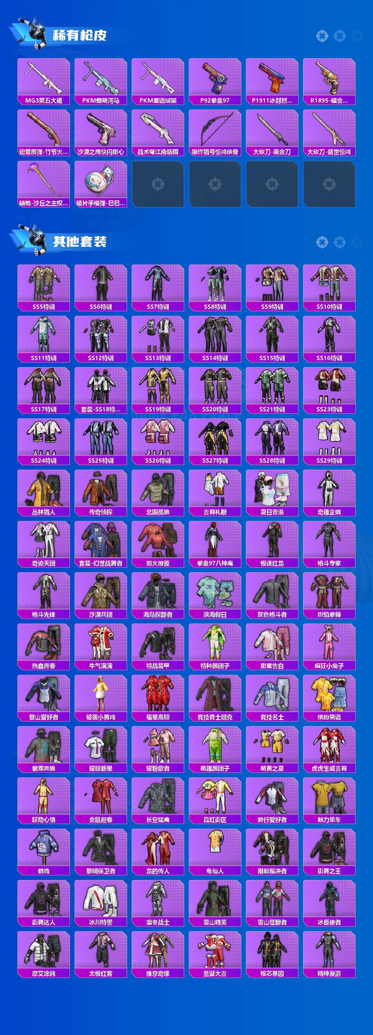 - [11253617]2粉装 9特效枪 1载具 4印记 可二次 可修改实名 身法装备:暗影哥特(红眼罩),Mark.06(新蓝螳螂) 优质装备:宝马M4(圣保罗黄),UMP45量子极限,M762-青锋波束,DP-28-千金淑猫,千金淑猫,GROZA-镜光银凌,MK12-雪月幻音,Kar98K-圣域龙灵,MK14-甜梦熊击,荧海星豚,Kar98K-巳巳如意 热门装扮:鹰眼刺客 稀有枪皮:DP-28-豹影疾电 五级特效枪:五级M762-青锋波束,五级UMP45-量子极限,五级GROZA-镜光银凌,五级Kar98K-巳巳如意,五级MK14-甜梦熊击 四级特效枪:四级DP-28-千金淑猫 三级特效枪:三级Kar98K-圣域龙灵 二级特效枪:二级DP-28-豹影疾电 一级特效枪:一级MK12-雪月幻音 紫色装扮:SS31特训套装,冰川特警,冷焰舞者,SS30特训套装,SS33特训套装,青涩时光,都市魅力,缤纷果语,蓝彩潮人,蓝色运动,蓝海鲸歌,蜜露汐语,魅力单车,黄色伏地魔,黄色运动,黑色伏地魔,冰河战士,龙魂突击队,蝶变,香桃花海,柠萌假日,海岛探路者,幻影武者,白色伏地魔,破蛋小黄鸡,红色运动,猛禽,小熊娃娃,雏菊兔兔,萝兰蝴蝶,SS29特训,多纳泰罗,星途旅人,纯真浪花,热情海星,曼妙人鱼,SS28特训,Mark.06(新蓝螳螂),鱼渊荷华,燕燕于飞,巳巳如意,都市丽猫,青团波波,糖糖葫芦,棉花软糖,绒宝小鹅,摩登魅猫,暗影哥特(红眼罩),街头风暴,芝莓熊熊,SS32特训服(SS32特训套装),荒漠狂战,漫步者 优质战备:奇迹舞步降落伞,守护天翼降落伞,创世·救赎降落伞,精灵梦叶罗丽降落伞,初号机 觉醒Ver.降落伞,星途旅人降落伞,深渊漩涡飞行器,忍者神龟降落伞,金丰海韵降落伞,千金淑猫降落伞,幽焰列车飞行器,幽焰骑士降落伞,齐天大圣降落伞