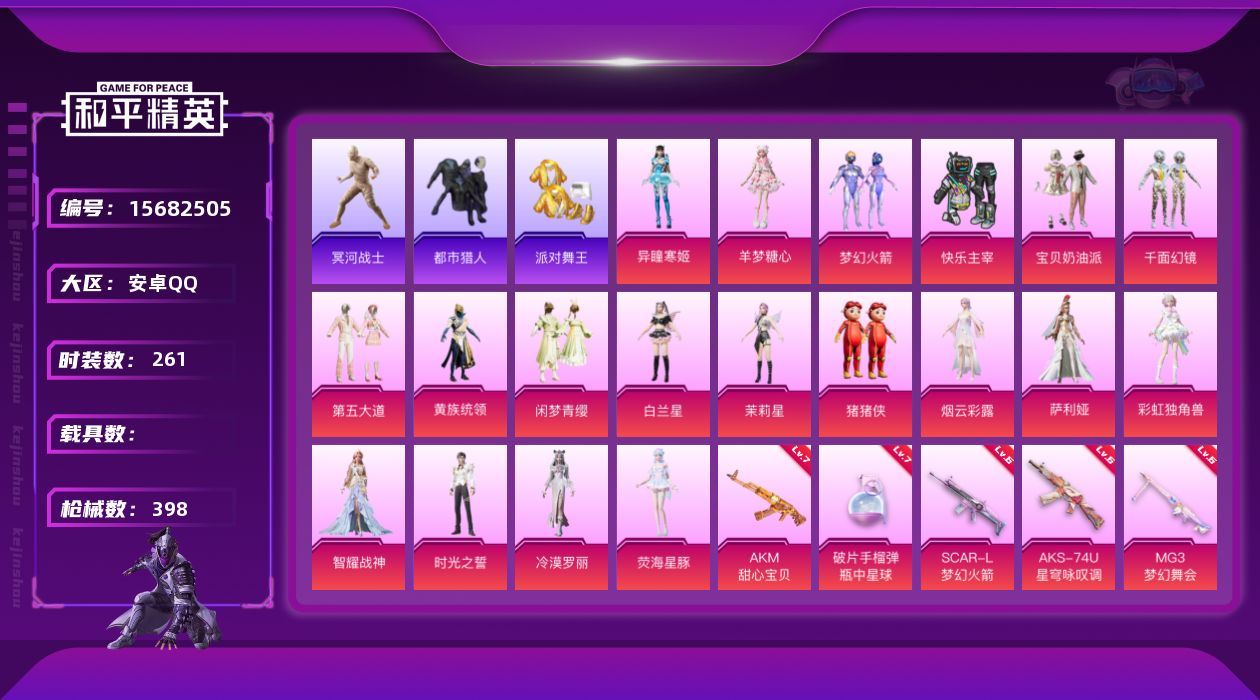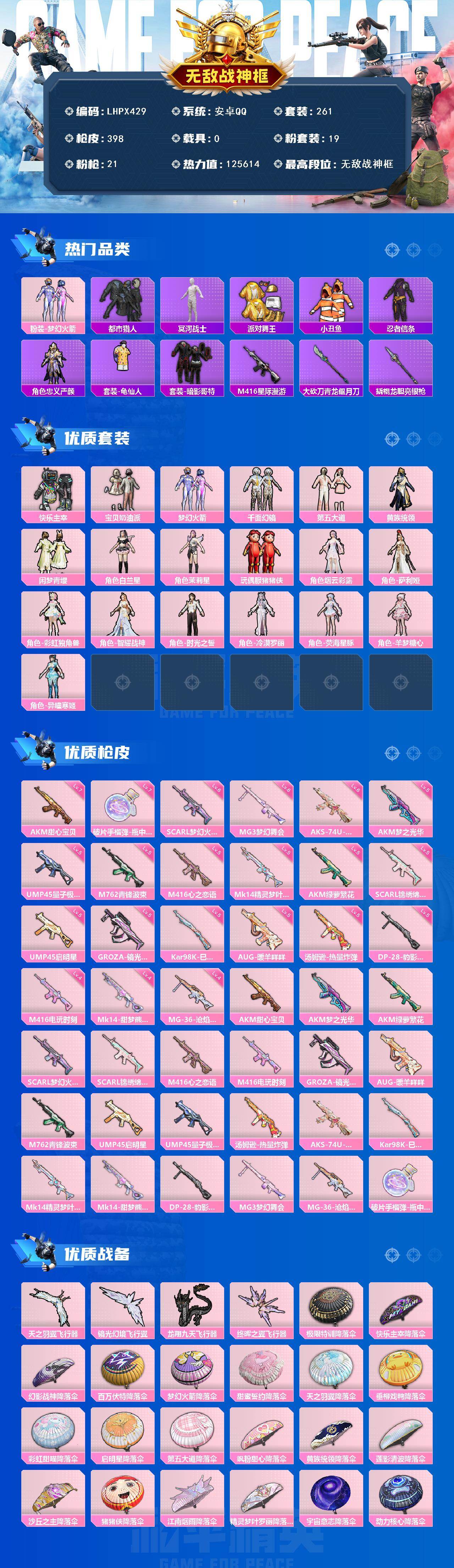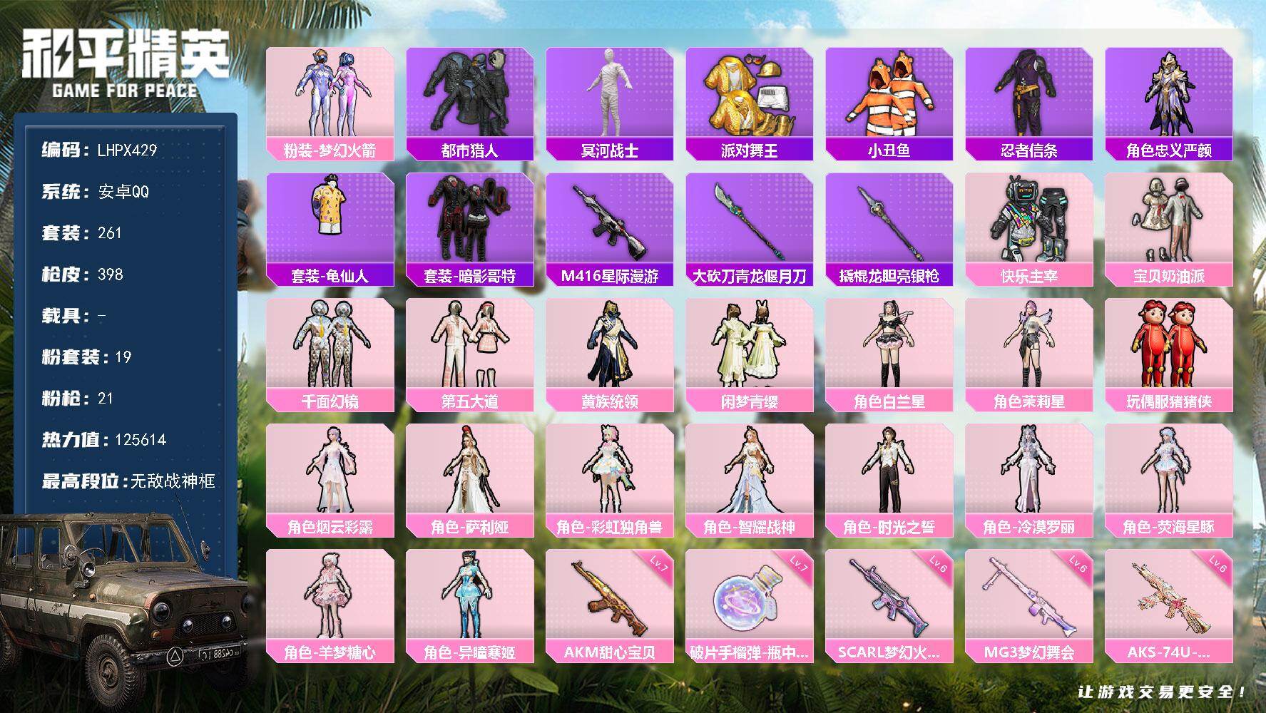 [15682505]【特价出售/店主推荐】安卓 手Q-无敌战神框-19粉装-21特效枪-0载具-7粉色飞行器-125614热力值-21王牌印记-261套装-398枪皮