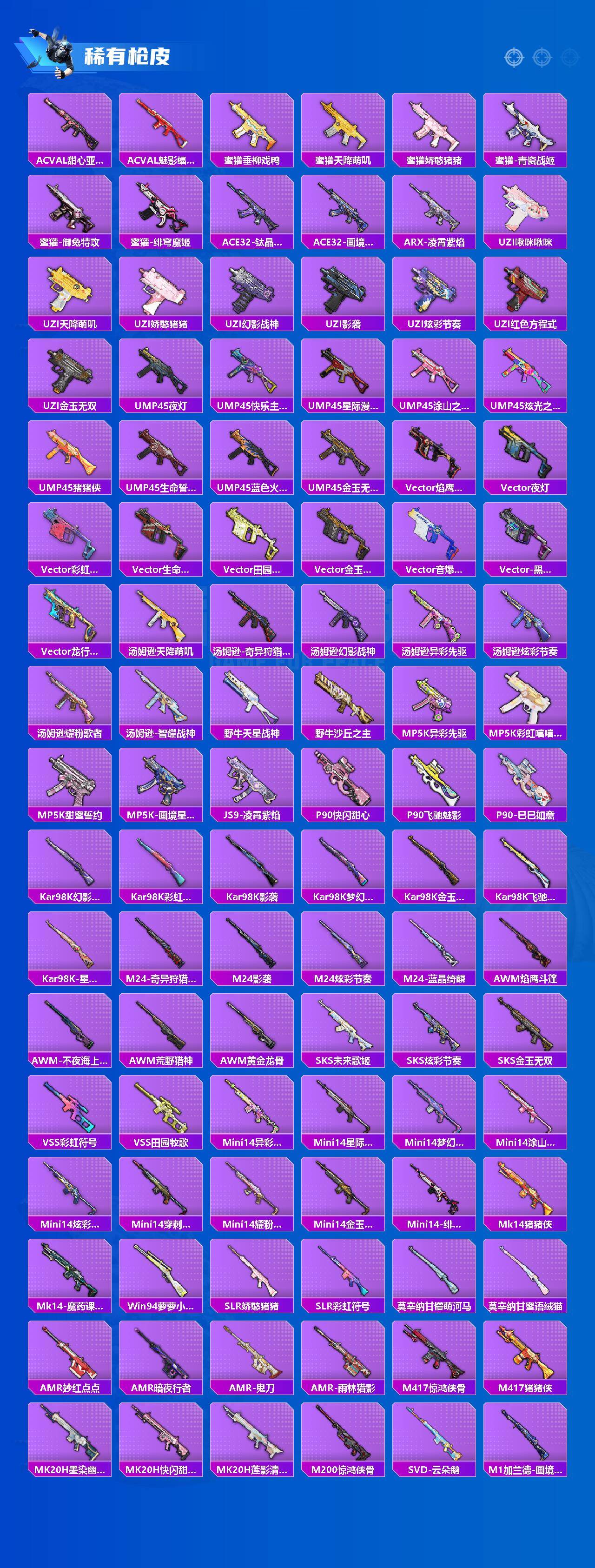 【粉色枪皮】:AKM-甜心宝贝,AKM-梦之光华,AKM-绿萝繁花,SCAR-L-梦幻火箭,SCAR-L-锦绣绵绵,M416-心之恋语,M416-电玩时刻,GROZA-镜光银凌,AUG-暖羊咩咩,M762-青锋波束,UMP45-启明星,UMP45-量子极限,汤姆逊-热量炸弹,AKS-74U-星穹咏叹调,Kar98K-巳巳如意,Mk14-精灵梦叶罗丽,Mk14-甜梦熊击,DP-28-豹影疾电,MG3-梦幻舞会,MG-36-沧焰双生,破片手榴弹-瓶中星球