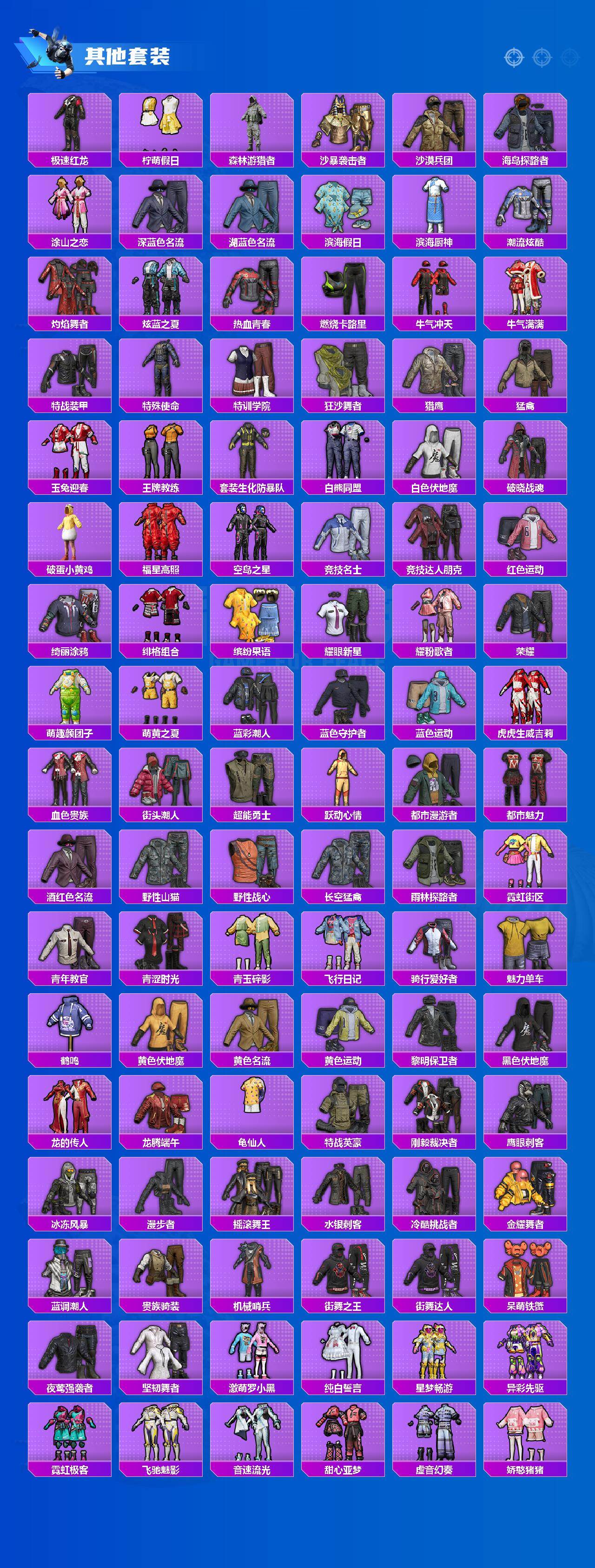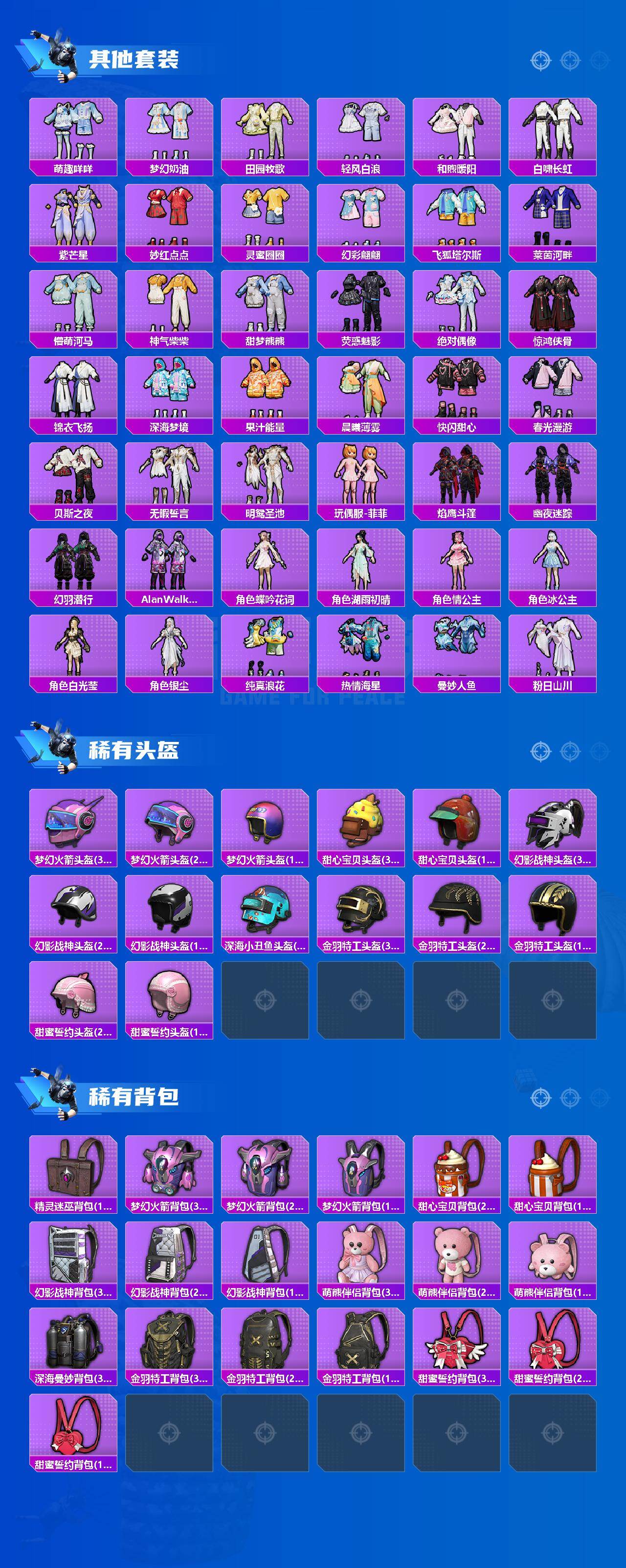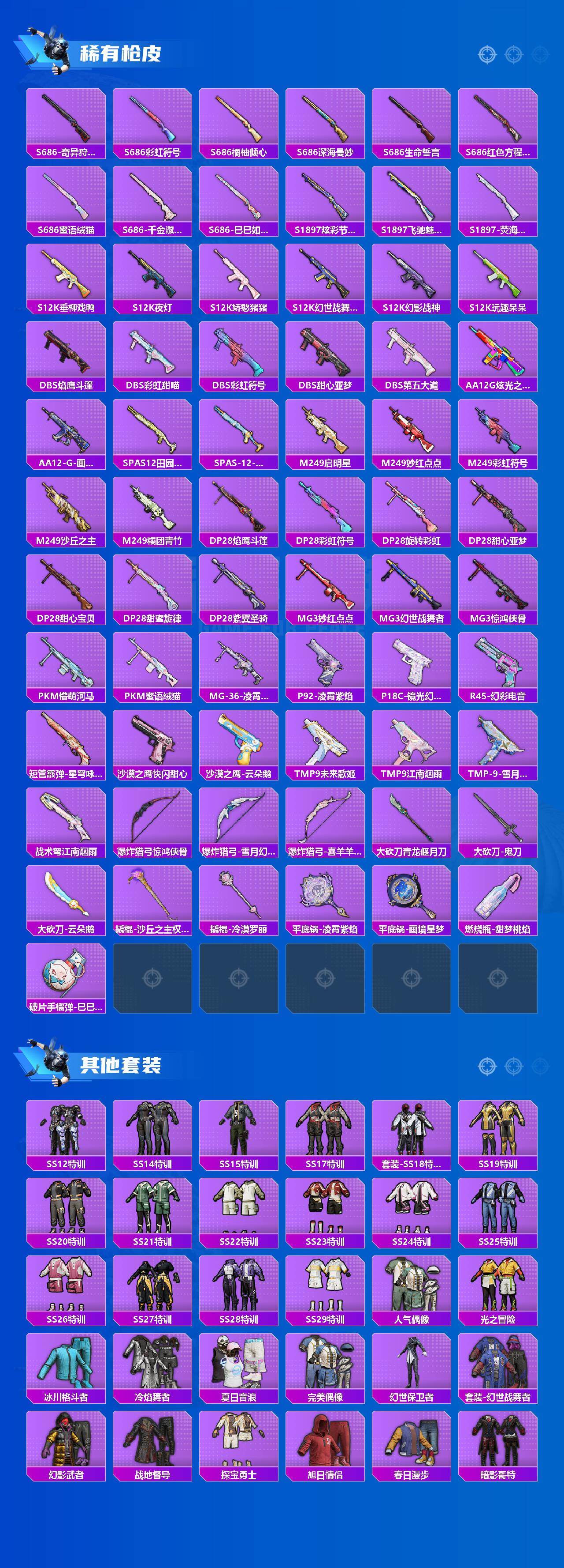 - [12226243]4粉装 6特效枪 2载具 11印记 可二次 可修改实名 身法装备:8号机(新粉螳螂) 优质装备:特斯拉Roadster(水滴蓝),M416心之恋语,Groza香水柠檬,银刃赛罗,俏皮狐尾,七级GROZA-香水柠檬,七级M416-心之恋语,UMP45量子极限,AUG-暖羊咩咩,Kar98K-巳巳如意 热门装扮:蓝莓炮弹,金丰海韵,好奇恐龙 载具:空客H135-蔚蓝之翼,萌喵橘座 稀有枪皮:DP-28-豹影疾电 五级特效枪:五级UMP45-量子极限,五级Kar98K-巳巳如意,五级DP-28-豹影疾电,五级AUG-暖羊咩咩 紫色装扮:SS22特训,SS23特训,娇憨猪猪,酸甜橘柚,暖心橘喵,萌趣咩咩,SS21特训,SS31特训套装,SS2特训,SS3特训,SS5特训,人气偶像,军械专家,冰原使者,,冷焰舞者,凛冬战士,刚毅裁决者,北国孤狼,千禧之恋,SS30特训套装,SS33特训套装,青涩时光,SS20特训,青春冒险家,潮流游乐家,SS15特训,暗夜傀儡,时空追击者,暴风机械师,SS16特训,爆裂葡萄,快乐星愿,遗落祭司,冰爽海盐,银白舞王,SS13特训,骁骑迪迦,诡谋托雷基亚,浪漫樱花,治愈之星,迅捷之星,科技之星,SS14特训,萌趣颜团子,特种颜团子,飞驰魅影,音速流光,SS19特训,吉莉礼服,雪兔飞飞,瑞龙福将,团圆交子,醒狮腾龙,SS17特训,炫光向阳,异彩先驱,缤纷焰火,SS18特训,都市魅力,酒红色名流,酷潮明星,野性战心,长空猛禽,雪山征服者,雪山精英,霓虹极客,霓虹街区,青年教官,迎春赐吉,缤纷果语,荣耀,蓝彩潮人,蓝色运动,虎虎生威吉莉,街头潮人,飞行日记,龙腾端午,骑行爱好者,魅力单车,鹤鸣,麻辣教官,黄色伏地魔,黄色名流,黄色运动,黎明保卫者,黑色伏地魔,龙的传人,龟仙人,冰河战士,龙魂突击队,蝶变,香桃花海,熔岩游骑兵连帽夹克,极速红龙,柠萌假日,格斗先锋,橘黑制服,沙漠兵团,海滨突袭者,深蓝色名流,滨海假日,幻影武者,圣诞大吉,坚韧舞者,夏日音浪,夜莺强袭者,完美偶像,帅气教官,幻世战舞者,怒火燎原,战地督导,战地菁英,探宝勇士,湖蓝色名流,滨海厨神,绮丽涂鸦,疯狂小兔子,白色伏地魔,破晓战魂,破蛋小黄鸡,神秘领域,甜蜜告白,福星高照,空岛之星,空投萌叽,竞技勇士朋克,竞技达人朋克,红色运动,甜蜜熊情侣,王牌教练,牛气冲天,灰色格斗者,灼焰舞