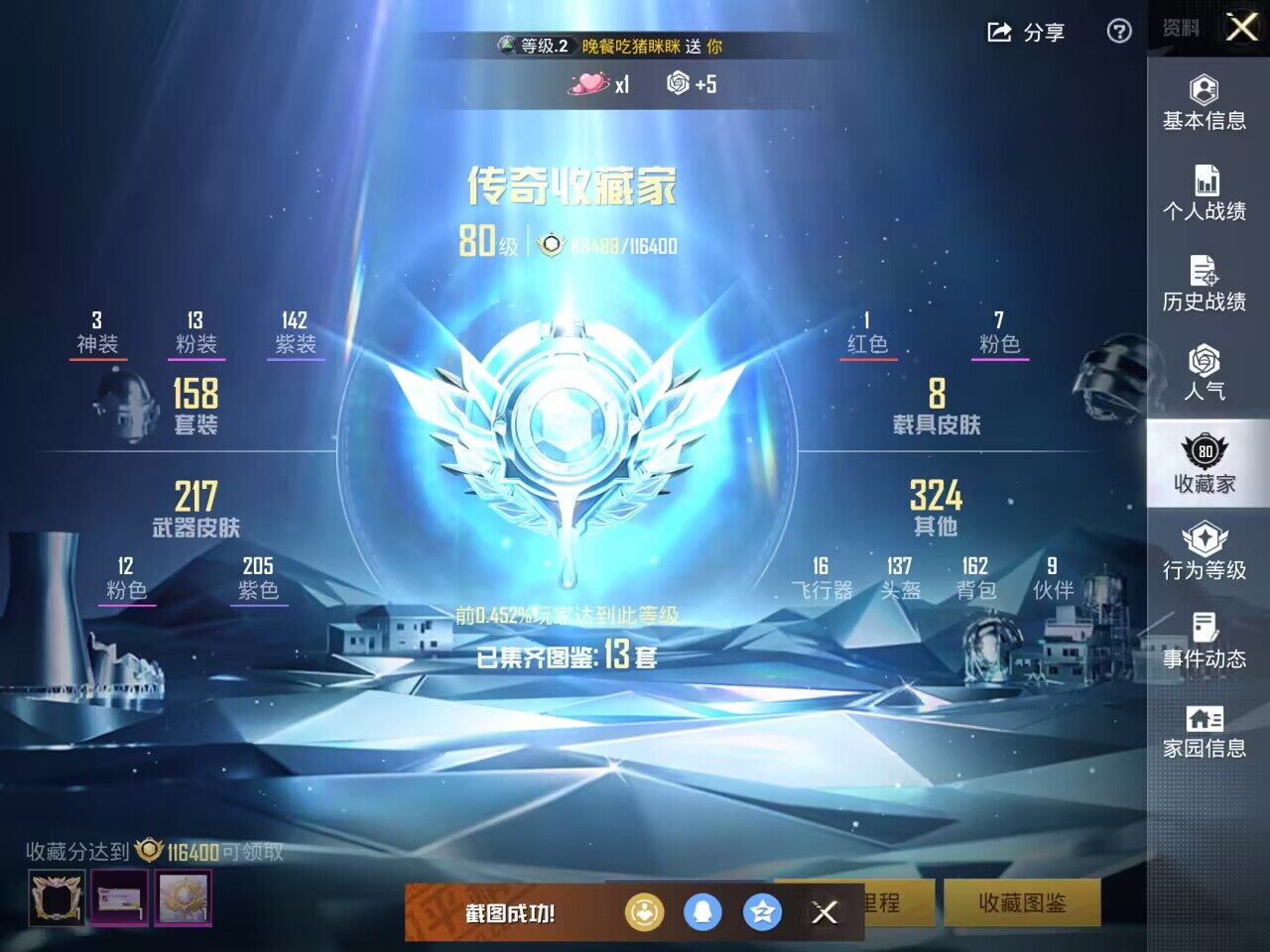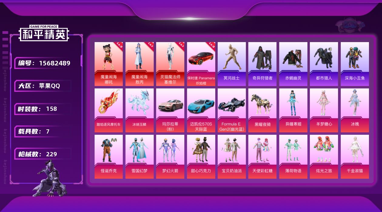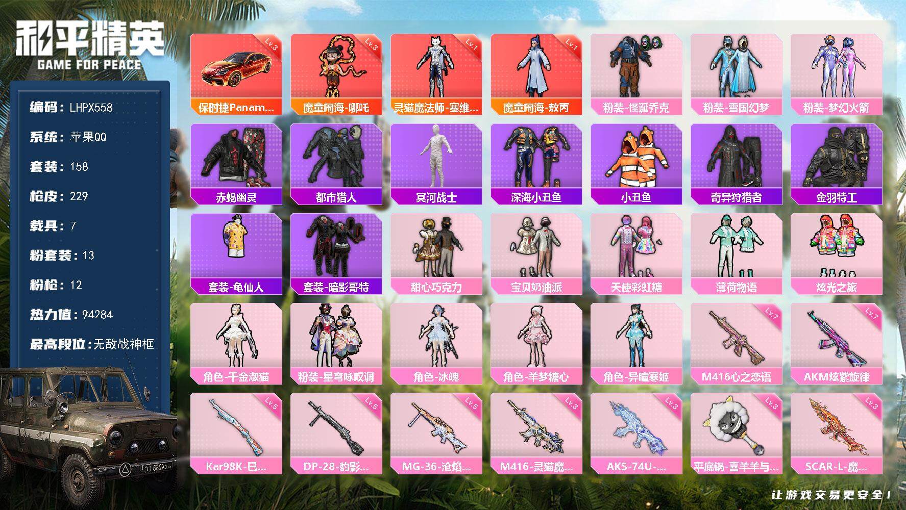 [15682489]【特价出售/店主推荐】苹果 手Q-无敌战神框-3神装-13粉装-12特效枪-7载具-8粉色飞行器-94284热力值-14王牌印记-158套装-229枪皮