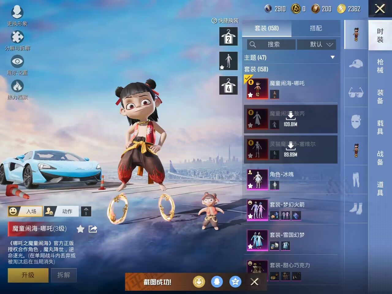 【红色神装等级】:魔童闹海-敖丙(一级),魔童闹海-哪吒(三级),灵猫魔法师-塞维尔(一级)