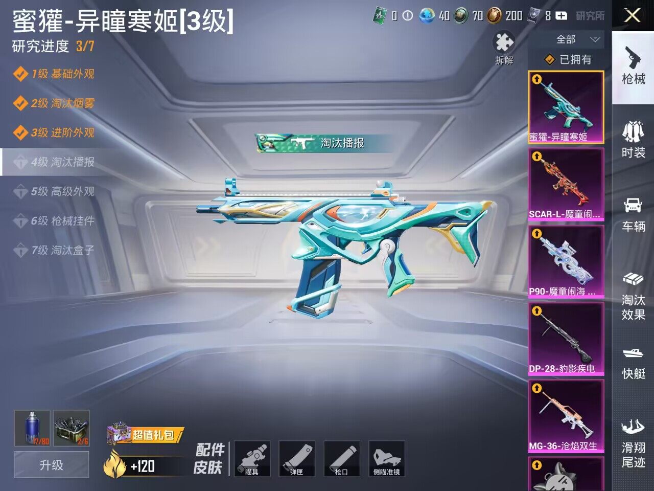 【粉色枪皮等级】:AKM-炫紫旋律(七级),SCAR-L-魔童闹海 哪吒(三级),M416-心之恋语(七级),M416-灵猫魔法师(三级),蜜獾-异瞳寒姬(三级),AKS-74U-无垠阁(三级),P90-魔童闹海 敖丙(三级),Kar98K-巳巳如意(五级),DP-28-豹影疾电(五级),MG-36-沧焰双生(五级),平底锅-喜羊羊与灰太狼(三级)