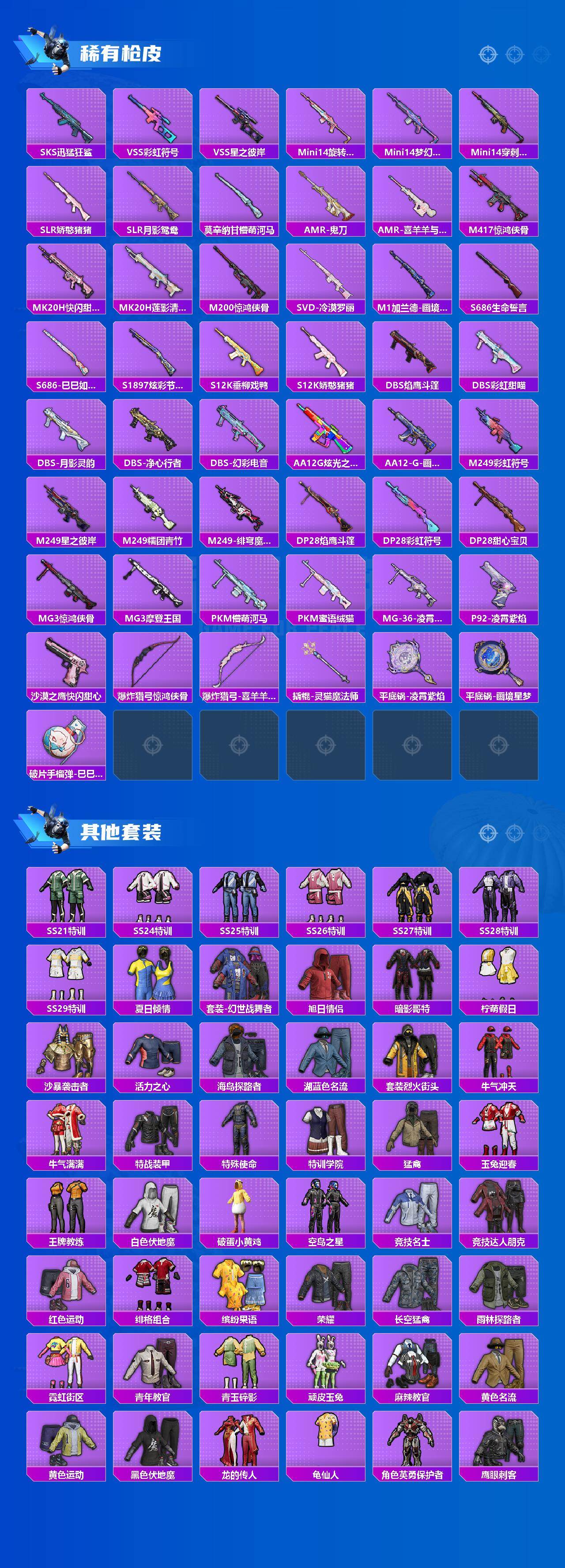 【粉色枪皮】:AKM-炫紫旋律,SCAR-L-魔童闹海 哪吒,M416-心之恋语,M416-灵猫魔法师,蜜獾-异瞳寒姬,AKS-74U-无垠阁,P90-魔童闹海 敖丙,Kar98K-巳巳如意,DP-28-豹影疾电,MG-36-沧焰双生,平底锅-喜羊羊与灰太狼,烟雾弹-猫咪绅士