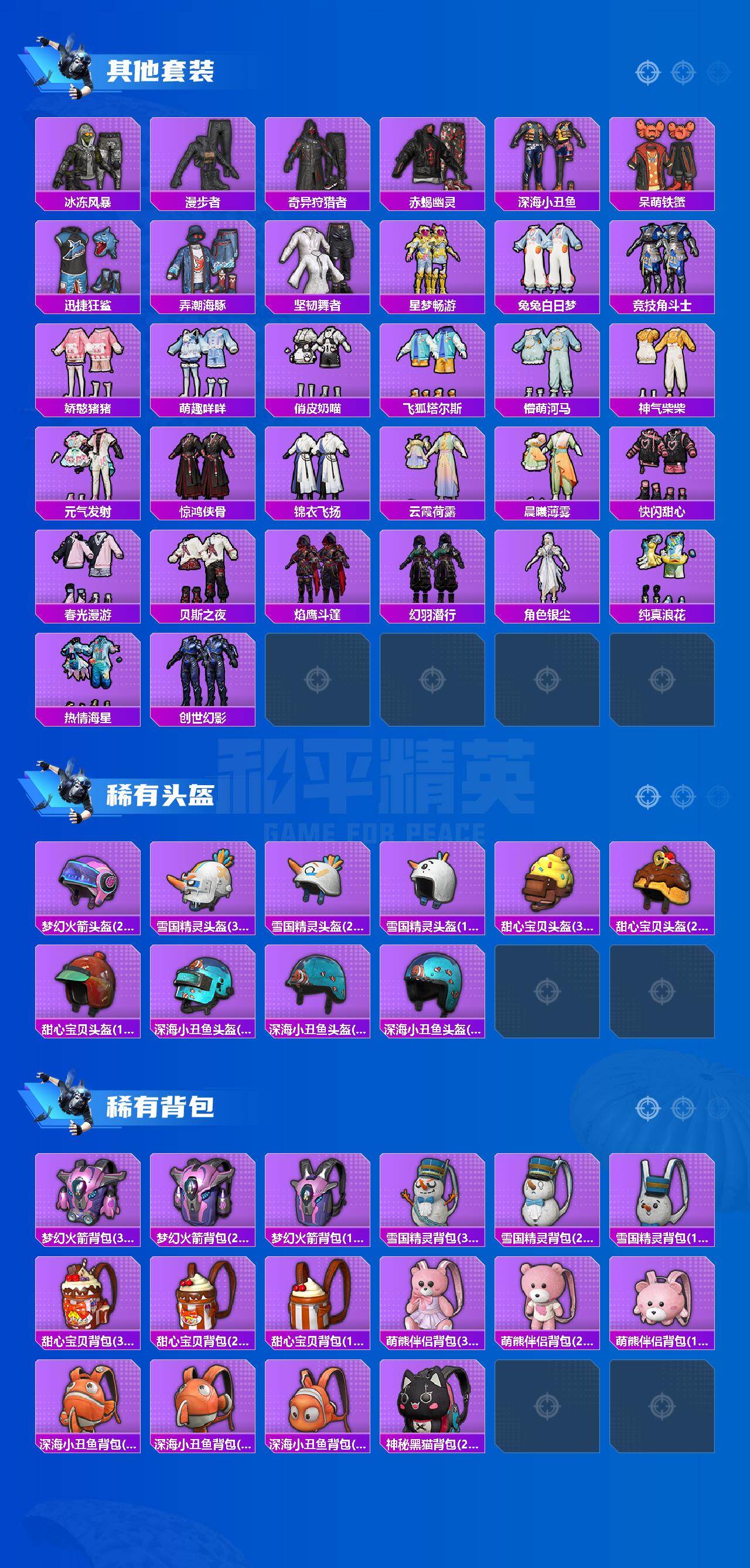 套装-怪诞乔克,套装-雪国幻梦,套装-梦幻火箭,套装-赤蝎幽灵,套装-都市猎人,套装-冥河战士,套装-深海小丑鱼,套装-奇异狩猎者,套装-宝贝奶油派,套装-天使彩虹糖,套装-薄荷物语,套装-炫光之旅,角色-千金淑猫,套装-鹰眼刺客,套装-呆萌铁蟹,套装-迅捷狂鲨,兔兔白日梦套装