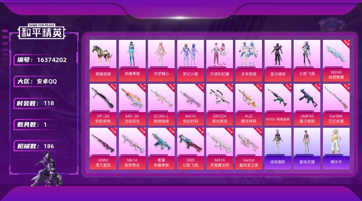 [16374202]安卓 手Q-7粉装-16特效枪-1载具-3粉色飞行器-58017热力值-15王牌印记-118套装-186枪皮【热门品类】:粉装-梦幻火箭,套装-龟仙人【粉色套装】:粉装-天使彩虹糖,粉装-梦幻火箭,粉装-未来歌姬,角色-星云暗核,粉装-幻影飞狐,角色-羊梦糖心,角色-异瞳寒姬【粉色枪皮等级】:SCAR-L-锦绣绵绵(五级),M416-电玩时刻(五级),M416-灵猫魔法师(三级),GROZA-镜光银凌(五级),AUG-暖羊咩咩(五级),M762-青锋波束(五级),蜜獾-异瞳寒姬(四级),UMP45-量子极限(五级),Vector-最终圣卫者(三级),Kar98K-巳巳如意(五级),AWM-湮灭星辰(五级),Mk14-甜梦熊击(五级),DBS-幻影飞狐(四级),M249-绒雪飘舞(六级),DP-28-豹影疾电(五级),MG-36-沧焰双生(五级)【粉色载具】:黑曜夜骑【粉色枪皮】:SCAR-L-锦绣绵绵,M416-电玩时刻,M416-灵猫魔法师,GROZA-镜光银凌,AUG-暖羊咩咩,M762-青锋波束,蜜獾-异瞳寒姬,UMP45-量子极限,Vector-最终圣卫者,Kar98K-巳巳如意,AWM-湮灭星辰,Mk14-甜梦熊击,DBS-幻影飞狐,M249-绒雪飘舞,DP-28-豹影疾电,MG-36-沧焰双生【粉色飞行器】:梦幻火箭飞行器,终晖之翼飞行器