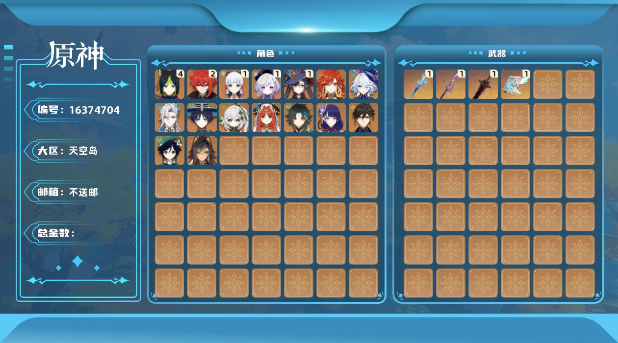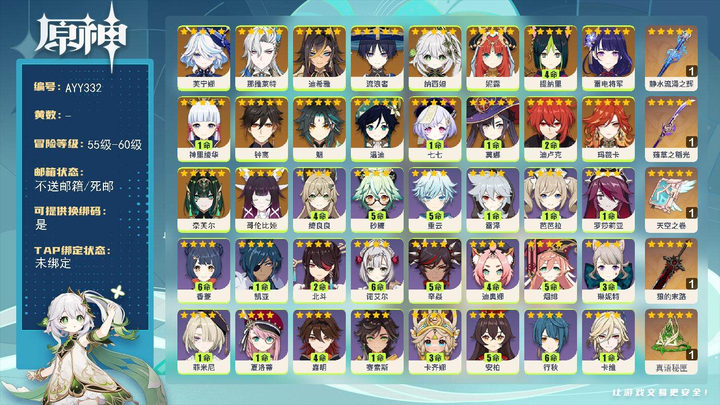 [16374704]【金色角色】:哥伦比娅(0命),奈芙尔(0命),玛薇卡(0命),芙宁娜(0命),那维莱特(0命),迪希雅(0命),流浪者(0命),纳西妲(0命),妮露(0命),提纳里(4命),雷电将军(0命),神里绫华(1命),魈(0命),钟离(0命),温迪(0命),迪卢克(2命),莫娜(1命),七七(1命) 【拥有武器】:真语秘匣(精1),静水流涌之辉(精1),薙草之稻光(精1),天空之卷(精1),狼的末路(精1) 【紫色角色】:爱诺(3命),蓝砚(0命),卡齐娜(3命),赛索斯(0命),嘉明(4命),夏洛蒂(0命),菲米尼(0命),琳妮特(3命),绮良良(4命),卡维(0命),米卡(1命),瑶瑶(满命),珐露珊(3命),莱依拉(4命),坎蒂丝(0命),多莉(4命),柯莱(3命),鹿野院平藏(满命),久岐忍(满命),云堇(满命),五郎(3命),托马(3命),九条裟罗(满命),早柚(2命),烟绯(5命),罗莎莉亚(1命),辛焱(5命),迪奥娜(4命),砂糖(5命),雷泽(1命),菲谢尔(4命),丽莎(1命),北斗(2命),香菱(满命),安柏(5命),班尼特(满命),行秋(满命),芭芭拉(0命),凝光(0命),诺艾尔(满命),凯亚(1命),重云(5命)