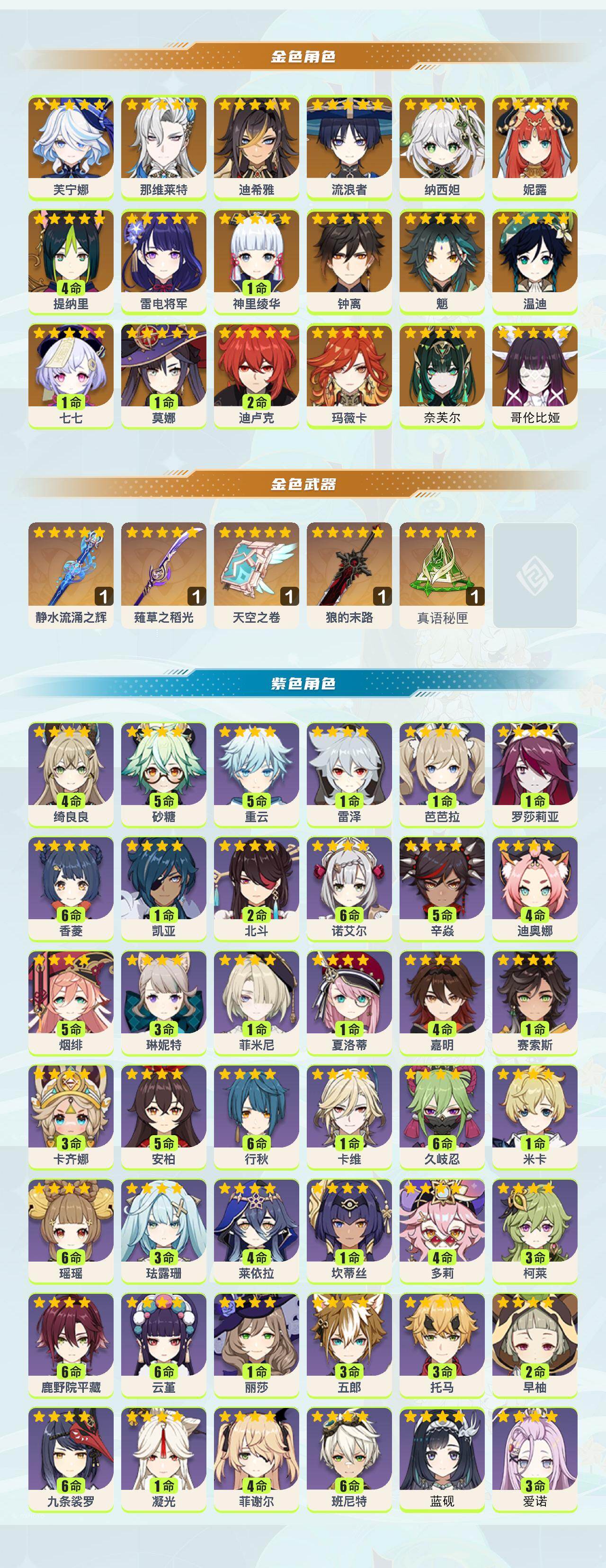 【紫色角色】:爱诺(3命),蓝砚(0命),卡齐娜(3命),赛索斯(0命),嘉明(4命),夏洛蒂(0命),菲米尼(0命),琳妮特(3命),绮良良(4命),卡维(0命),米卡(1命),瑶瑶(满命),珐露珊(3命),莱依拉(4命),坎蒂丝(0命),多莉(4命),柯莱(3命),鹿野院平藏(满命),久岐忍(满命),云堇(满命),五郎(3命),托马(3命),九条裟罗(满命),早柚(2命),烟绯(5命),罗莎莉亚(1命),辛焱(5命),迪奥娜(4命),砂糖(5命),雷泽(1命),菲谢尔(4命),丽莎(1命),北斗(2命),香菱(满命),安柏(5命),班尼特(满命),行秋(满命),芭芭拉(0命),凝光(0命),诺艾尔(满命),凯亚(1命),重云(5命)