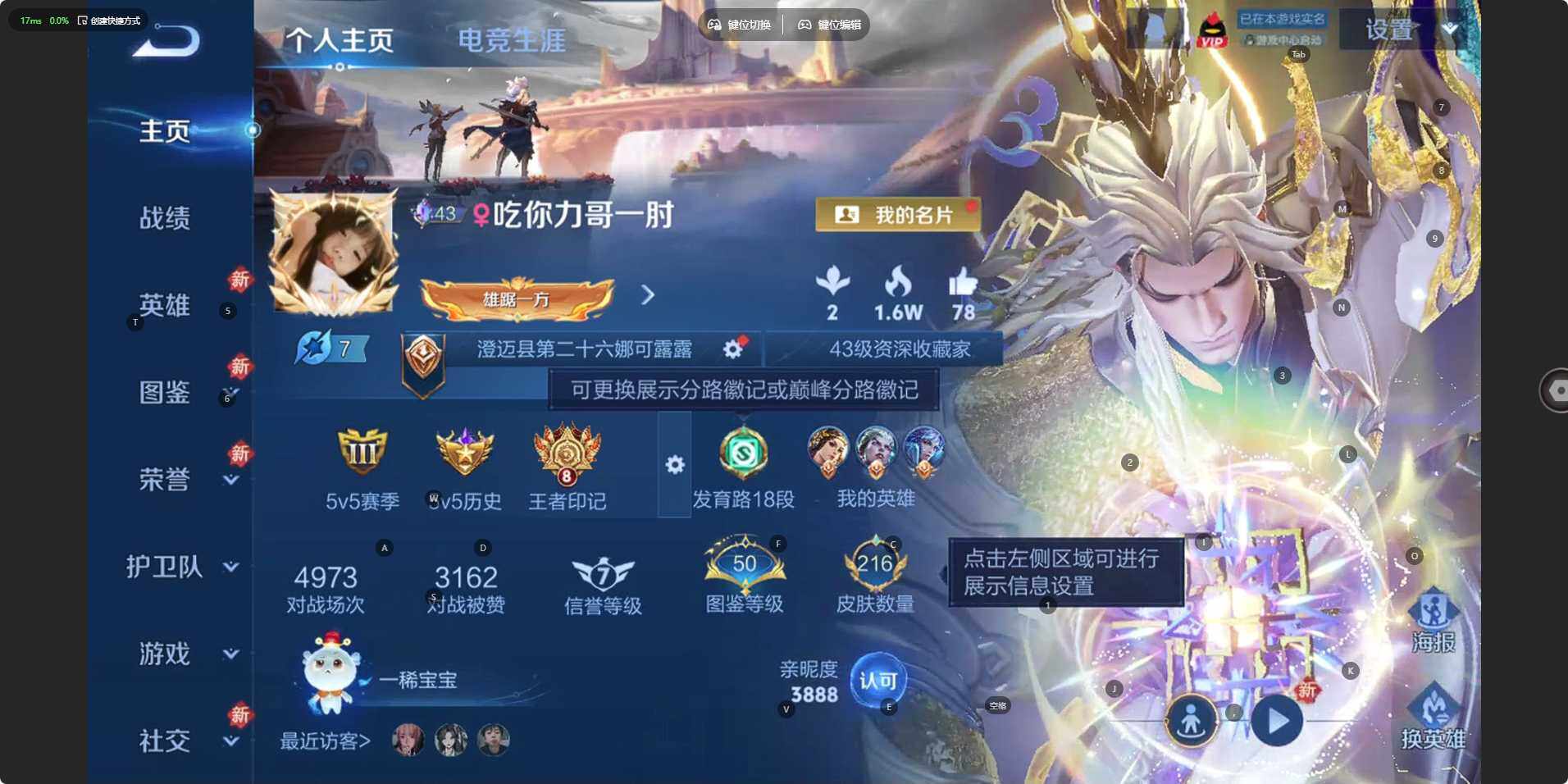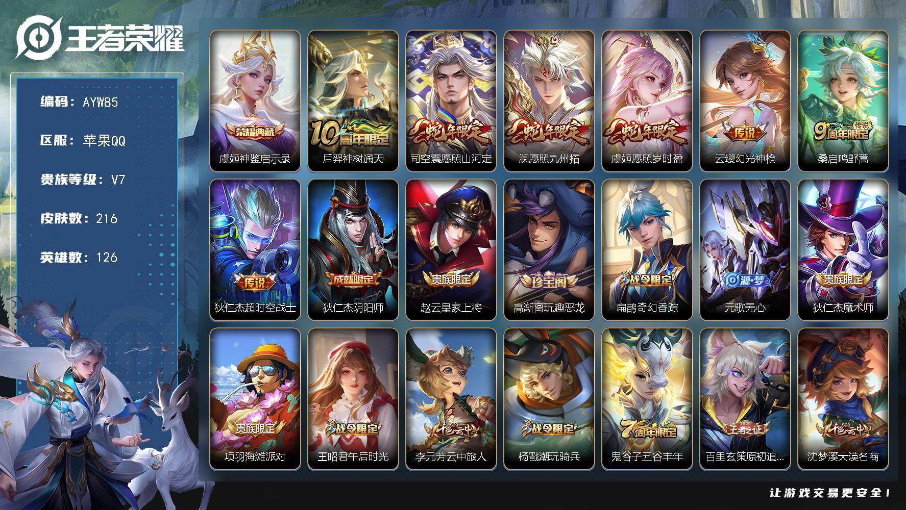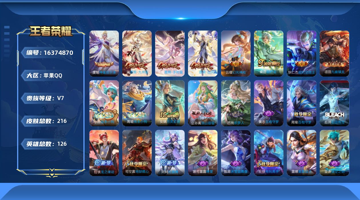[16374870]苹果Q-V7-至尊星耀III段位-126英雄-216皮肤-1典藏皮肤-7传说-63史诗