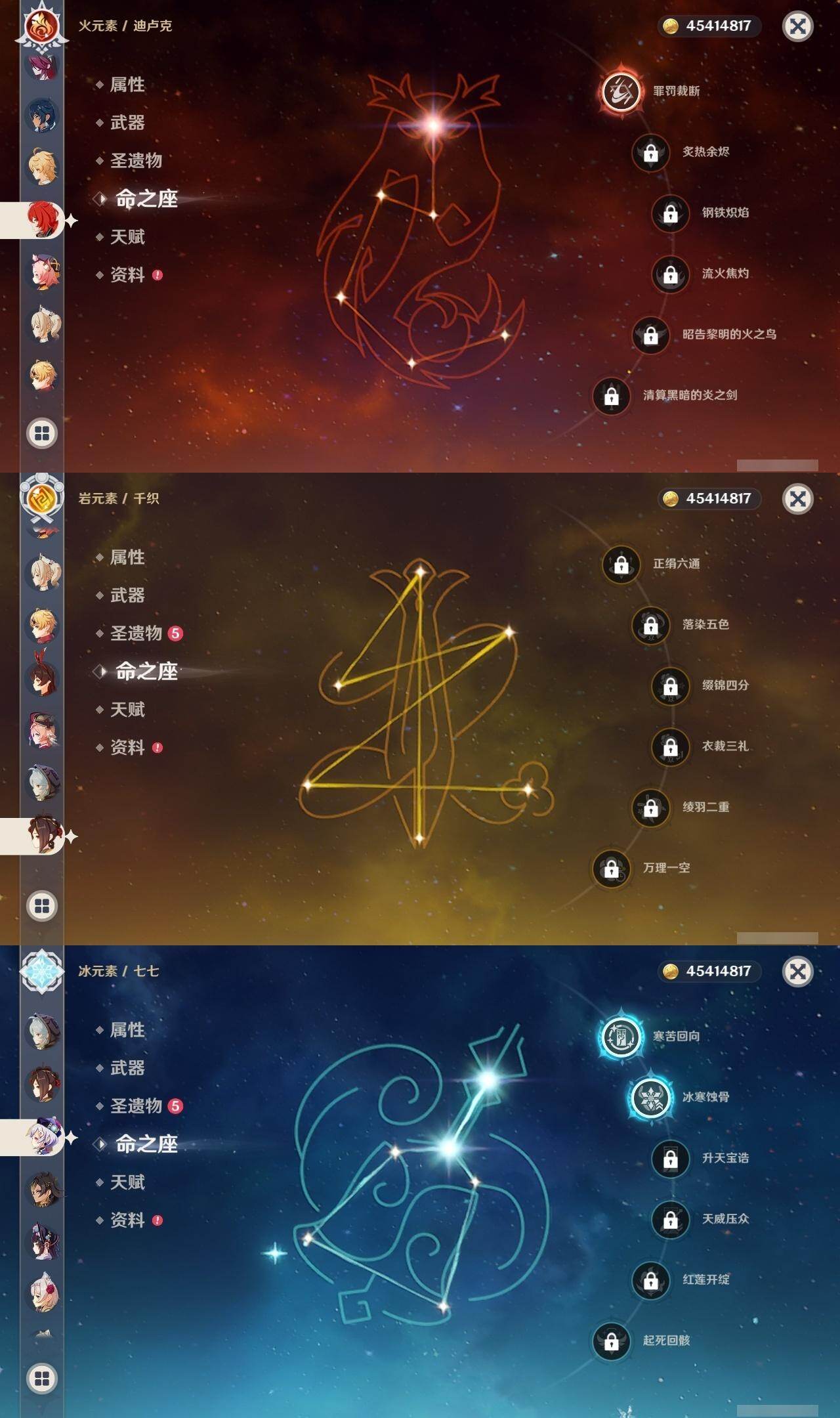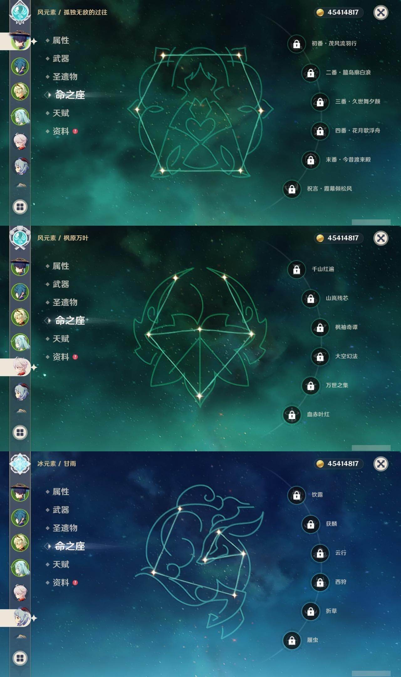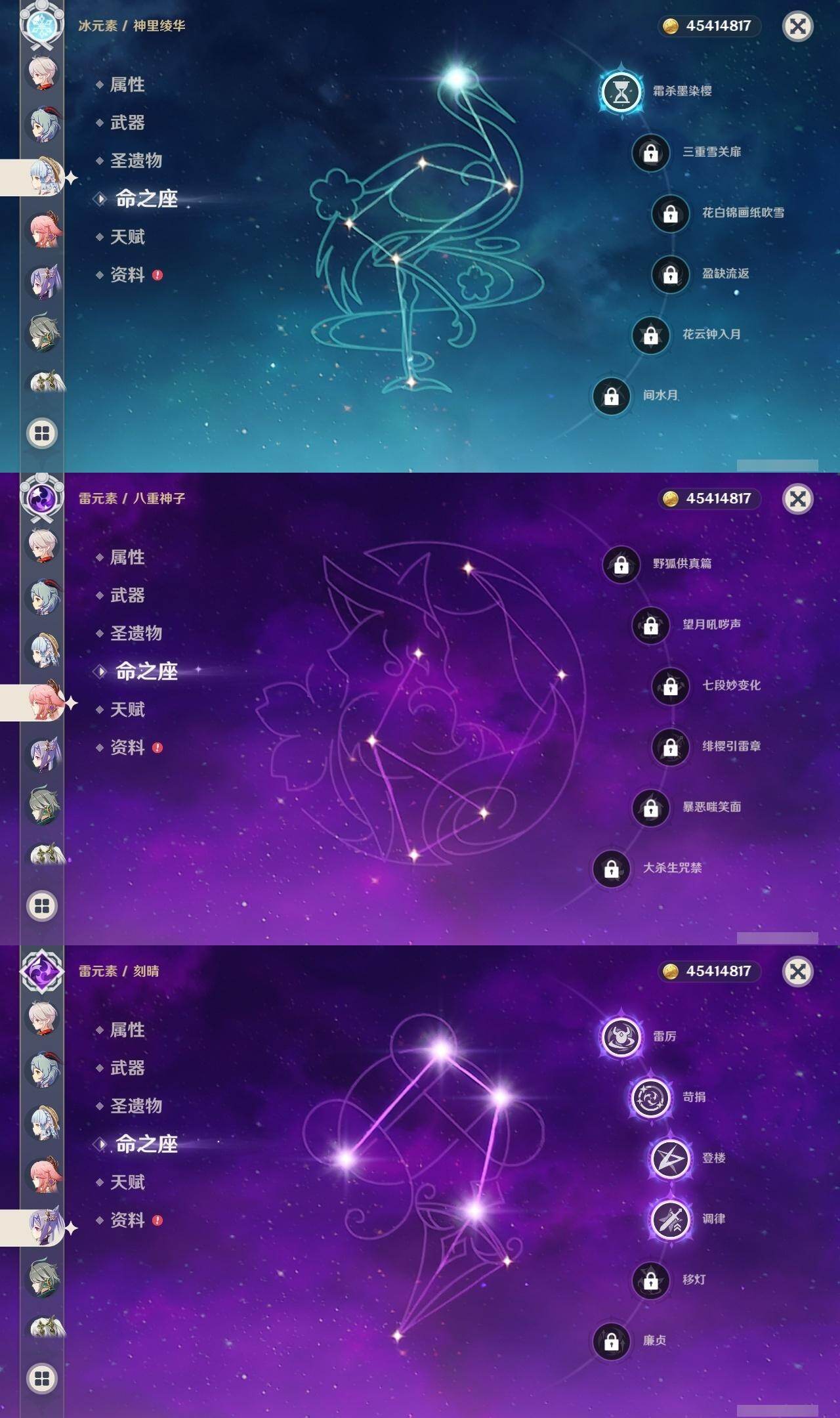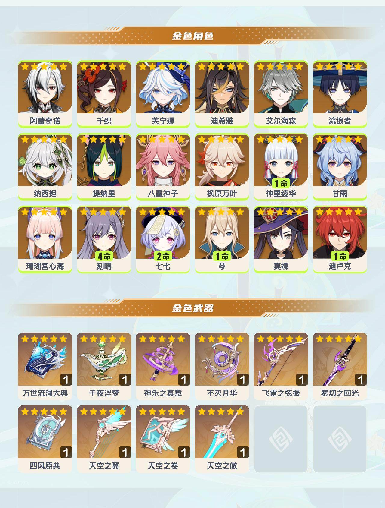 0命阿蕾奇诺,0命千织,0命芙宁娜,0命迪希雅,0命艾尔海森,0命流浪者,0命纳西妲,0命提纳里,0命八重神子,0命枫原万叶,1命神里绫华,0命甘雨,0命珊瑚宫心海,4命刻晴,2命七七,1命琴,0命莫娜,1命迪卢克,精1万世流涌大典,精1千夜浮梦,精1神乐之真意,精1不灭月华,精1飞雷之弦振,精1雾切之回光,精1四风原典,精1天空之翼,精1天空之卷,精1天空之傲