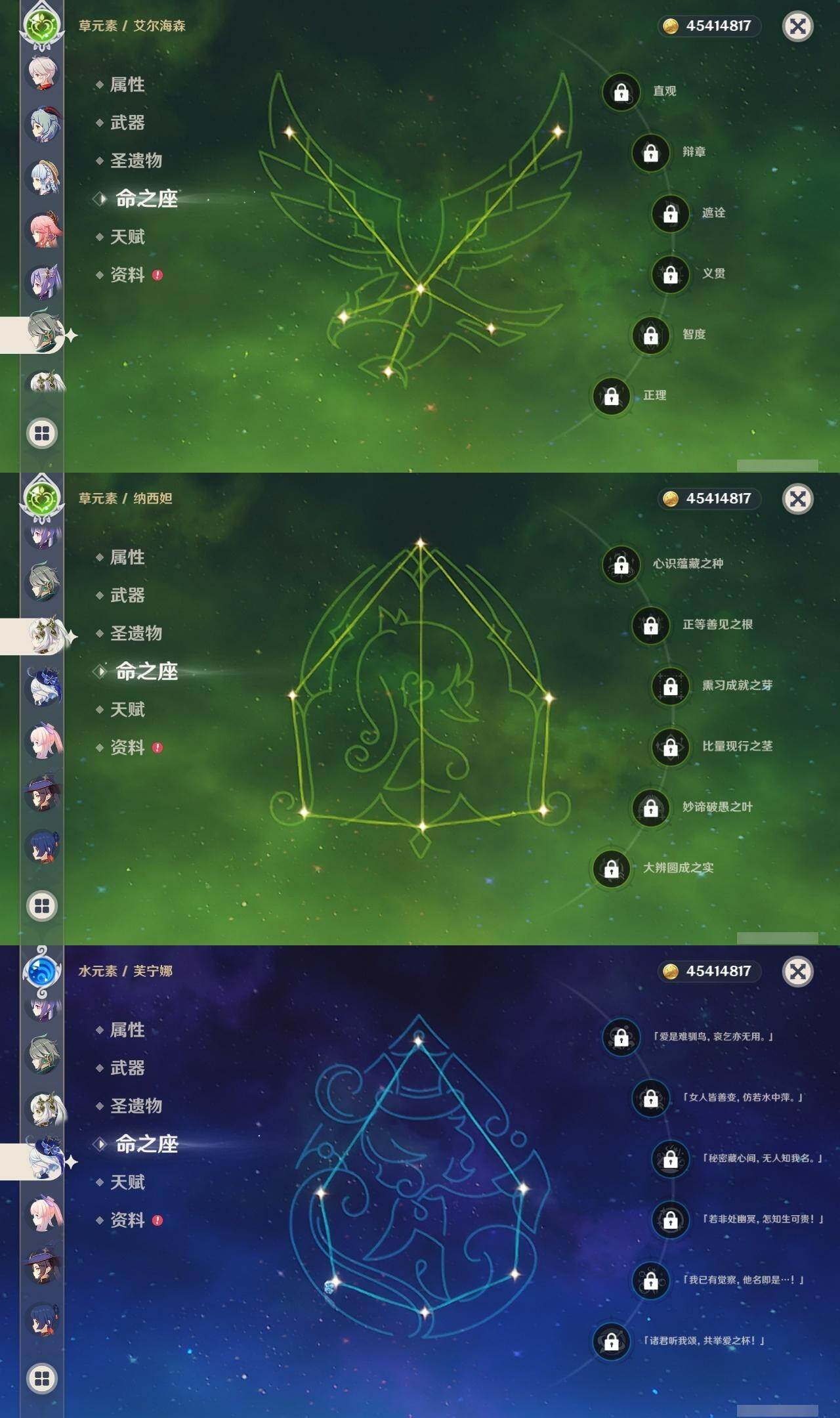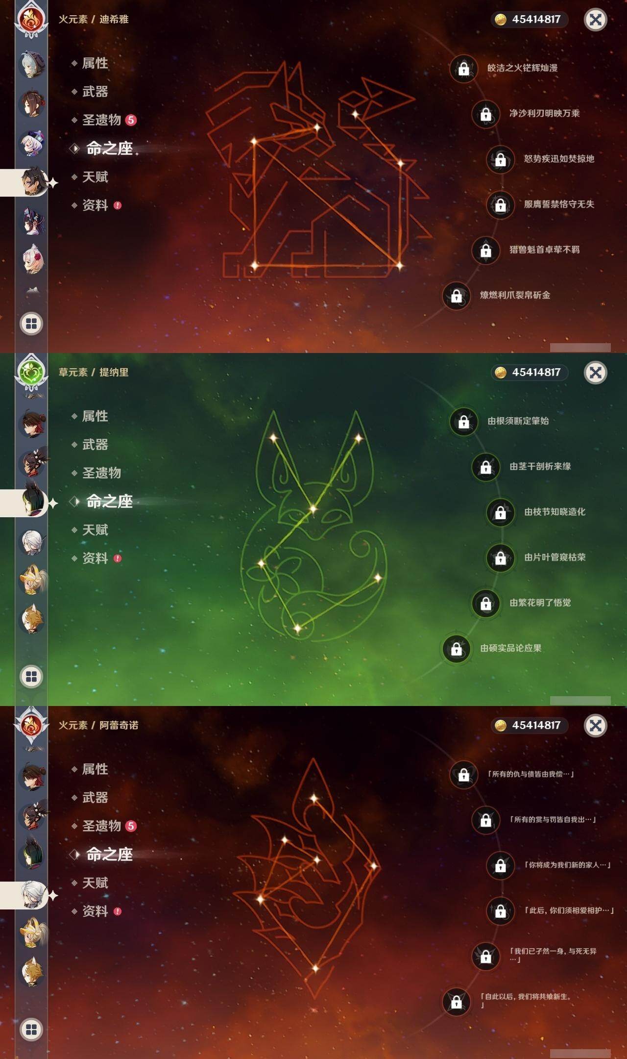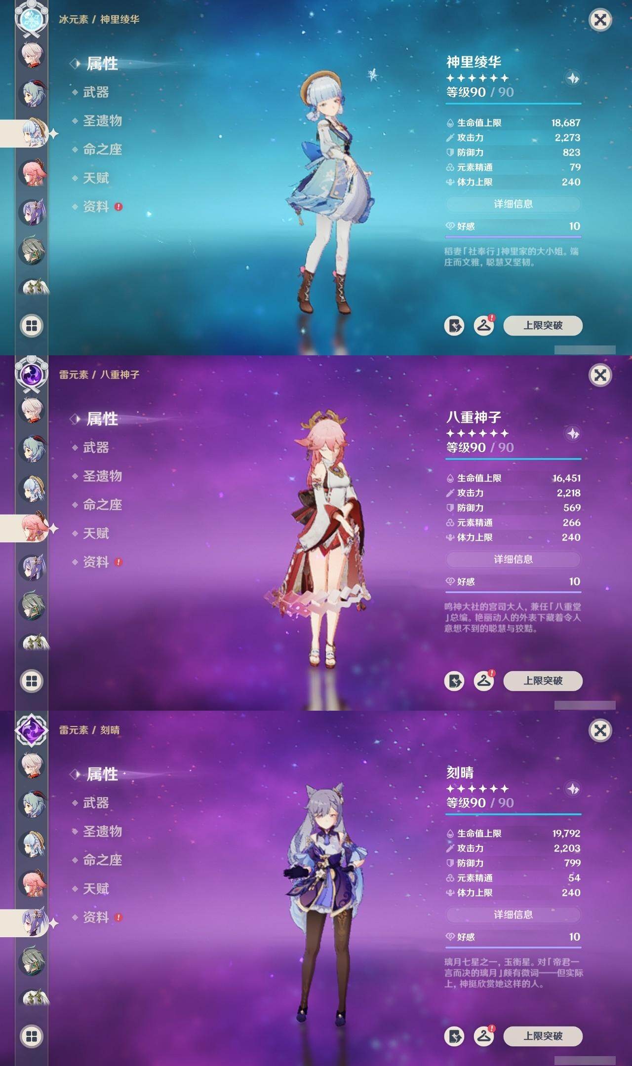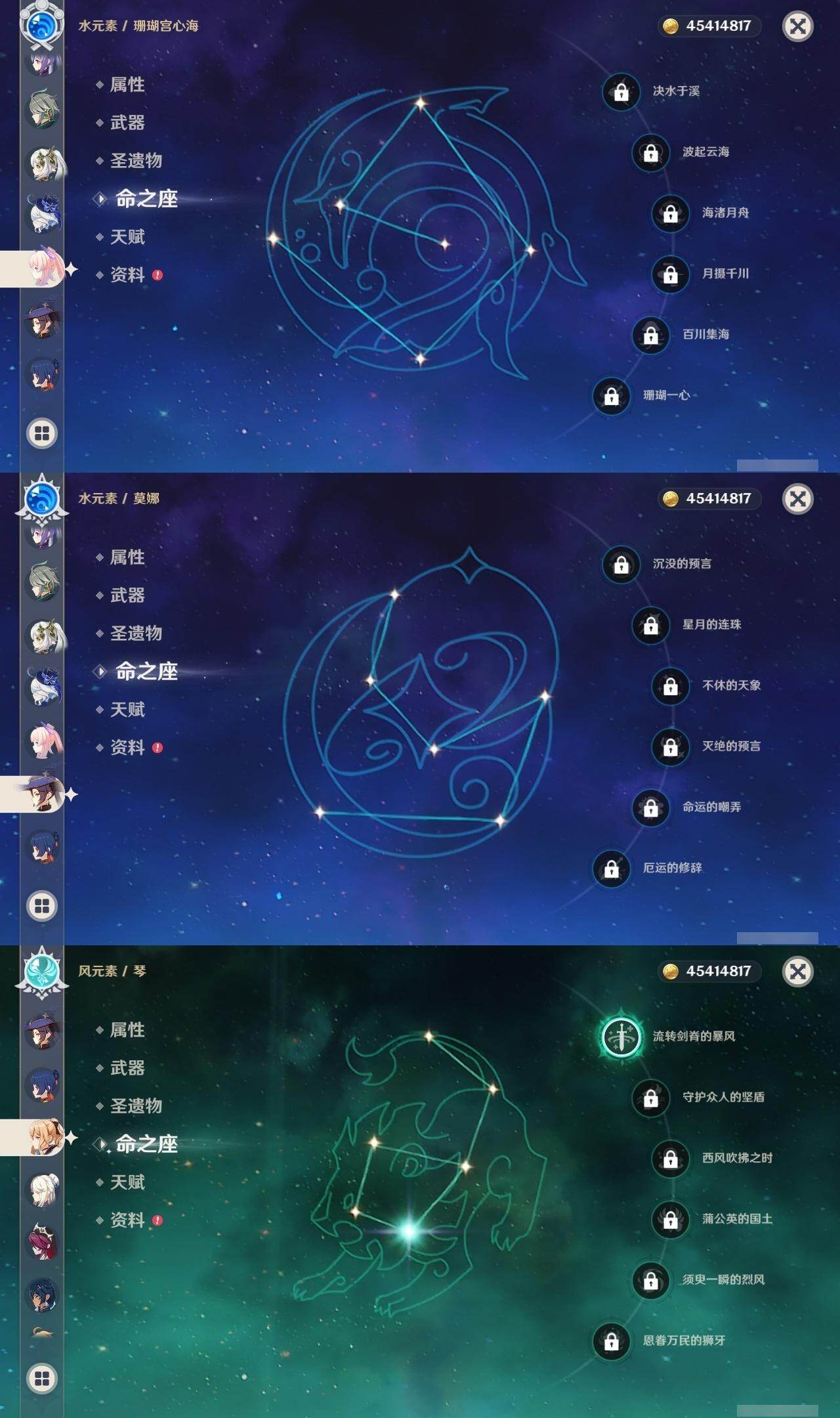 0命阿蕾奇诺,0命千织,0命芙宁娜,0命迪希雅,0命艾尔海森,0命流浪者,0命纳西妲,0命提纳里,0命八重神子,0命枫原万叶,1命神里绫华,0命甘雨,0命珊瑚宫心海,4命刻晴,2命七七,1命琴,0命莫娜,1命迪卢克,精1万世流涌大典,精1千夜浮梦,精1神乐之真意,精1不灭月华,精1飞雷之弦振,精1雾切之回光,精1四风原典,精1天空之翼,精1天空之卷,精1天空之傲