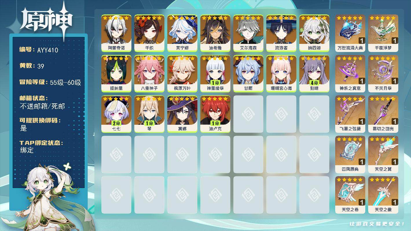 [16375079]60级/39黄/男主/18个五星角色/12个五星武器 0命阿蕾奇诺,0命千织,0命芙宁娜,0命迪希雅,0命艾尔海森,0命流浪者,0命纳西妲,0命提纳里,0命八重神子,0命枫原万叶,1命神里绫华,0命甘雨,0命珊瑚宫心海,4命刻晴,2命七七,1命琴,0命莫娜,1命迪卢克,精1万世流涌大典,精1千夜浮梦,精1神乐之真意,精1不灭月华,精1飞雷之弦振,精1雾切之回光,精1四风原典,精1天空之翼,精1天空之卷,精1天空之傲