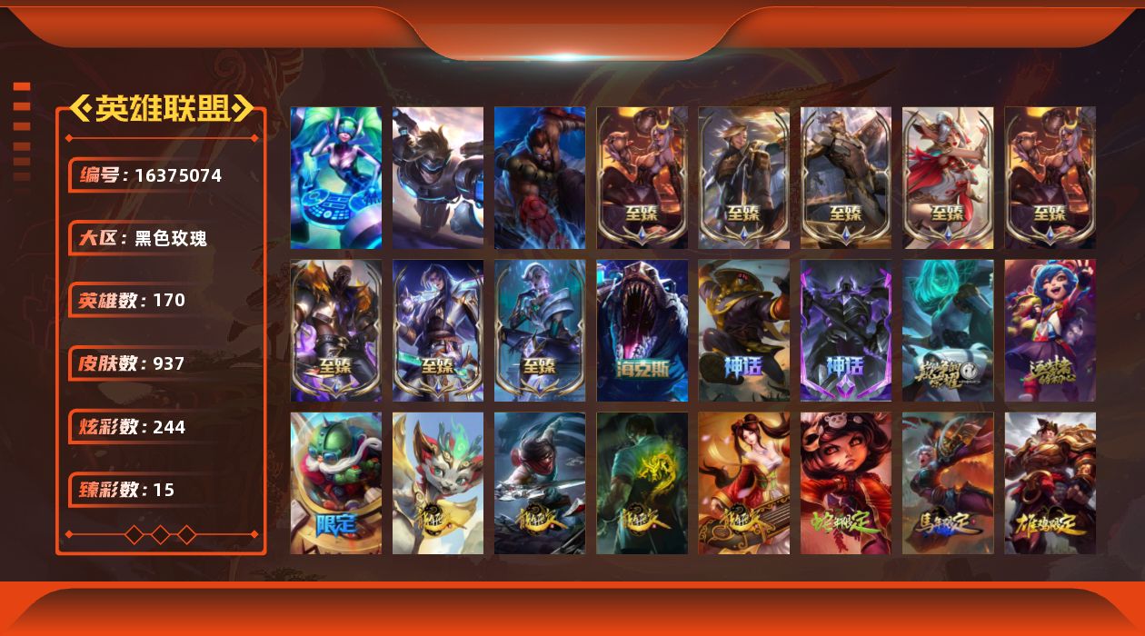 [16375074]未定级段位-170英雄-937皮肤-244炫彩-3终极-13神话-155限定-86传说-205史诗