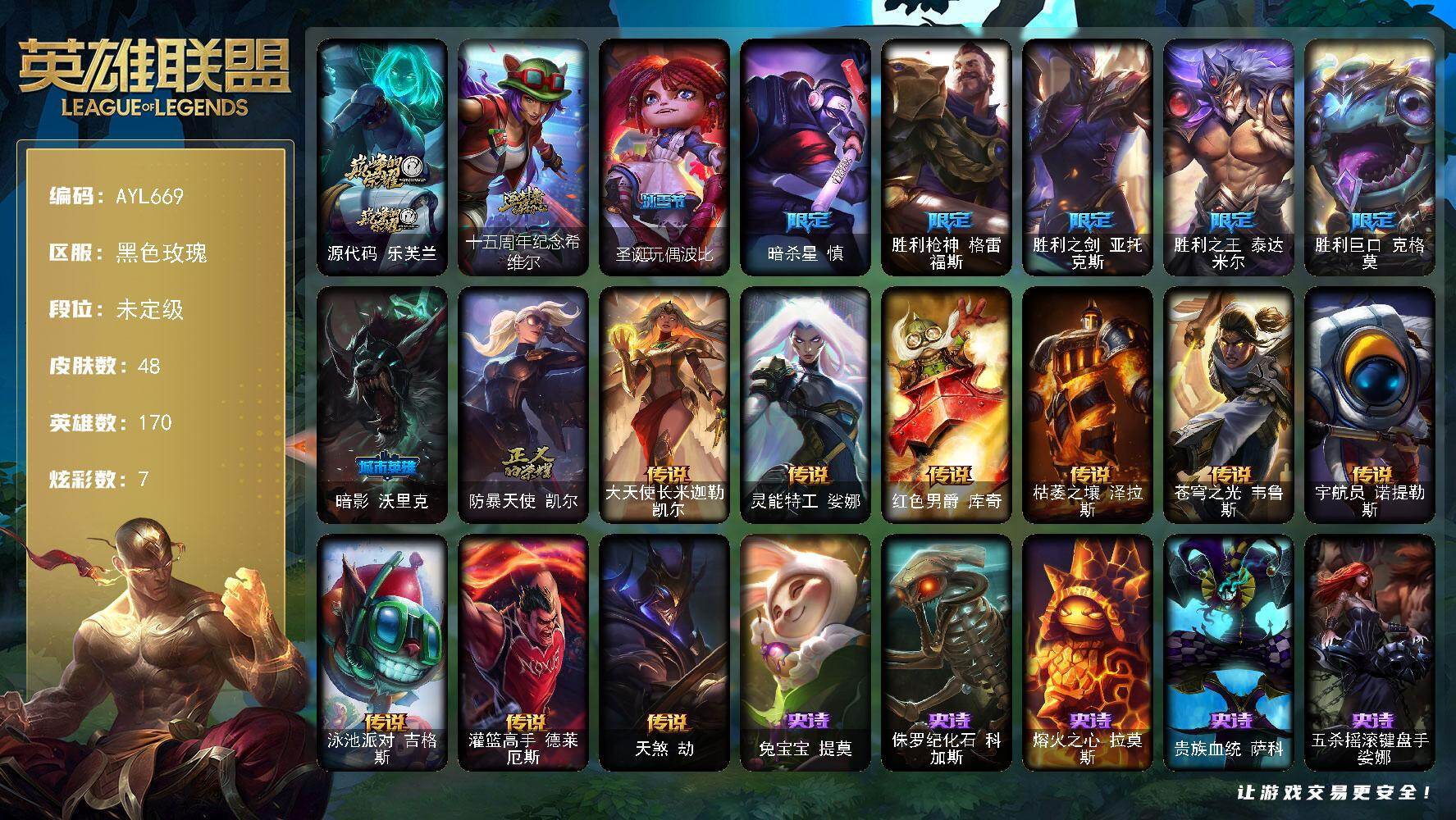 [16375206]【店主推荐捡漏号】未定级段位-170英雄-48皮肤-7炫彩-0终极-2神话-8限定-9传说-12史诗 【神话皮肤】:源代码乐芙兰,十五周年纪念希维尔 【冰雪限定】:圣诞玩偶波比 【限定皮肤】:暗杀星慎,胜利枪神格雷福斯,胜利之剑亚托克斯,胜利之王泰达米尔,胜利巨口克格莫,暗影沃里克,防暴天使凯尔 【传说皮肤】:大天使长米迦勒凯尔,灵能特工娑娜,红色男爵库奇,枯萎之壤泽拉斯,苍穹之光韦鲁斯,宇航员诺提勒斯,泳池派对吉格斯,灌篮高手德莱厄斯,天煞劫 【史诗皮肤】:兔宝宝提莫,侏罗纪化石科加斯,熔火之心拉莫斯,贵族血统萨科,五杀摇滚键盘手娑娜,穿着正装的恶魔维迦,斗战胜佛孙悟空,战地机甲斯卡纳,帝王斑蝶克格莫,白色死神韦鲁斯,源代码丽桑卓,血羽凤凰奎因 【王者皮肤】:西部牛仔崔斯特 【勇士皮肤】:冰河时代奥拉夫,亮丽女神希维尔 【其他皮肤1】:潮流女王乐芙兰,荒野镖客阿利斯塔,美国大叔瑞兹,孤勇之隐瑞兹,约德尔海贼团崔丝塔娜,北风冻原图奇,暴风女神迦娜,垃圾场特朗德尔,石破天惊墨菲特,古拉加斯碎桶者,荣誉使者玛尔扎哈,雷霆领主沃利贝尔,任性学霸艾克,永恒之森阿兹尔