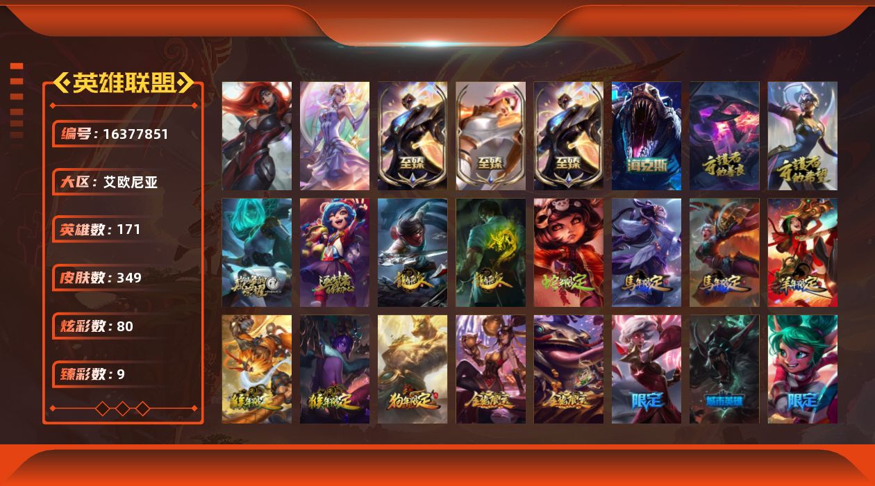 [16377851]【特价出售/店主推荐】未定级段位-171英雄-349皮肤-80炫彩-2终极-8神话-56限定-34传说-87史诗