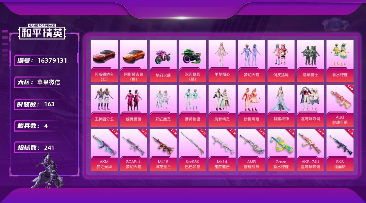 [16379131]【特价出售/店主推荐】苹果 微信-13粉装-13特效枪-4载具-3粉色飞行器-94456热力值-3王牌印记-163套装-241枪皮【热门品类】:粉装-梦幻火箭,角色-六号稻草人【粉色套装】:粉装-梦幻火箭,粉装-俏皮狐尾,粉装-翡翠骑士,粉装-香水柠檬,粉装-王牌四分卫,粉装-蝶舞蔷薇,粉装-彩虹鹿灵,粉装-薄荷物语,粉装-筑梦精灵,粉装-妙趣可丽,角色-智耀战神,粉装-星穹咏叹调,角色-羊梦糖心【粉色枪皮等级】:AKM-梦之光华(五级),SCAR-L-梦幻火箭(五级),M416-风花雪月(五级),GROZA-香水柠檬(四级),AUG-妙趣可丽(六级),AKS-74U-星穹咏叹调(四级),Kar98K-巳巳如意(五级),Kar98K-圣域龙灵(三级),SKS-诡面斩(四级),Mini14-荧光虫舞(四级),Mk14-甜梦熊击(五级),AMR-智耀战神(五级),DP-28-枪炮玫瑰(四级)【粉色载具】:阿斯顿马丁DBS(红),阿斯顿马丁DBX(橙),双人摩托-梦幻火箭,双人摩托-双刃魅影(绿),空客H135-蔚蓝之翼,僚机-圣域龙宝【粉色枪皮】:AKM-梦之光华,SCAR-L-梦幻火箭,M416-风花雪月,GROZA-香水柠檬,AUG-妙趣可丽,AKS-74U-星穹咏叹调,Kar98K-巳巳如意,Kar98K-圣域龙灵,SKS-诡面斩,Mini14-荧光虫舞,Mk14-甜梦熊击,AMR-智耀战神,DP-28-枪炮玫瑰【粉色飞行器】:梦幻火箭飞行器,阿狸红飞行器,圣域金龙飞行器