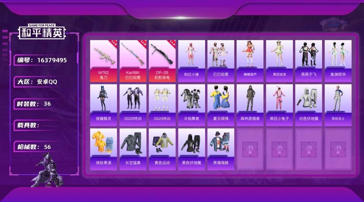[16379495]【店主推荐捡漏号!可直接换绑】安卓 手Q-0粉装-3特效枪-0载具-0粉色飞行器-14218热力值-4王牌印记-36套装-56枪皮【热门品类】:套装-粉红小猪【粉色枪皮等级】:M762-鬼刀(五级),Kar98K-巳巳如意(五级),DP-28-豹影疾电(三级)【粉色枪皮】:M762-鬼刀,Kar98K-巳巳如意,DP-28-豹影疾电