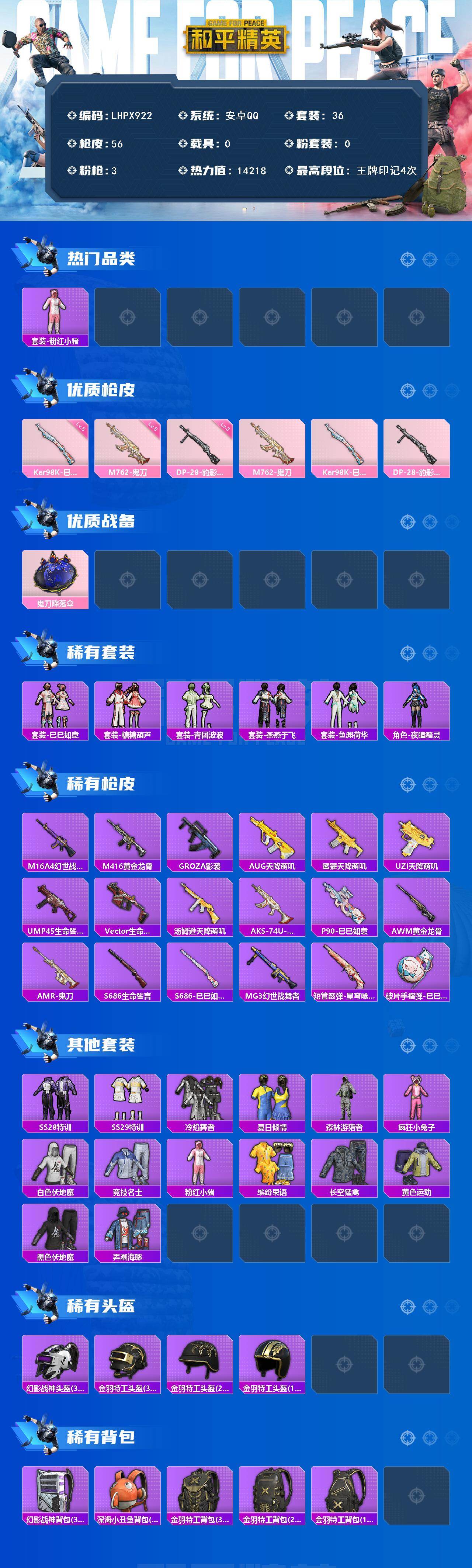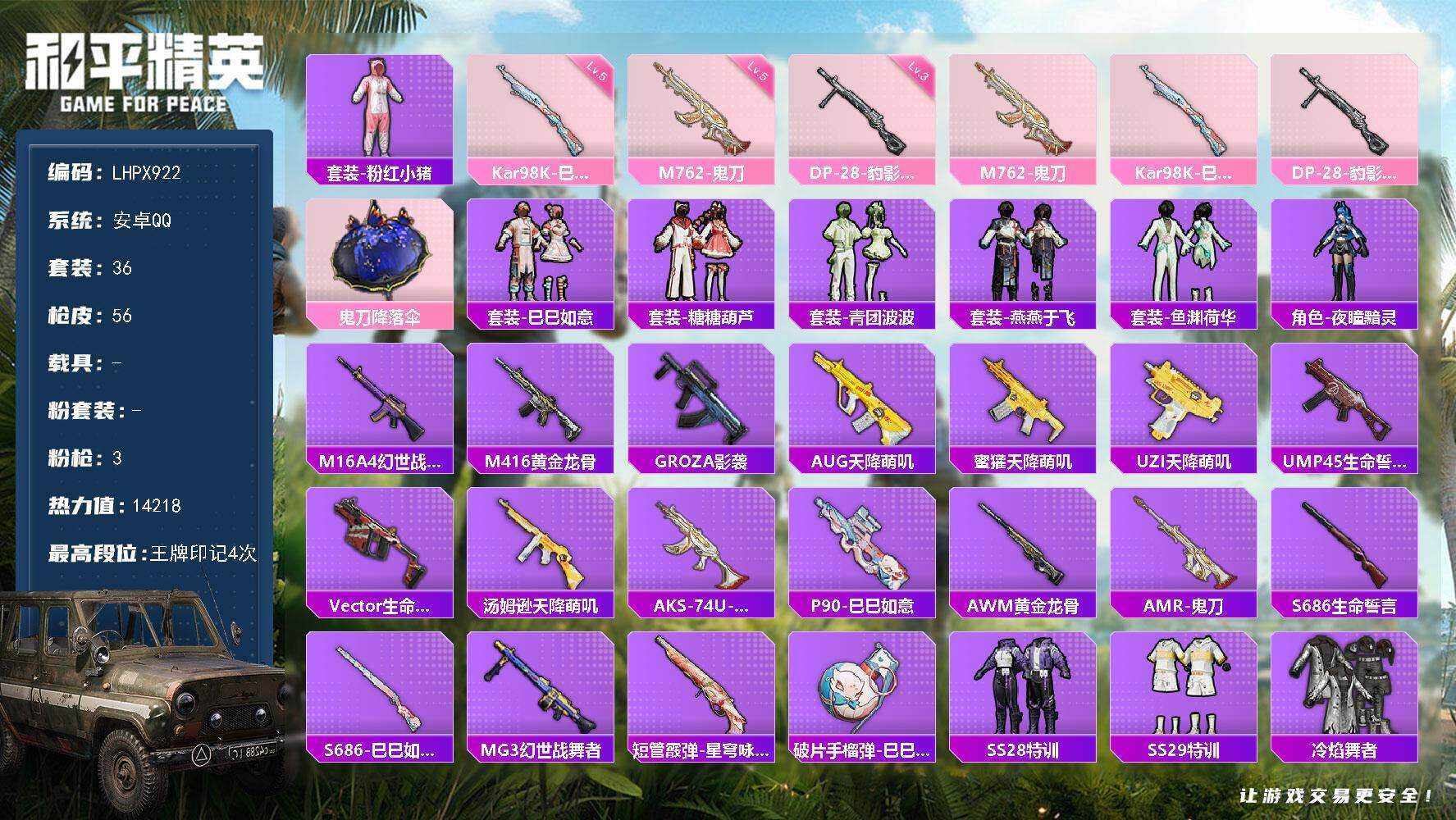 [16379494]【店主推荐捡漏号!可直接换绑】安卓 手Q-0粉装-3特效枪-0载具-0粉色飞行器-14218热力值-4王牌印记-36套装-56枪皮【热门品类】:套装-粉红小猪【粉色枪皮等级】:M762-鬼刀(五级),Kar98K-巳巳如意(五级),DP-28-豹影疾电(三级)【粉色枪皮】:M762-鬼刀,Kar98K-巳巳如意,DP-28-豹影疾电