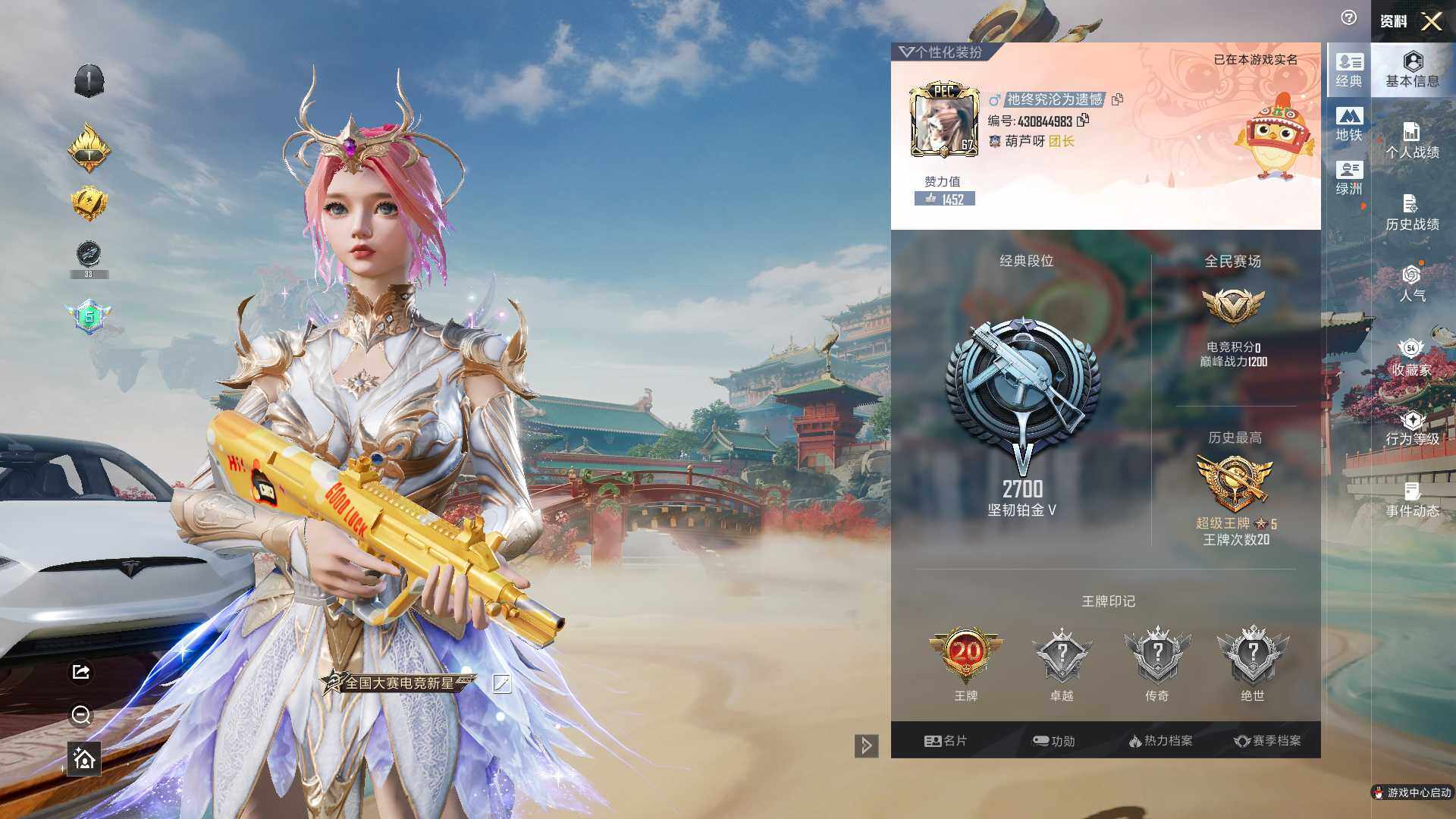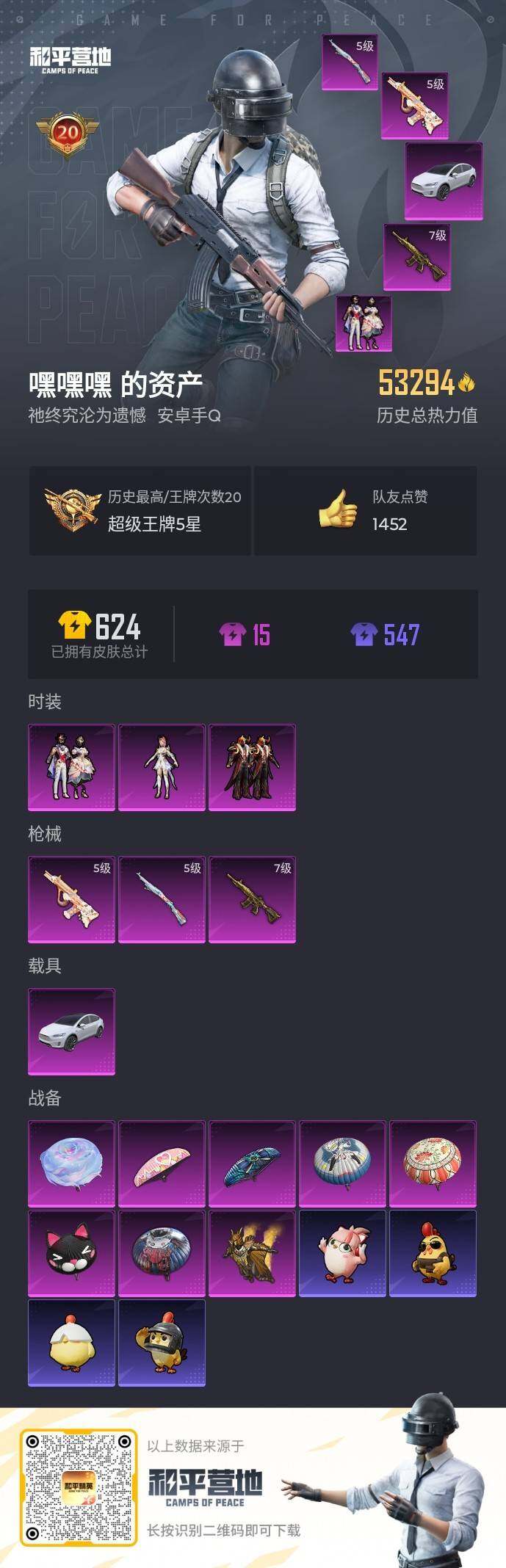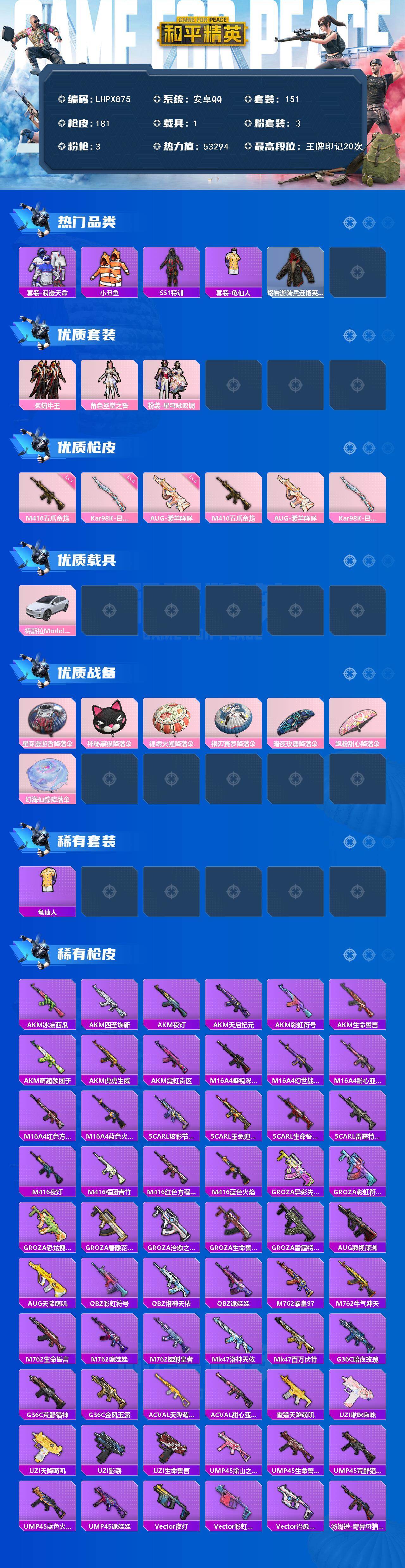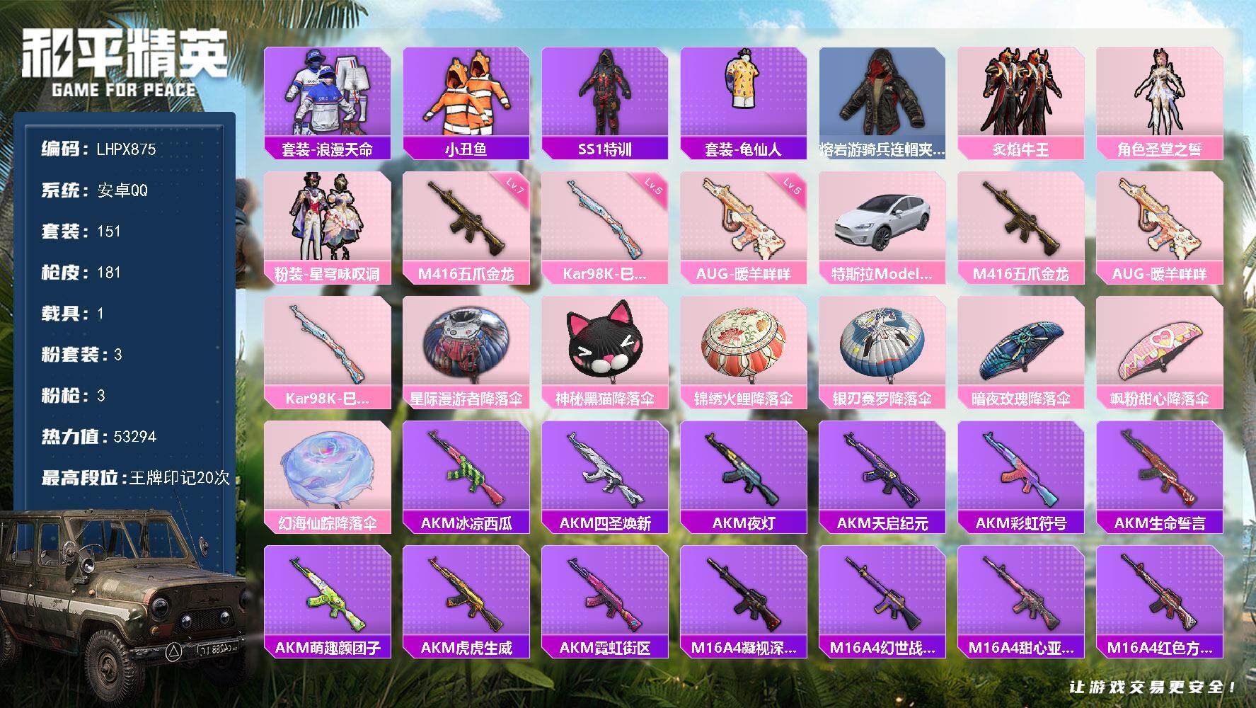 [16379588]【店主推荐捡漏号!可直接换绑】安卓 手Q-3粉装-3特效枪-1载具-1粉色飞行器-53294热力值-20王牌印记-151套装-181枪皮【热门品类】:套装-浪漫天命,套装-小丑鱼,套装-SS1特训,套装-龟仙人,熔岩游骑兵连帽夹克【粉色套装】:粉装-炙焰牛王,角色-圣堂之誓,粉装-星穹咏叹调【粉色枪皮等级】:M416-五爪金龙(七级),AUG-暖羊咩咩(五级),Kar98K-巳巳如意(五级)【粉色载具】:特斯拉Model X(珍珠白)【粉色枪皮】:M416-五爪金龙,AUG-暖羊咩咩,Kar98K-巳巳如意