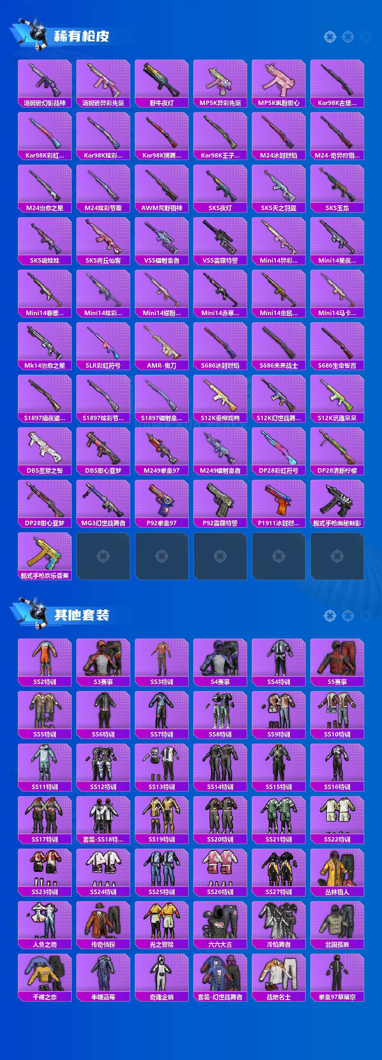 - [11657291]总资产:82.5M 1干员外观 1近战传说 25传说枪械 哈夫币:1.338K 顶级安全箱(3×3)9.15号到期 可二次 可修改实名 优质装备:近战-影锋,顶级安全箱(3x3) 烽火地带段位:黑鹰 全面战场段位:将军 传说武器皮肤:SCAR-H战斗步枪-水墨云图,M1014霰弹枪-影锋,AWM狙击步枪-影锋,SCAR-H战斗步枪-铁艺苍穹,SV-98狙击步枪-极速狂飙,Ash-12战斗步枪-极速狂飙,K437突击步枪-极速狂飙,SMG45冲锋枪-骑士,G18-飞虎,UZI冲锋枪-特斯拉线圈,AWM狙击步枪-捞点薯条,腾龙突击步枪-捞点薯条,93R-捞点薯条,AK-12突击步枪-特斯拉线圈,SR-3M紧凑突击步枪-特斯拉线圈,勇士冲锋枪-能天使-午夜邮差,Vector冲锋枪-能天使-午夜邮差,复合弓-黑-天际线,725双管霰弹枪-送葬人-无题密令,M4A1突击步枪-阿米娅,CAR-15突击步枪-阿米娅,AK-12突击步枪-夜鹰,M4A1突击步枪-蚀金玫瑰,CAR-15突击步枪-黑鹰坠落 史诗武器皮肤:Vector冲锋枪-潜袭者,K416突击步枪-暗鸦,M1014霰弹枪-暗鸦,P90冲锋枪-暗鸦,K416突击步枪-潜袭者,M1014霰弹枪-潜袭者,AK-12突击步枪-原型机(典藏),QBZ95-1突击步枪-ACE,AUG突击步枪-特勤执行,M4A1突击步枪-特勤执行,Vector冲锋枪-红色彗星,PTR-32战斗步枪-ACE,SKS射手步枪-ACE,AUG突击步枪-蝮蛇,M700狙击步枪-蝮蛇,PKM通用机枪-蝮蛇,SR-25射手步枪-战场英杰,Ash-12战斗步枪-守夜人,M16A4突击步枪-竞赛选手,P90冲锋枪-暗影猎手,PKM通用机枪-守夜人,AS Val突击步枪-尖端治疗,M700狙击步枪-守夜人,SG552突击步枪-尖端治疗,SR-25射手步枪-尖端治疗,M1014霰弹枪-林中猎手,MP5冲锋枪-深海恐惧,勇士冲锋枪-深海恐惧,SG552突击步枪-深海恐惧,AKM突击步枪-林中猎手,.357左轮-幸运时刻,QJB201轻机枪-Old Habits,QCQ171冲锋枪-禁卫,SR-3M紧凑突击步枪-纷争,SV-98狙击步枪-林中猎手,PTR-32突击步枪-英雄,AS Val突击步枪-典狱官,PKM通用机枪-荒野求生,M250通用机枪-囚徒