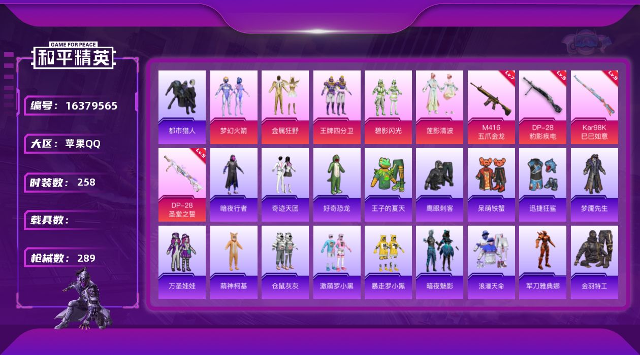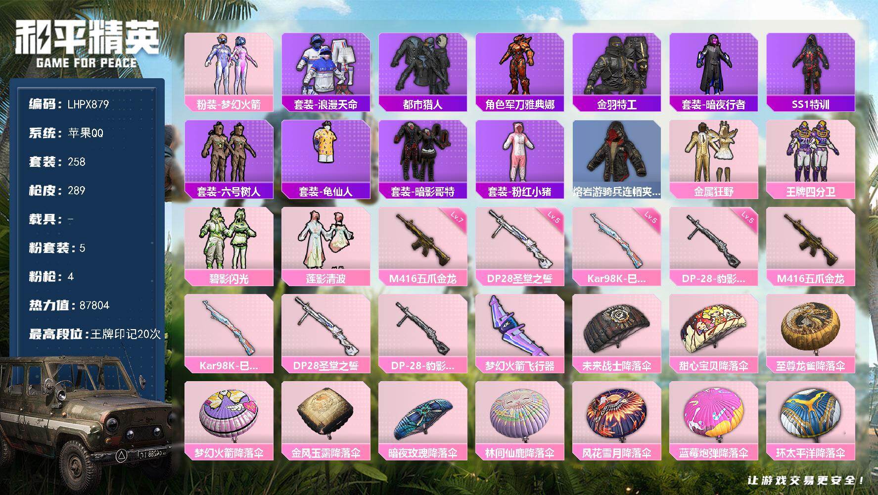 [16379565]【店主推荐捡漏号!可直接换绑】苹果 手Q-5粉装-4特效枪-0载具-1粉色飞行器-87804热力值-20王牌印记-258套装-289枪皮【热门品类】:粉装-梦幻火箭,套装-浪漫天命,套装-都市猎人,角色-军刀雅典娜,套装-金羽特工,套装-暗夜行者,套装-SS1特训,套装-六号树人,套装-龟仙人,套装-暗影哥特,套装-粉红小猪,熔岩游骑兵连帽夹克【粉色套装】:粉装-梦幻火箭,粉装-金属狂野,粉装-王牌四分卫,粉装-碧影闪光,粉装-莲影清波【粉色枪皮等级】:M416-五爪金龙(七级),Kar98K-巳巳如意(五级),DP-28-圣堂之誓(五级),DP-28-豹影疾电(五级)【粉色枪皮】:M416-五爪金龙,Kar98K-巳巳如意,DP-28-圣堂之誓,DP-28-豹影疾电【粉色飞行器】:梦幻火箭飞行器