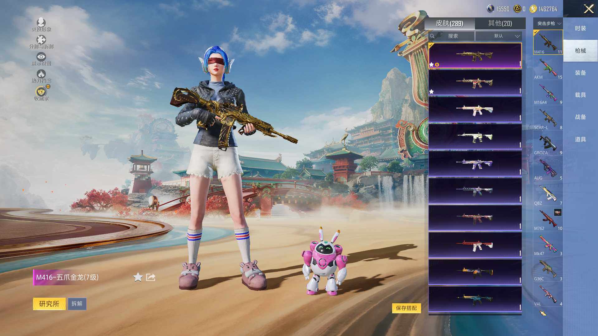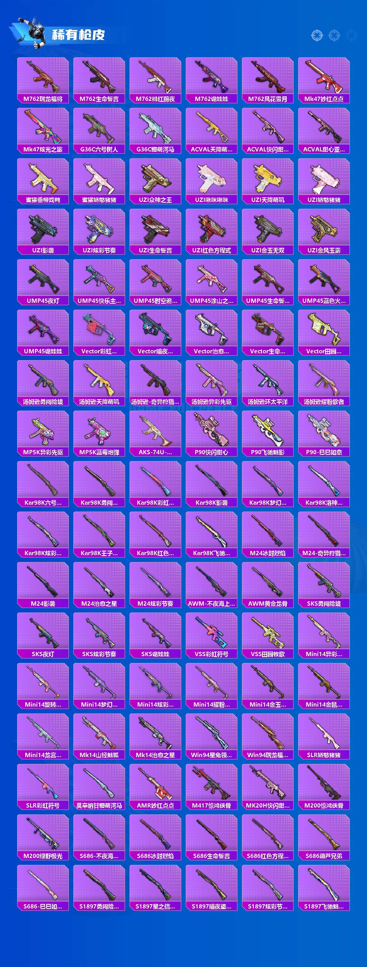 AKM-缤纷海域,M416-魔法学院,GROZA-林间仙鹿,M762-奇异狩猎者,M762-瑞龙福将,M762-风花雪月,M24-奇异狩猎者,AWM-黄金龙骨