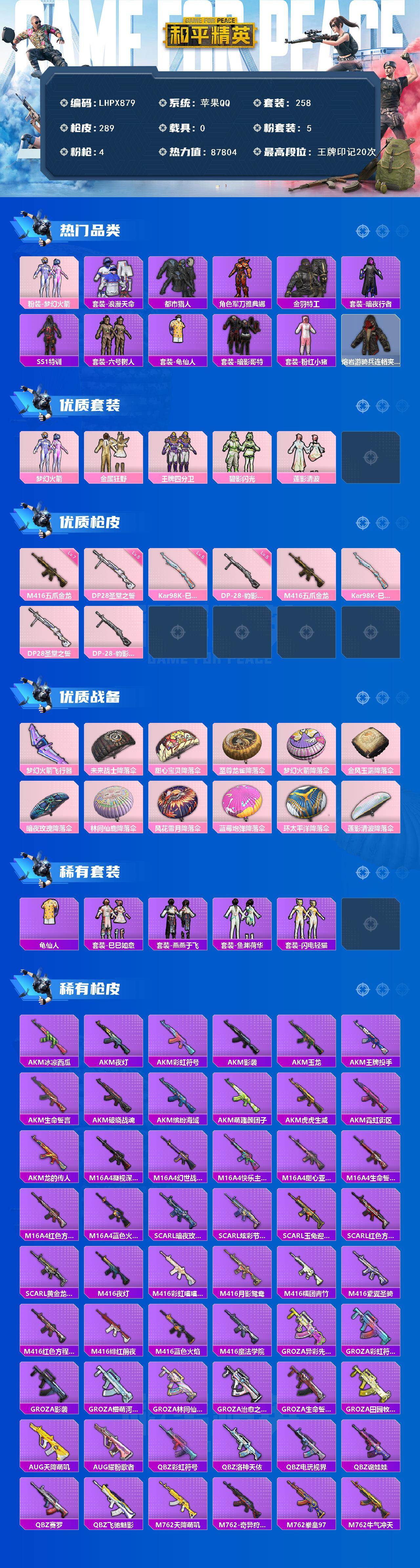 - [16599175]【特价出售/店主推荐】 苹果 手Q-10粉装-7特效枪-2载具-4粉色飞行器-64524热力值-10王牌印记-153套装-191枪皮 【热门品类】:套装-浪漫天命,套装-赤蝎幽灵,套装-都市猎人,套装-派对舞王,套装-深海小丑鱼,套装-小丑鱼,角色-2B战斗服款,套装-龟仙人,套装-暗影哥特 【粉色套装】:粉装-甜心巧克力,粉装-宝贝奶油派,粉装-蝶舞迷情,粉装-放客神游,粉装-彩虹甜喵,粉装-冰川粉黛,粉装-冰川幽秘,粉装-冰川红玫,粉装-第五大道,角色-千金淑猫 【粉色枪皮等级】:M16A4-垂柳戏鸭(五级),SCAR-L-锦绣绵绵(五级),M416-暖熊萌萌(七级),汤姆逊-冰川粉黛(七级),Kar98K-巳巳如意(五级),M417-第五大道(三级),DP-28-豹影疾电(五级) 【粉色载具】:阿斯顿马丁DBS(红),护世瑞兽 【粉色枪皮】:M16A4-垂柳戏鸭,SCAR-L-锦绣绵绵,M416-暖熊萌萌,汤姆逊-冰川粉黛,Kar98K-巳巳如意,M417-第五大道,DP-28-豹影疾电 【粉色飞行器】:冰川粉黛飞行器,沙丘之主天马,凤舞九天飞行器 【粉色降落伞】:甜心宝贝降落伞,春暖花开降落伞,暗夜玫瑰降落伞,洛神天依降落伞,暗星紫秘降落伞,橘柚倾心降落伞,垂柳戏鸭降落伞,彩虹甜喵降落伞,旋转彩虹降落伞,冰川粉黛降落伞,玉鳞金羽降落伞,闲梦青缨降落伞,圣堂之誓降落伞,墨龙九天降落伞,金丰海韵降落伞,千金淑猫降落伞,盛世惊鸿降落伞,鬼刀降落伞,冷漠罗丽降落伞,异瞳寒姬降落伞 【稀有套装】:套装-龟仙人,套装-巳巳如意,套装-雪国风尚,套装-雏菊兔兔,套装-萝兰蝴蝶,套装-小熊娃娃,套装-糖糖葫芦,套装-青团波波,套装-棉花软糖,角色-都市丽猫,角色-摩登魅猫,套装-燕燕于飞,套装-鱼渊荷华,角色-风玲,套装-晶灵使者,套装-晶辉守护,套装-朱霞炽焰 【稀有枪皮】:AKM-彩虹符号,AKM-影袭,AKM-春暖花开,AKM-破晓战魂,AKM-龙的传人,M16A4-幻世战舞者,M16A4-甜心亚梦,SCAR-L-炫彩节奏,SCAR-L-玉兔迎春,SCAR-L-红色方程式,M416-糯团青竹,M416-红色方程式,M416-蓝色火焰,GROZA-2B战斗服款,GROZA-影袭,GROZA-春暖花开,GROZA-田园牧歌,AUG-冰川粉黛,AUG-天降萌叽,AUG-甜