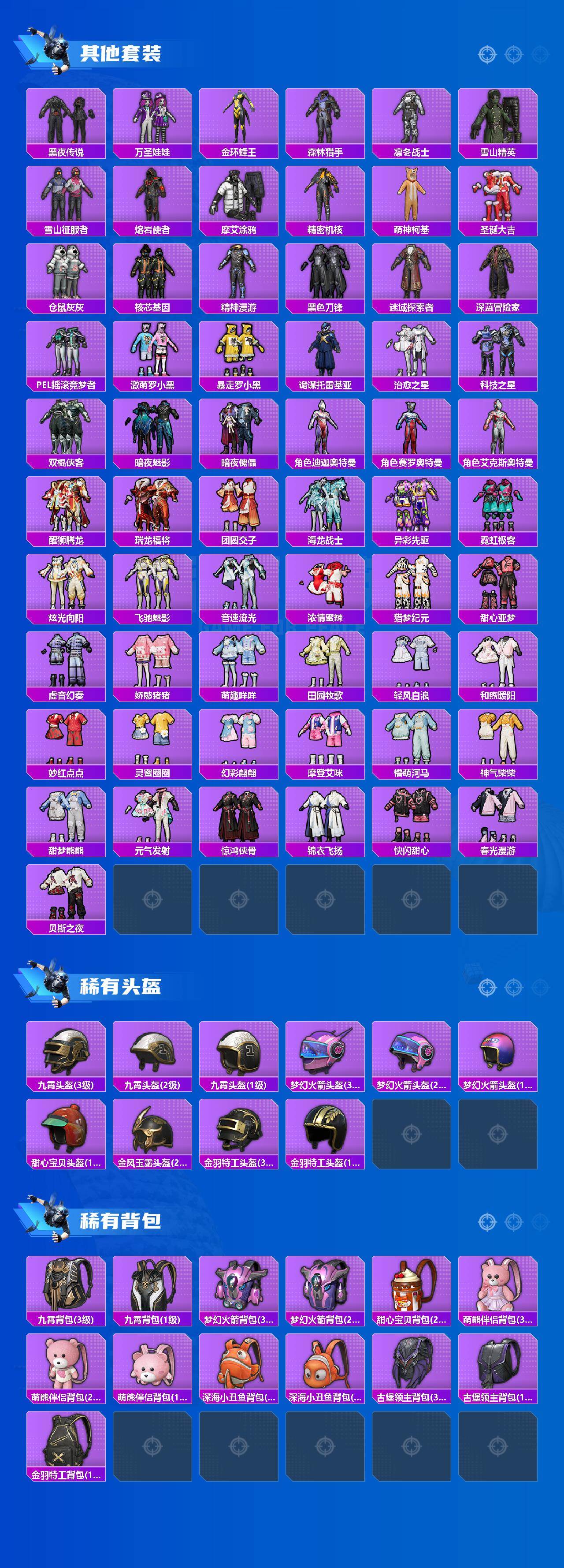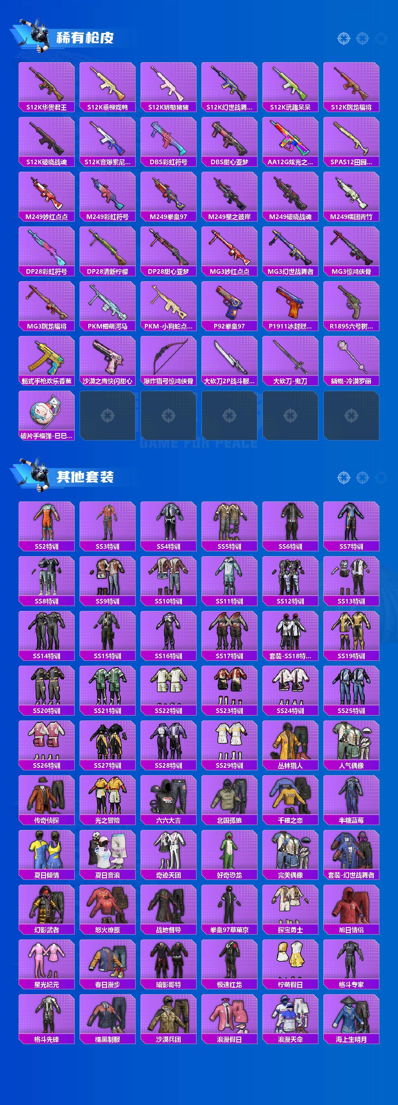 - [11686541]11粉装 5特效枪 2载具 10印记 可二次 可修改实名 女号 优质装备:宾利BATUR(极速紫),宾利欧陆GT敞篷(火焰橘),宝贝奶油派,天使彩虹糖,M416全功率超战,M416风花雪月,SCAR-L纯梦嫁纱,AKM绿萝繁花 热门装扮:飓风飞鹰,彩虹鹿灵,山涧鹿灵,沙场疾风,恐龙拽拽,寒光使者,音爆索尼克,超级赛亚人孙悟空,超级赛亚人贝吉塔,闲梦青缨,东方飞龙,暗夜魅影 稀有枪皮:DP-28-豹影疾电 五级特效枪:五级DP-28-豹影疾电,五级M416-全功率超战,五级SCAR-L-纯梦嫁纱,五级AKM-绿萝繁花 三级特效枪:三级M416-风花雪月 紫色装扮:田园牧歌,轻风白浪,和煦暖阳,SS22特训,莱茵河畔,孙悟空,SS23特训,幻彩翩翩,妙红点点,娇憨猪猪,酸甜橘柚,夏雨游龙,萌趣咩咩,SS21特训,绚烂繁星,熠彩粉晶,冷焰舞者,北国孤狼,午夜朋克,SS33特训套装,青涩时光,SS20特训,SS15特训,时空追击者,暴风机械师,SS16特训,爆裂葡萄,萌趣颜团子,特种颜团子,猎梦纪元,飞驰魅影,音速流光,极速竞梦,SS19特训,覆海蛟龙,甜心亚梦,虚音幻奏,电音精灵,瑞龙福将,团圆交子,醒狮腾龙,SS17特训,极乐追光,异彩先驱,SS18特训,都市漫游者,都市魅力,野性山猫,野性战心,野性战魂,长空猛禽,雷霆特警,霓虹极客,霓虹街区,青春校园,迎春赐吉,缤纷果语,耀眼新星,花园小羊咩,蓝色守护者,虎虎生威吉莉,血色贵族,西部风情,风行保卫者,飞行日记,龙腾端午,骑行爱好者,魅力单车,鹤鸣,麻辣教官,黑色伏地魔,龙的传人,龟仙人,柠萌假日,格斗先锋,棕色飞行服,水手小飞鸭,沙漠探路者,活力之魂,涂山之恋,滨海假日,夏日音浪,夜莺强袭者,幻世战舞者,怒火燎原,探宝勇士,湖蓝色名流,滨海厨神,白熊同盟,破蛋小黄鸡,神秘领域,福星高照,空岛之星,空投萌叽,突袭者,甜蜜熊情侣,王牌教练,牛气冲天,灼焰舞者,炫蓝之夏,燃烧卡路里,牛气满满,猛禽,特战装甲,短笛,玉兔迎春,竞技名士,惊鸿侠骨,贝吉塔,究极悟饭,神气柴柴,懵萌河马,SS24特训(SS24特训套装),SS25特训,锦衣飞扬,粉红小猪,菲菲,SS27特训,星河浪客,华灯初上,日照花林,沙丘之歌,SS26特训,春光漫游,快闪甜心,薄荷蓝莓,耀粉歌者,绯格组合,萌黄之夏,水银刺客,光之冒险,海上生明月