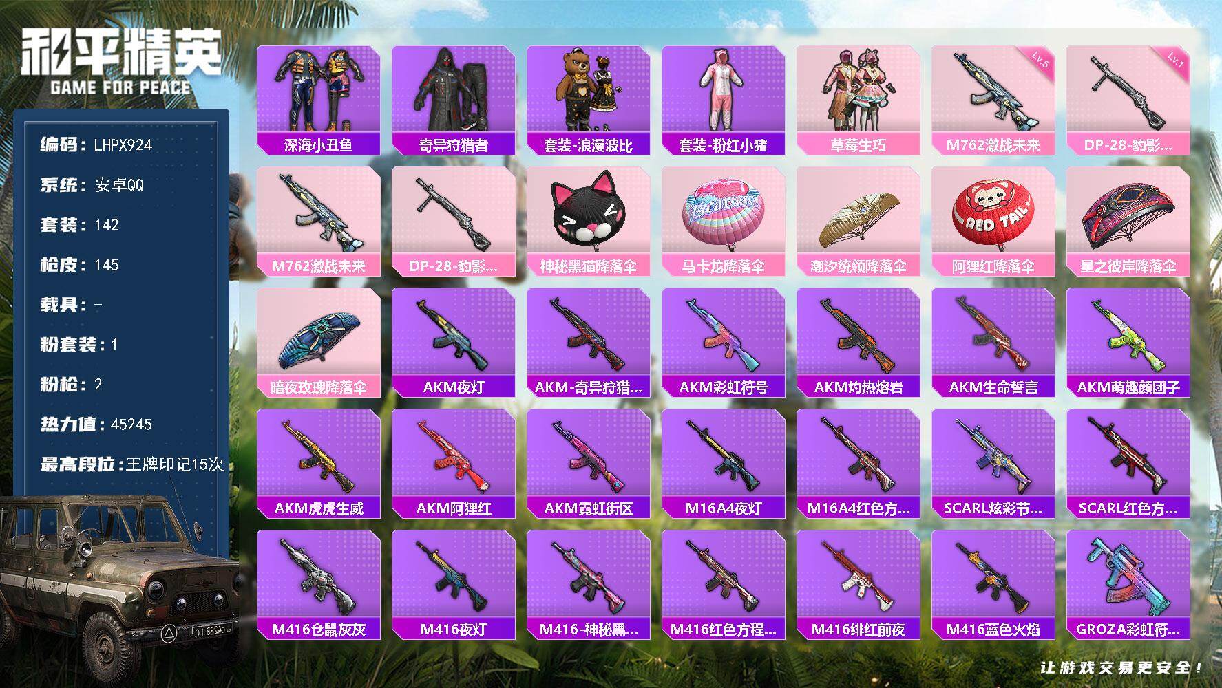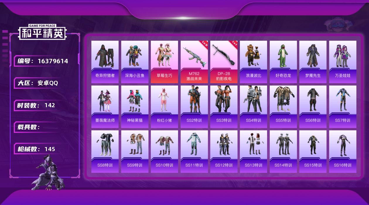 [16379614]【特价出售/店主推荐】安卓 手Q-1粉装-2特效枪-0载具-0粉色飞行器-45245热力值-15王牌印记-142套装-145枪皮【热门品类】:套装-深海小丑鱼,套装-奇异狩猎者,套装-浪漫波比,套装-粉红小猪【粉色套装】:粉装-草莓生巧【粉色枪皮等级】:M762-激战未来(五级),DP-28-豹影疾电(一级)【粉色枪皮】:M762-激战未来,DP-28-豹影疾电