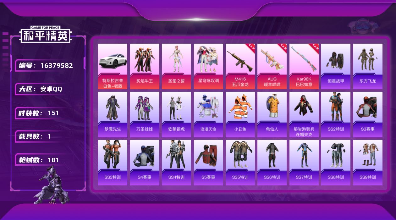 [16379582]【店主推荐捡漏号!可直接换绑】安卓 手Q-3粉装-3特效枪-1载具-1粉色飞行器-53294热力值-20王牌印记-151套装-181枪皮【热门品类】:套装-浪漫天命,套装-小丑鱼,套装-SS1特训,套装-龟仙人,熔岩游骑兵连帽夹克【粉色套装】:粉装-炙焰牛王,角色-圣堂之誓,粉装-星穹咏叹调【粉色枪皮等级】:M416-五爪金龙(七级),AUG-暖羊咩咩(五级),Kar98K-巳巳如意(五级)【粉色载具】:特斯拉Model X(珍珠白)【粉色枪皮】:M416-五爪金龙,AUG-暖羊咩咩,Kar98K-巳巳如意