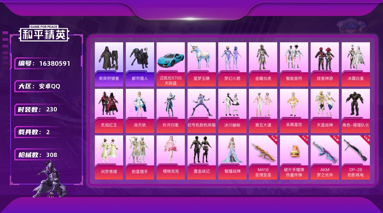 [16380591]安卓 手Q-19粉装-13特效枪-2载具-10粉色飞行器-106076热力值-14王牌印记-230套装-308枪皮 【热门品类】:粉装-梦幻火箭,套装-浪漫天命,套装-都市猎人,套装-奇异狩猎者,套装-暗夜行者,套装-AG战队服,套装-SS1特训,套装-龟仙人,套装-暗影哥特,套装-摄影小熊猫,套装-红红火火 【粉色套装】:粉装-金曜白虎,粉装-梦幻火箭,粉装-智能音符,粉装-放客神游,粉装-冰霜白皇,粉装-炙焰红王,角色-洛天依,粉装-吟月归客,角色-初号机款机体服,粉装-冰川幽秘,粉装-第五大道,角色-呆萌星弥,粉装-天星战神,角色-猩猩队长,粉装-闲梦青缨,粉装-射星猎手,角色-樱桃泡泡,粉装-墨金战记,角色-智耀战神 【粉色枪皮等级】:AKM-梦之光华(六级),M416-心之恋语(四级),M416-风花雪月(一级),M416-至情至圣(九级),AUG-星梦奇缘(三级),AUG-暖羊咩咩(五级),Kar98K-巳巳如意(五级),Kar98K-圣域龙灵(三级),Mk14-甜梦熊击(五级),DP-28-豹影疾电(五级),MG3-洛神天依(五级),MG-36-沧焰双生(四级),破片手榴弹-热量炸弹(七级) 【粉色载具】:迈凯伦570S(天际蓝),星梦玉骢 【粉色枪皮】:AKM-梦之光华,M416-心之恋语,M416-风花雪月,M416-至情至圣,AUG-星梦奇缘,AUG-暖羊咩咩,Kar98K-巳巳如意,Kar98K-圣域龙灵,Mk14-甜梦熊击,DP-28-豹影疾电,MG3-洛神天依,MG-36-沧焰双生,破片手榴弹-热量炸弹 【粉色飞行器】:绝对恒星飞行器,千面幻镜飞行器,黄族统领飞行器,拂晓神骑飞行器,深渊漩涡飞行器,曦光华影飞行器,脆鲨七海飞行器,万象金身飞行器,灵珠游龙飞行器 【粉色降落伞】:绝对恒星降落伞,梦幻火箭降落伞,香水柠檬降落伞,星之彼岸降落伞,烈焰拳霸降落伞,齐天大圣降落伞,洛神天依降落伞,红伞翩翩降落伞,环太平洋降落伞,旋转彩虹降落伞,星际浪客降落伞,歌者泠鸢降落伞,第五大道降落伞,天星战神降落伞,璀璨巨星降落伞,未来歌姬降落伞,镜域双华降落伞,星梦奇缘降落伞,宇宙意志降落伞,临安公主降落伞,樱桃泡泡降落伞,戏水时光降落伞,湮灭星辰降落伞,炫彩糖果降落伞 【稀有套装】:套装-龟仙人,套装-巳巳如意,套装-超能元气,角色-超感刻度,套装-荧光