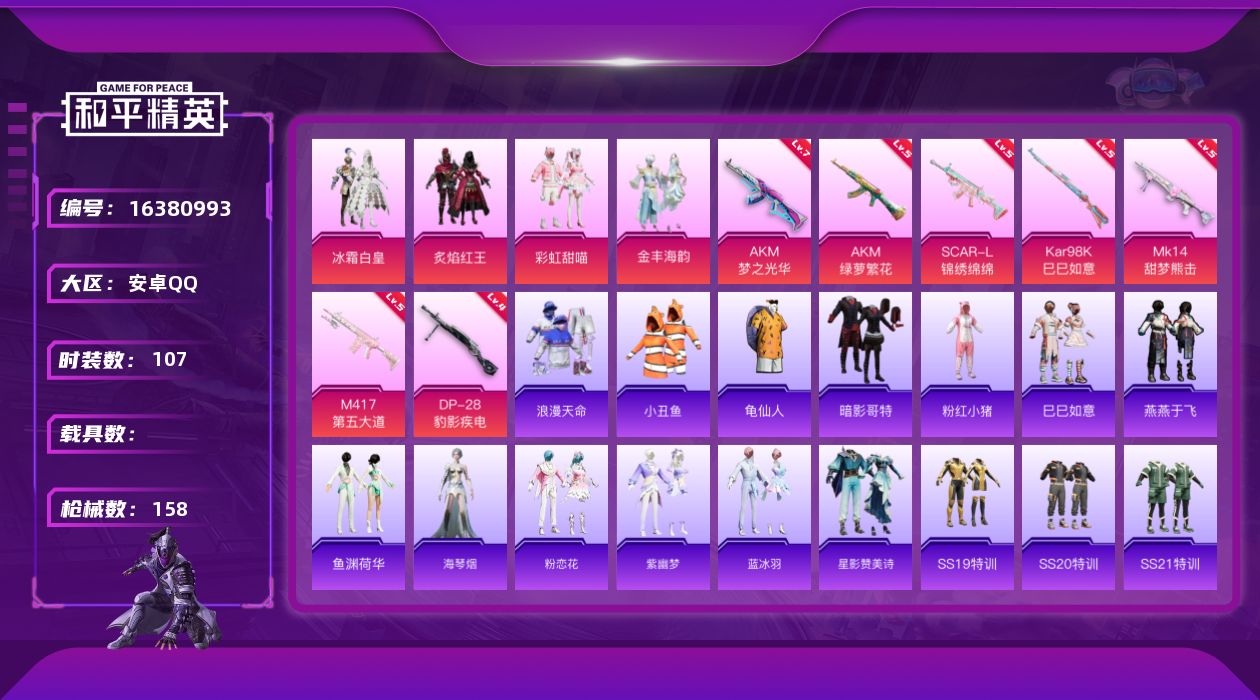 [16380993]安卓 手Q-4粉装-7特效枪-0载具-1粉色飞行器-44317热力值-8王牌印记-107套装-158枪皮