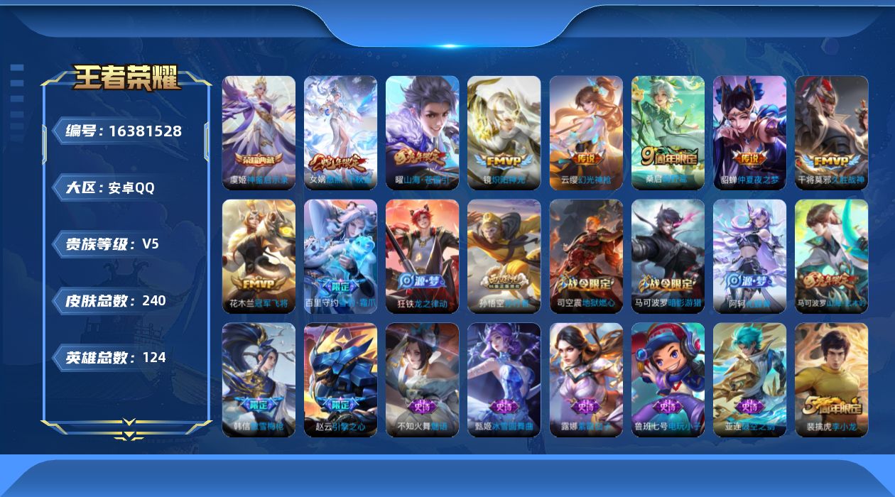 [16381528]安卓Q-V5-至尊星耀III段位-124英雄-240皮肤-1典藏-0珍品无双-0无双-0珍品传说-8传说-71史诗