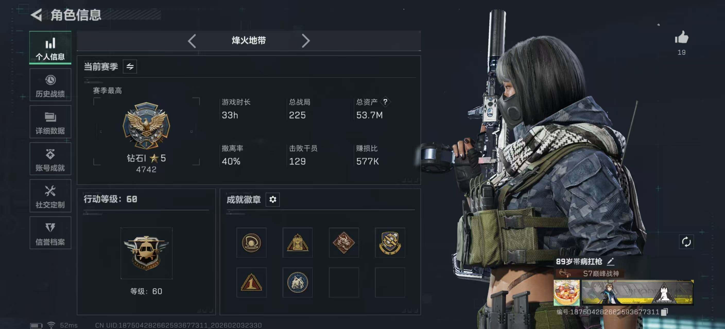 [16383478]53m总资产-978k哈伏币-60烽火等级-钻石-3战场等级-无军衔