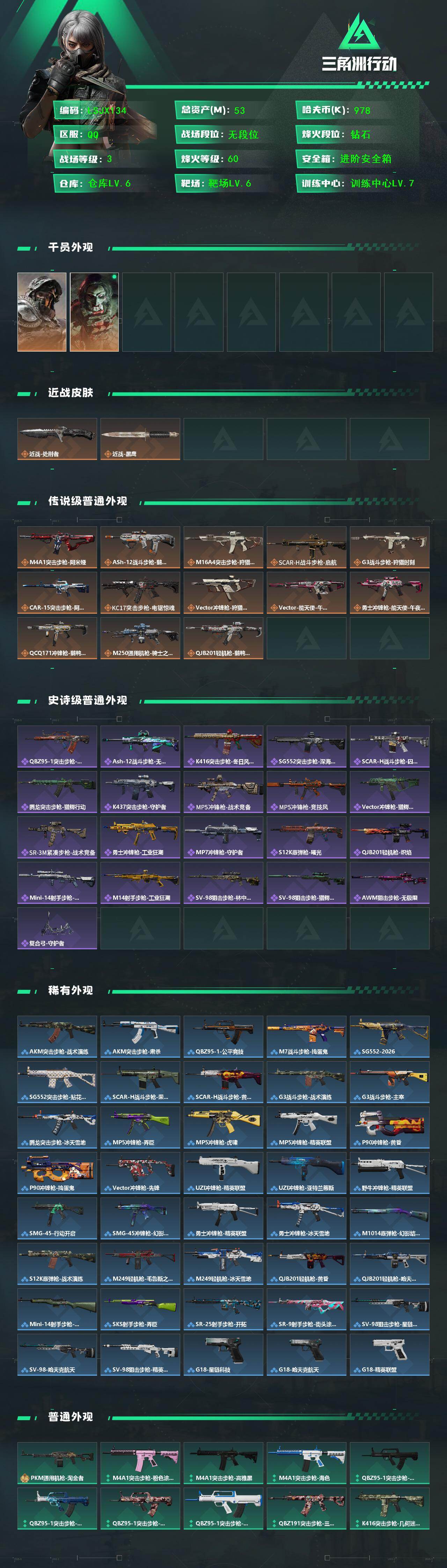 [16383478]53m总资产-978k哈伏币-60烽火等级-钻石-3战场等级-无军衔 【干员外观】:深蓝-不破誓约,红狼-电锯惊魂 【近战皮肤】:近战-处刑者,近战-黑鹰 【传说外观】:M4A1突击步枪-阿米娅,ASh-12战斗步枪-鹅鸭杀,M16A4突击步枪-狩猎时刻,SCAR-H战斗步枪-启航,G3战斗步枪-狩猎时刻,CAR-15突击步枪-阿米娅,KC17突击步枪-电锯惊魂,Vector冲锋枪-狩猎时刻,Vector冲锋枪-能天使-午夜邮差,勇士冲锋枪-能天使-午夜邮差,QCQ171冲锋枪-鹅鸭杀,M250通用机枪-骑士之心,QJB201轻机枪-鹅鸭杀 【史诗外观】:QBZ95-1突击步枪-曙光,ASh-12战斗步枪-无极限,K416突击步枪-冬日风情,SG552突击步枪-深海恐惧,SCAR-H战斗步枪-囚徒,腾龙突击步枪-猎鳄行动,K437突击步枪-守护者,MP5冲锋枪-战术竞备,MP5冲锋枪-竞技风,Vector冲锋枪-猎鳄行动,SR-3M紧凑突击步枪-战术竞备,勇士冲锋枪-工业狂潮,MP7冲锋枪-守护者,S12K霰弹枪-曙光,QJB201轻机枪-炽焰,Mini-14射手步枪-守护者,M14射手步枪-工业狂潮,SV-98狙击步枪-林中猎手,SV-98狙击步枪-猎鳄行动,AWM狙击步枪-无极限,复合弓-守护者 【稀有外观】:AKM突击步枪-战术演练,AKM突击步枪-肃杀,QBZ95-1突击步枪-公平竞技,M7战斗步枪-捣蛋鬼,SG552突击步枪-2026,SG552突击步枪-贴花艺术,SCAR-H战斗步枪-荣耀列队,SCAR-H战斗步枪-黄昏,G3战斗步枪-战术演练,G3战斗步枪-主宰,腾龙突击步枪-冰天雪地,MP5冲锋枪-弄臣,MP5冲锋枪-虎啸,MP5冲锋枪-精英联盟,P90冲锋枪-黄昏,P90冲锋枪-捣蛋鬼,Vector冲锋枪-先锋,UZI冲锋枪-精英联盟,UZI冲锋枪-亚特兰蒂斯,野牛冲锋枪-精英联盟,SMG-45-行动开启,SMG-45冲锋枪-幻影结构,勇士冲锋枪-精英联盟,勇士冲锋枪-冰天雪地,M1014霰弹枪-幻影结构,S12K霰弹枪-战术演练,M249轻机枪-毛鲁斯之力,M249轻机枪-冰天雪地,QJB201轻机枪-黄昏,QJB201轻机枪-哈夫克卫队,Mini-14射手步枪-荣耀列队,SKS射手步枪-弄臣,SR-25射手步枪-开拓,SR-9射手步枪-街头涂